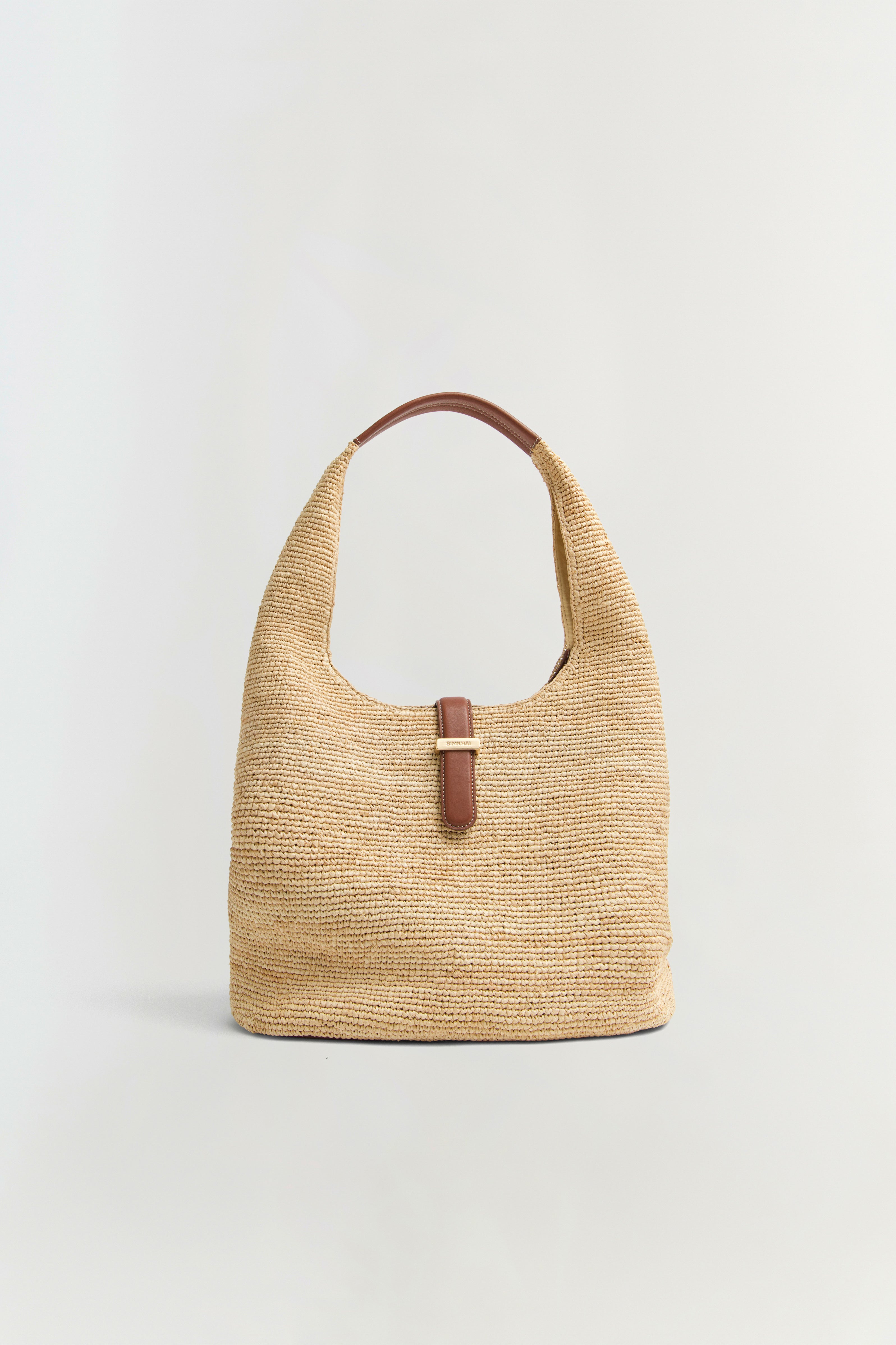 The Khai Raffia Hobo Bag in Natural Sequoia. A hobo bag constructed from woven raffia with a top handle that easily swings over the shoulder with a leather buckle detail.