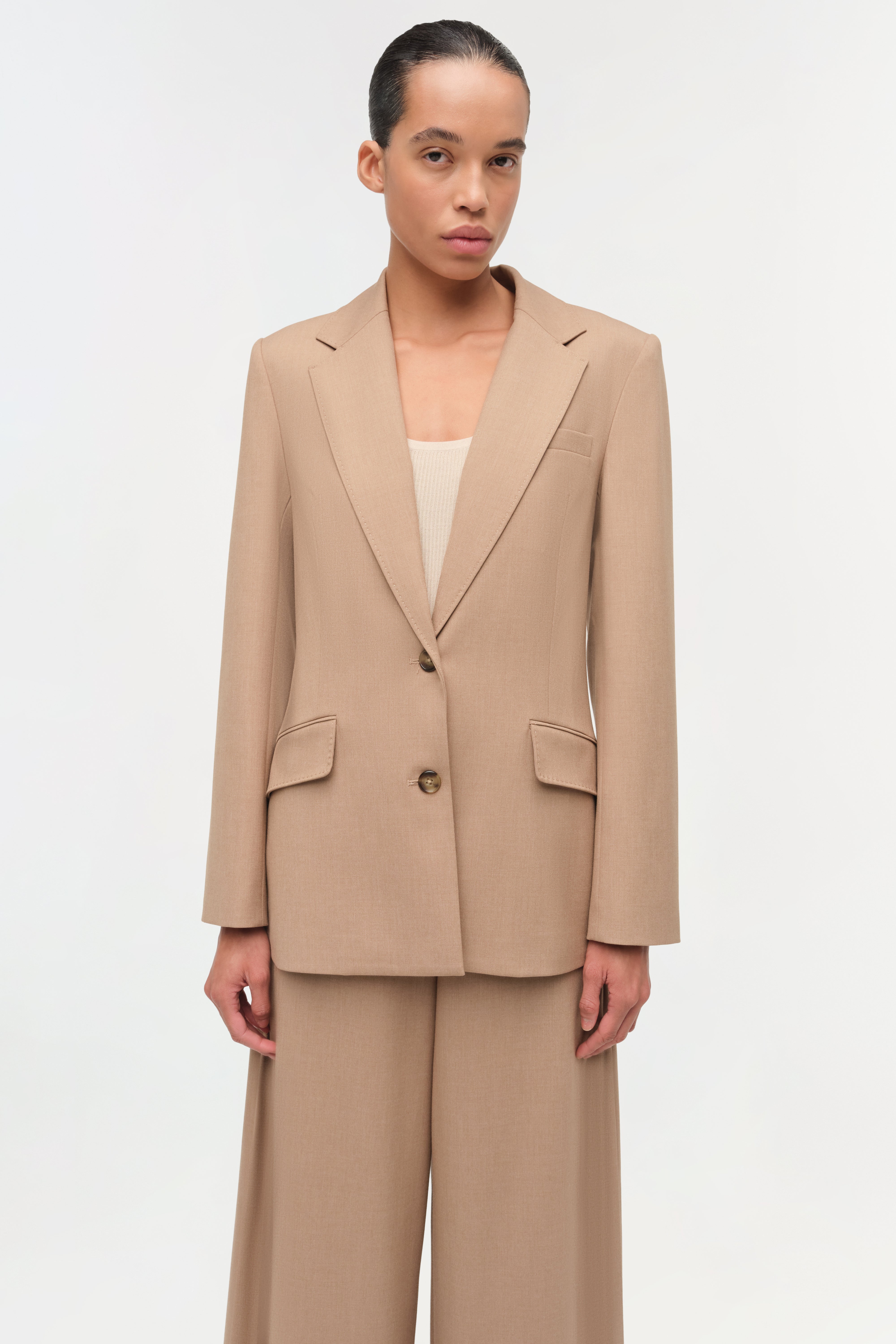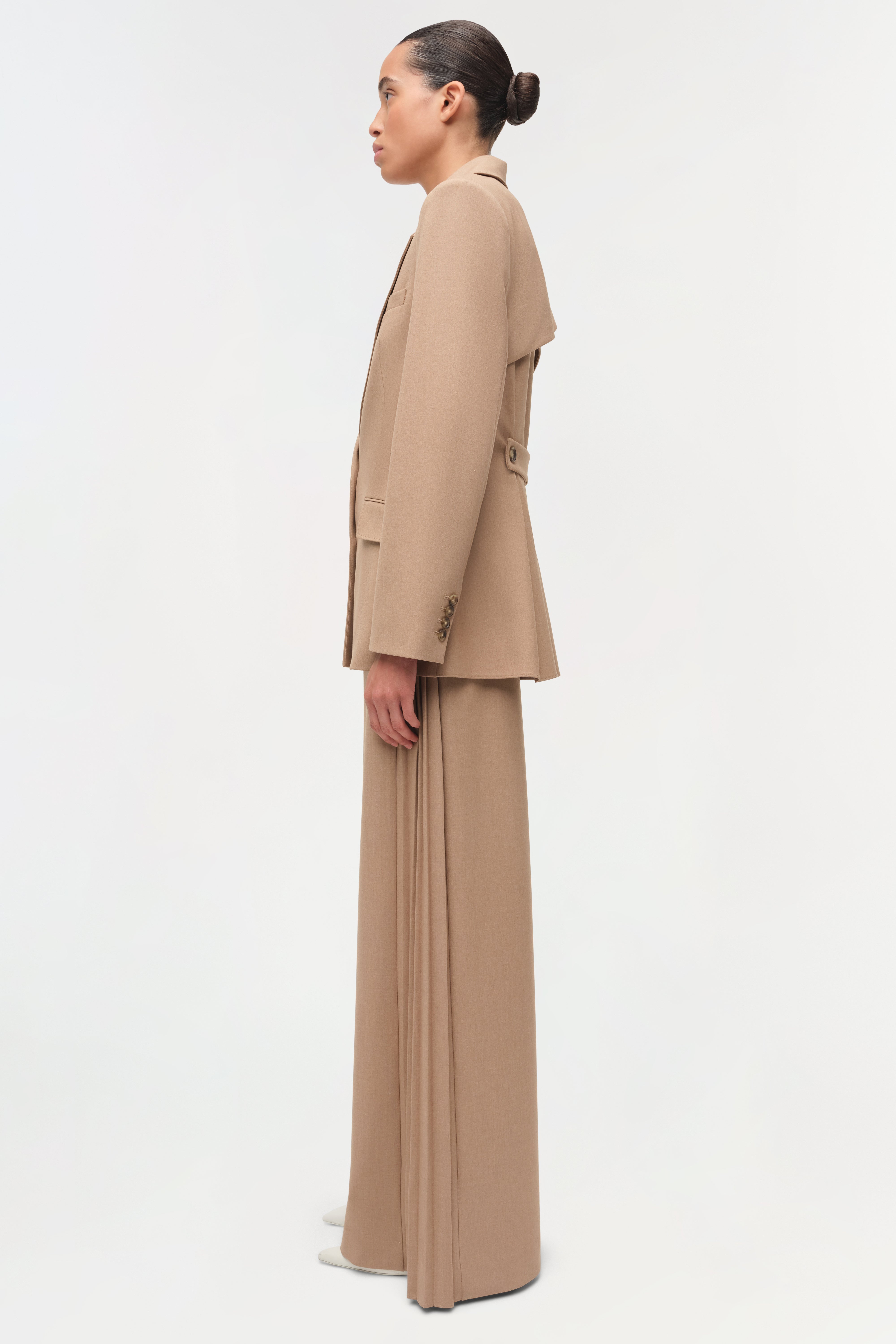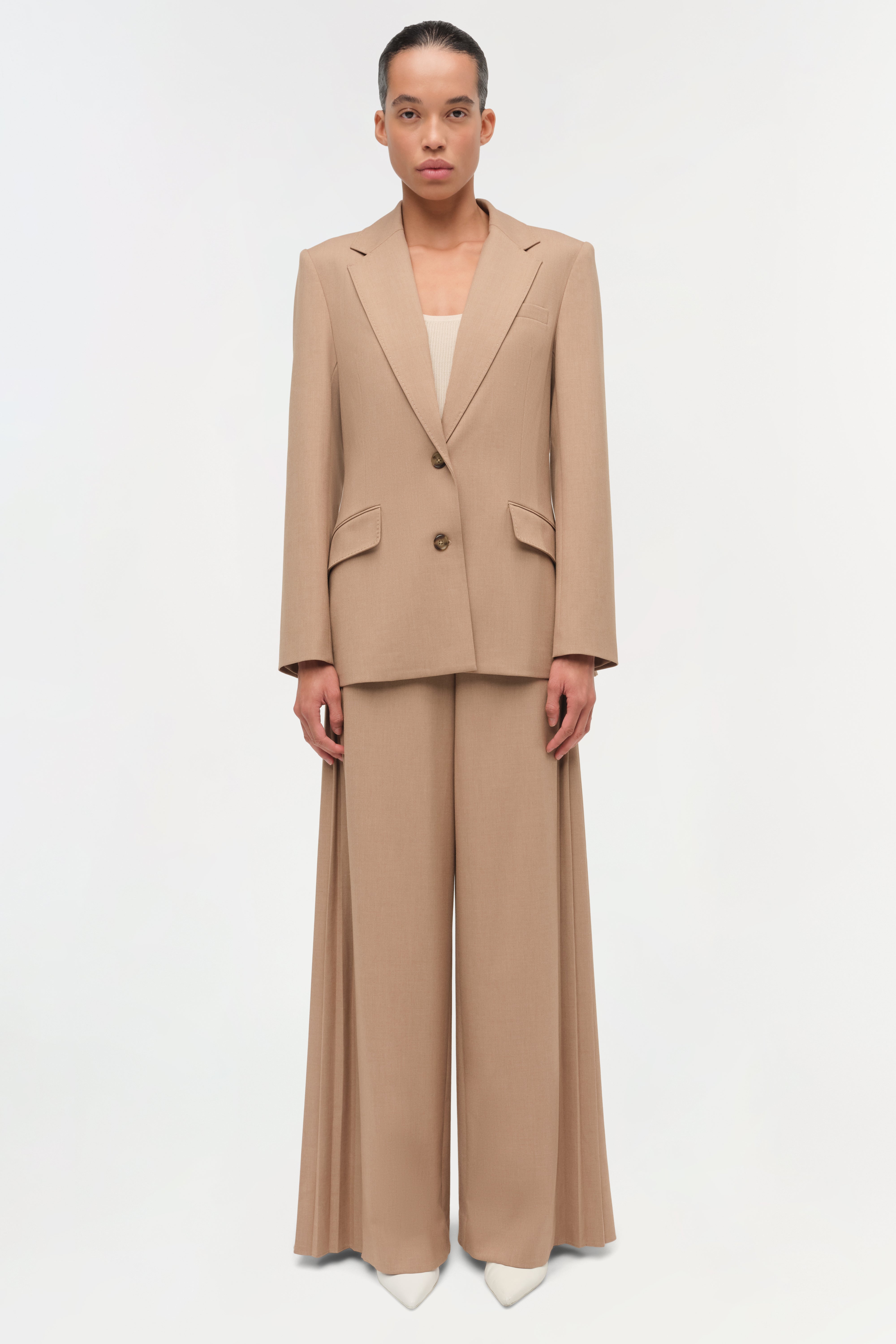 Constructed from refined suiting, this blazer is tailored with clean lines and structured shoulders for a confident silhouette. A pleated back detail introduces subtle movement to the precision of its form. A modern tailoring statement, defined by ease and polish.