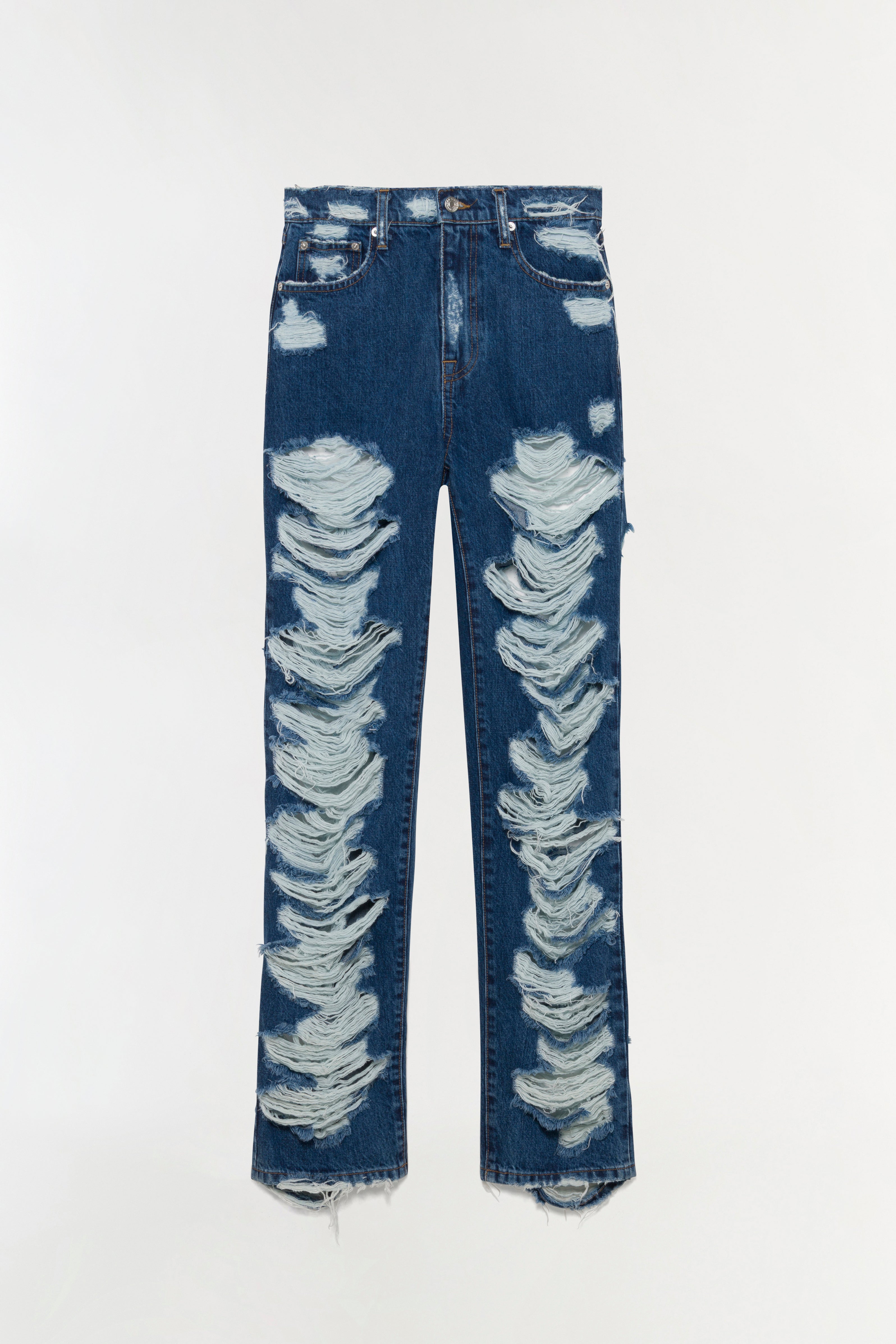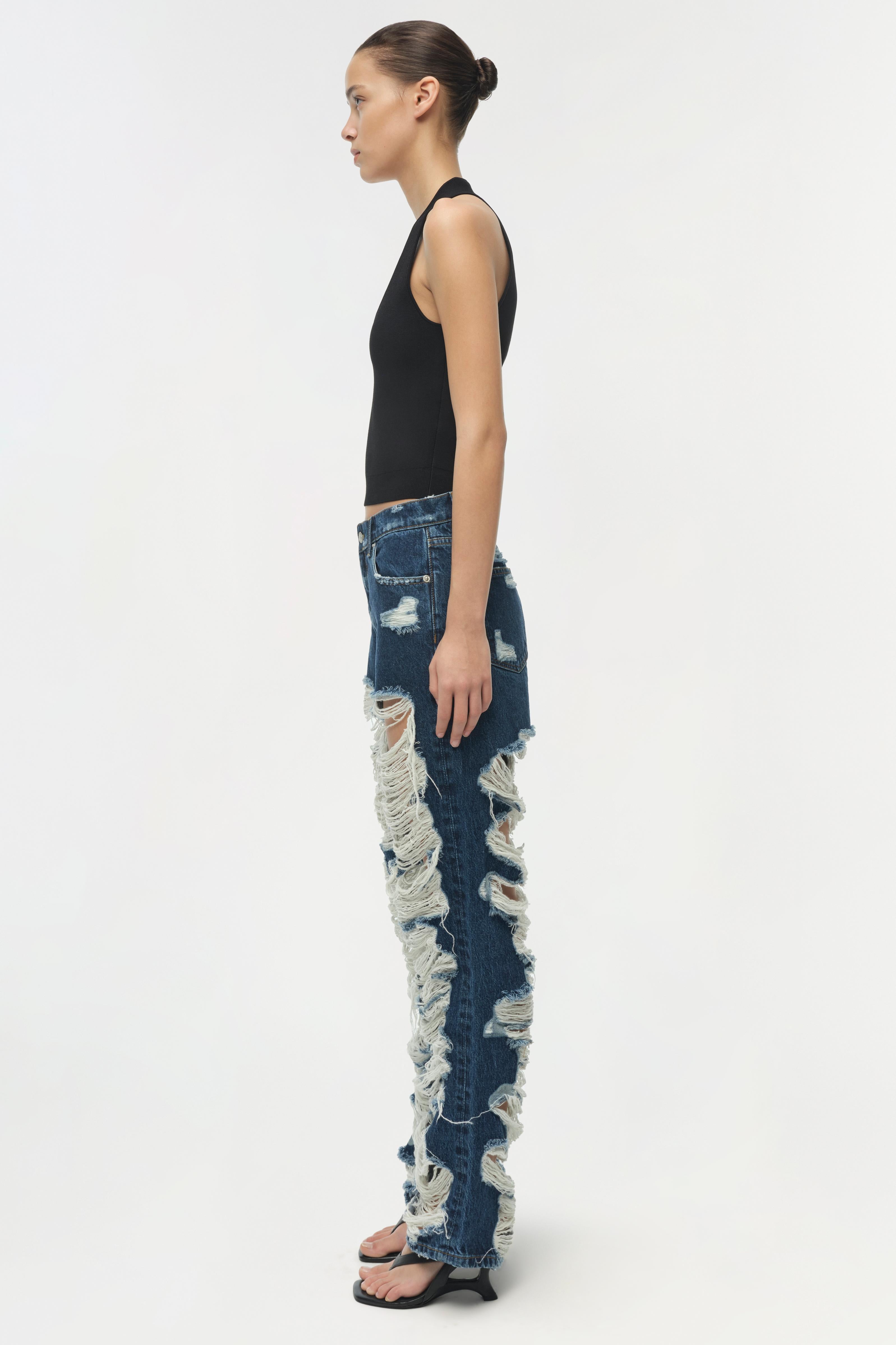 High-rise denim with a straight leg. Deconstructed with extensive shredded detailing from hip to hem, and frayed threads. Finished with a classic five-pocket layout, button fastening, and zip fly.