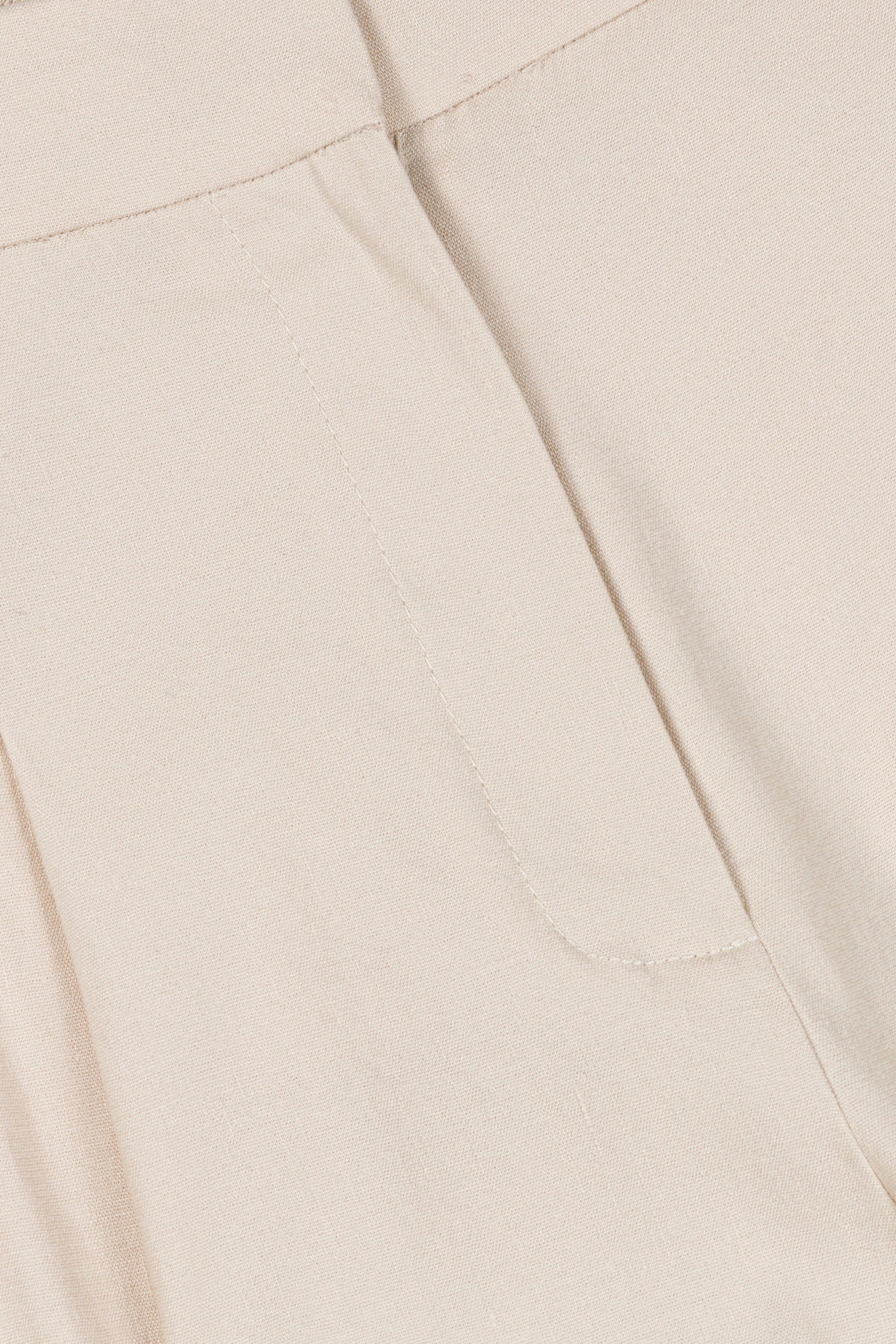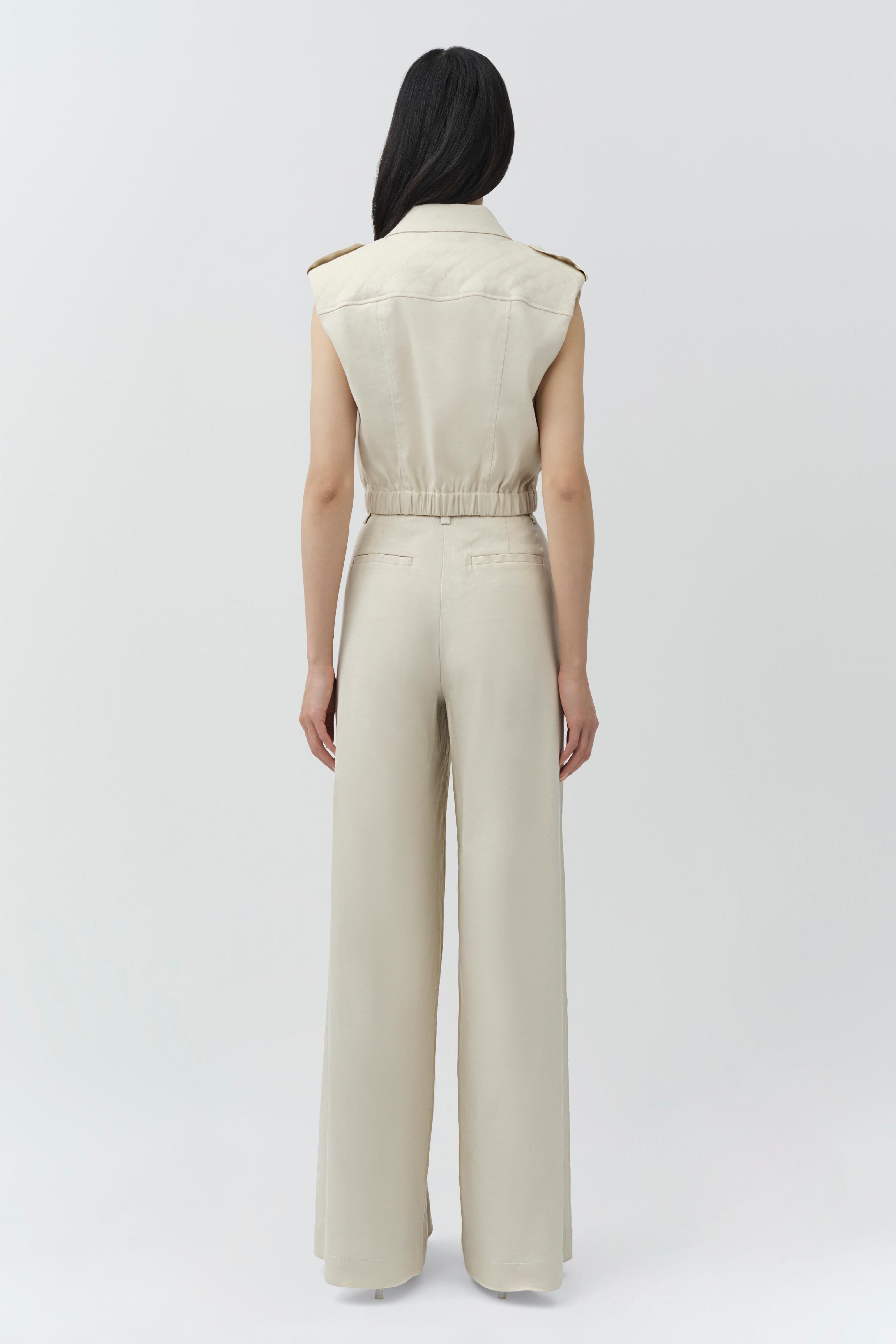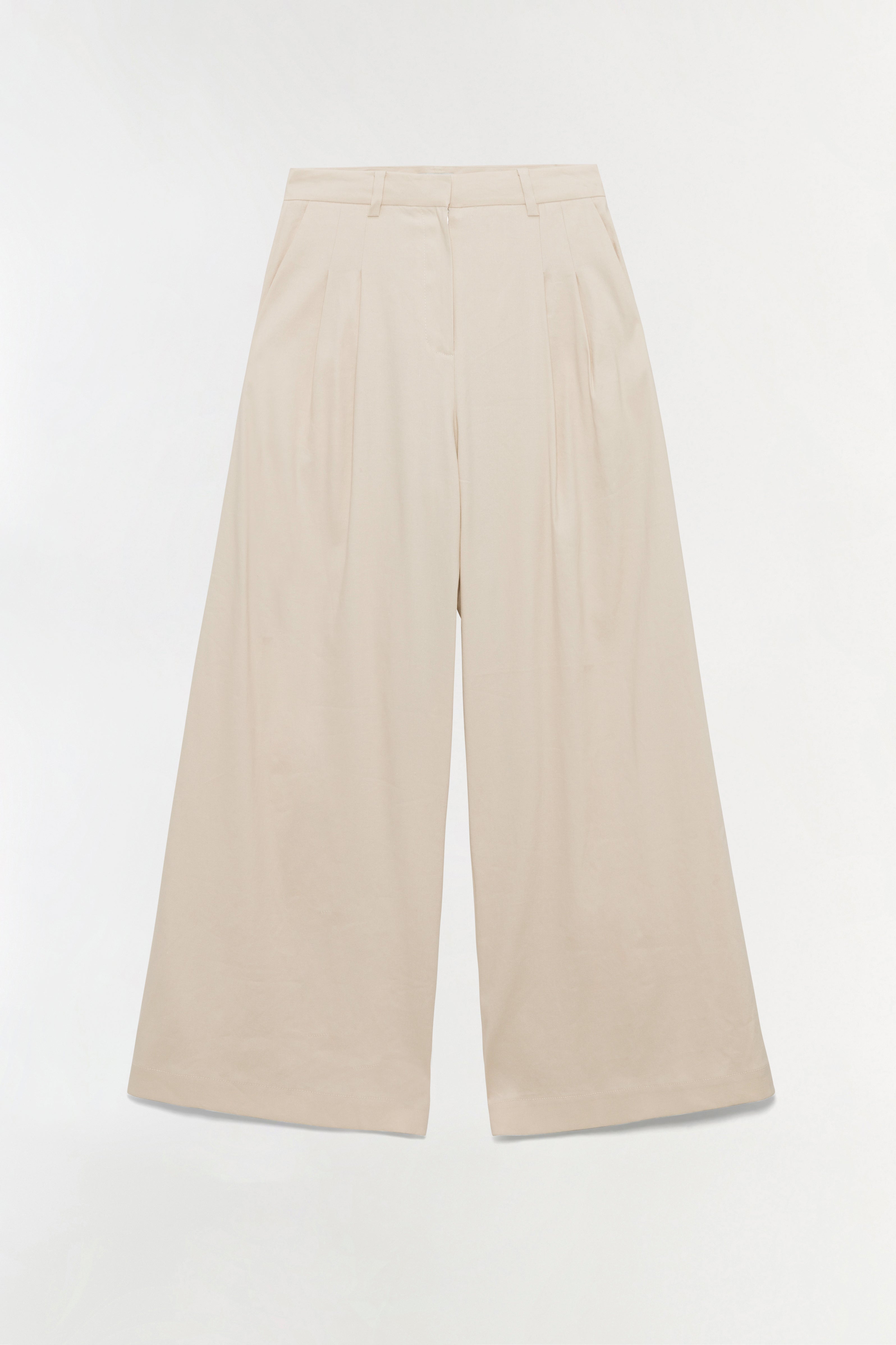 The Ramsey Linen Wide Leg Pant in Sand. Crafted from linen, this palazzo pant features a high-rise waist and full length wide leg for an elongated, fluid shape. Double front pleats add tailored structure with an effortless drape.