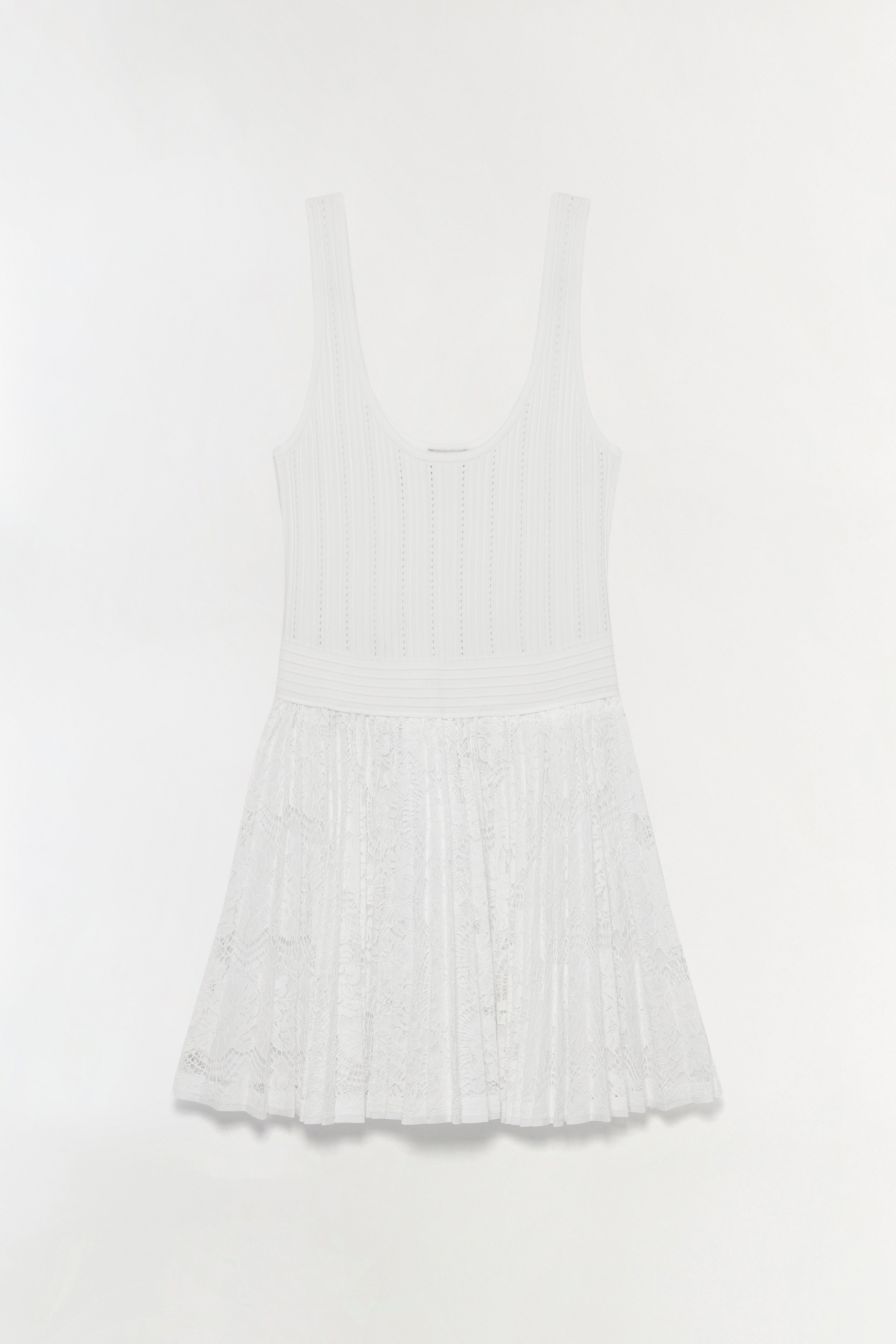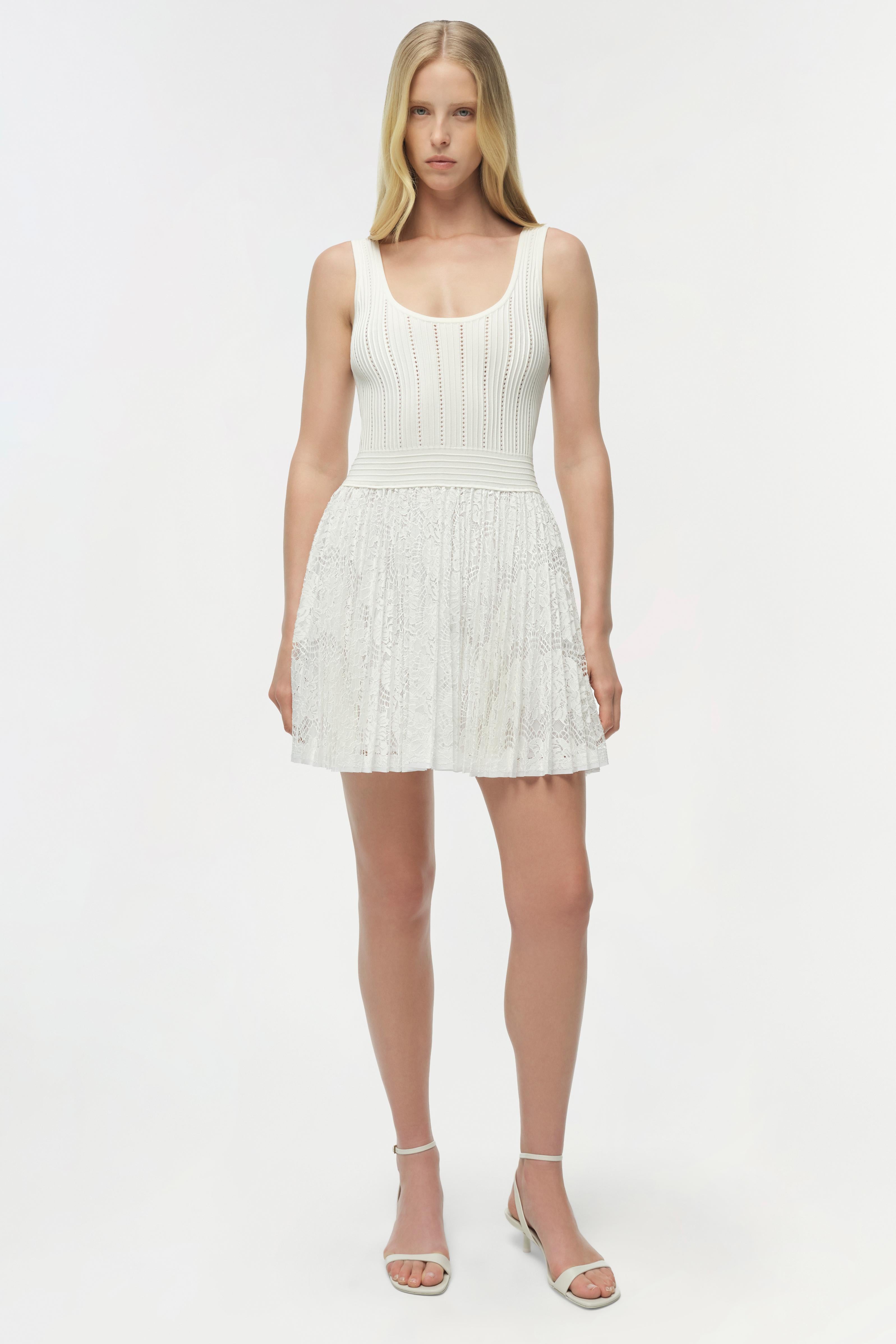 The Ellis Knit Lace Mini Dress in Ivory. This pointelle knit mini dress features a flattering seamed bodice, softly defined waist and a pleated lace skirt.