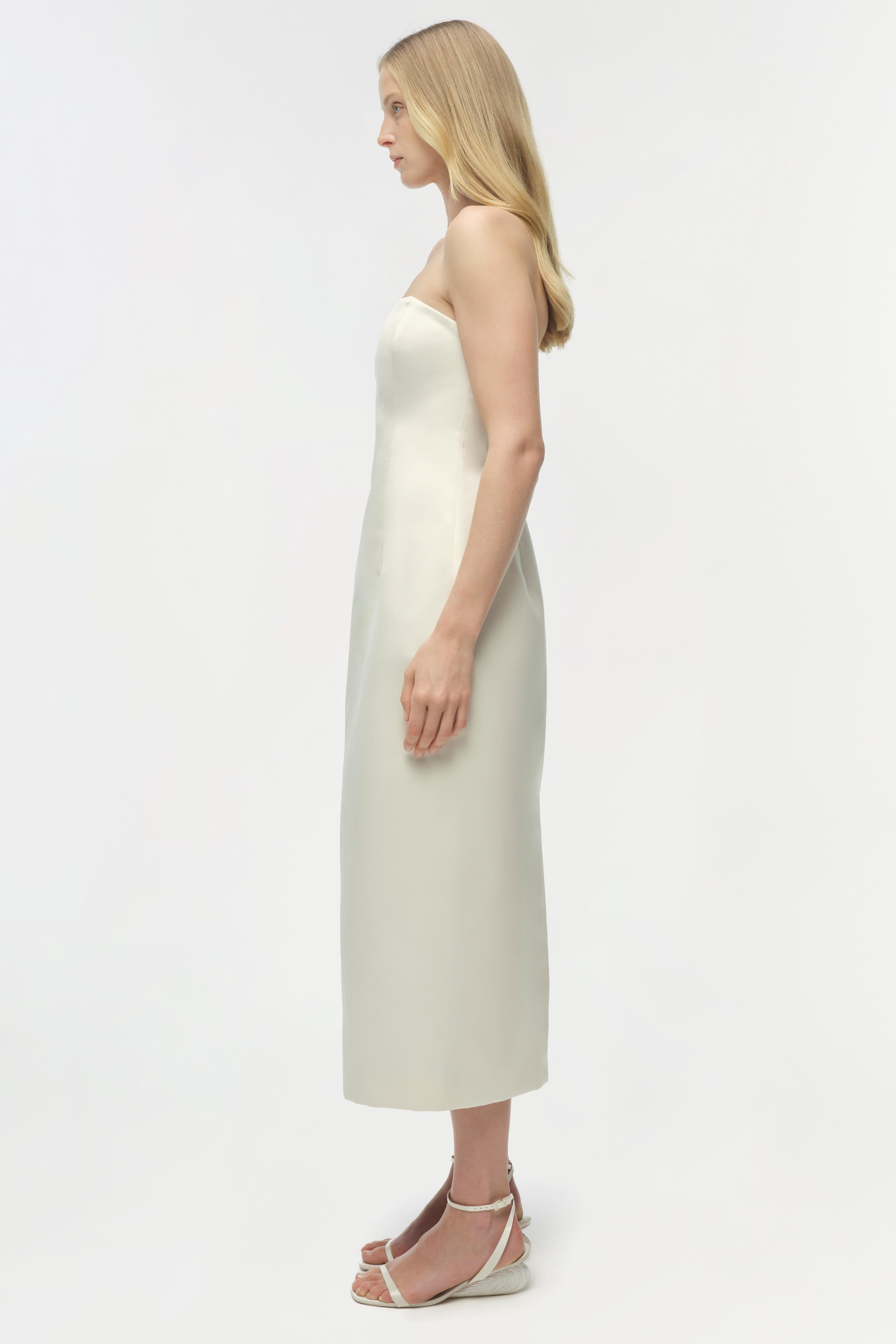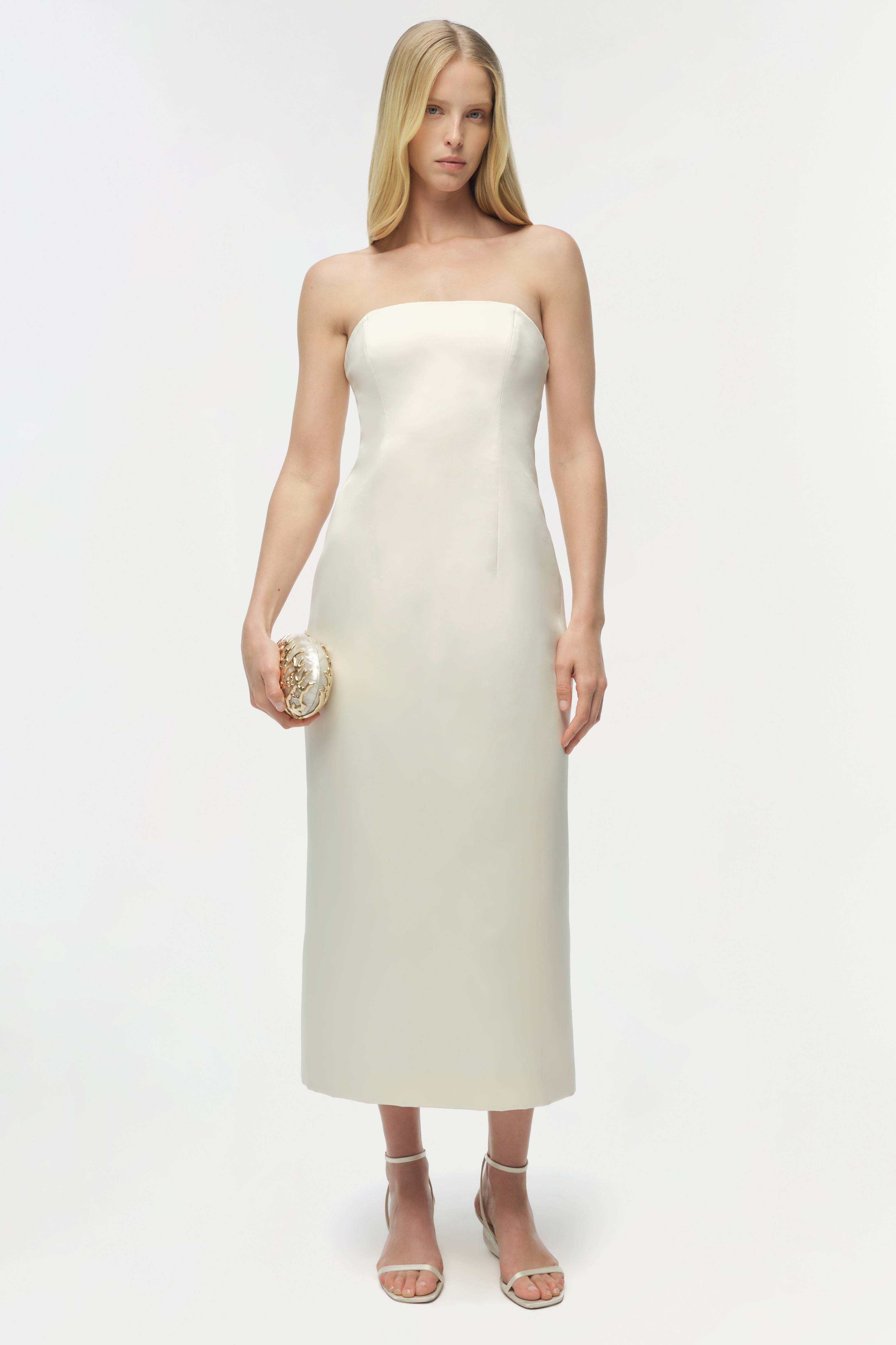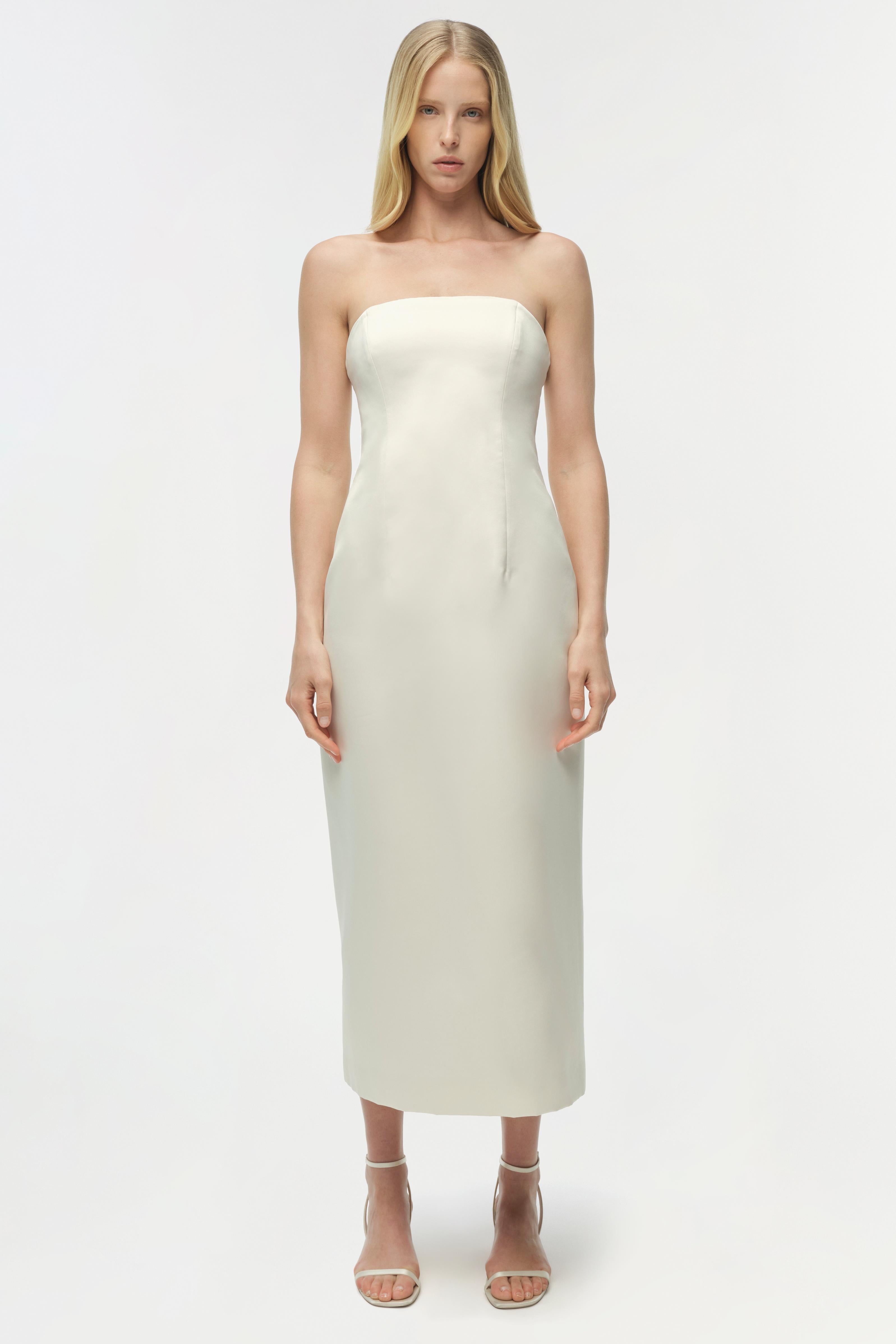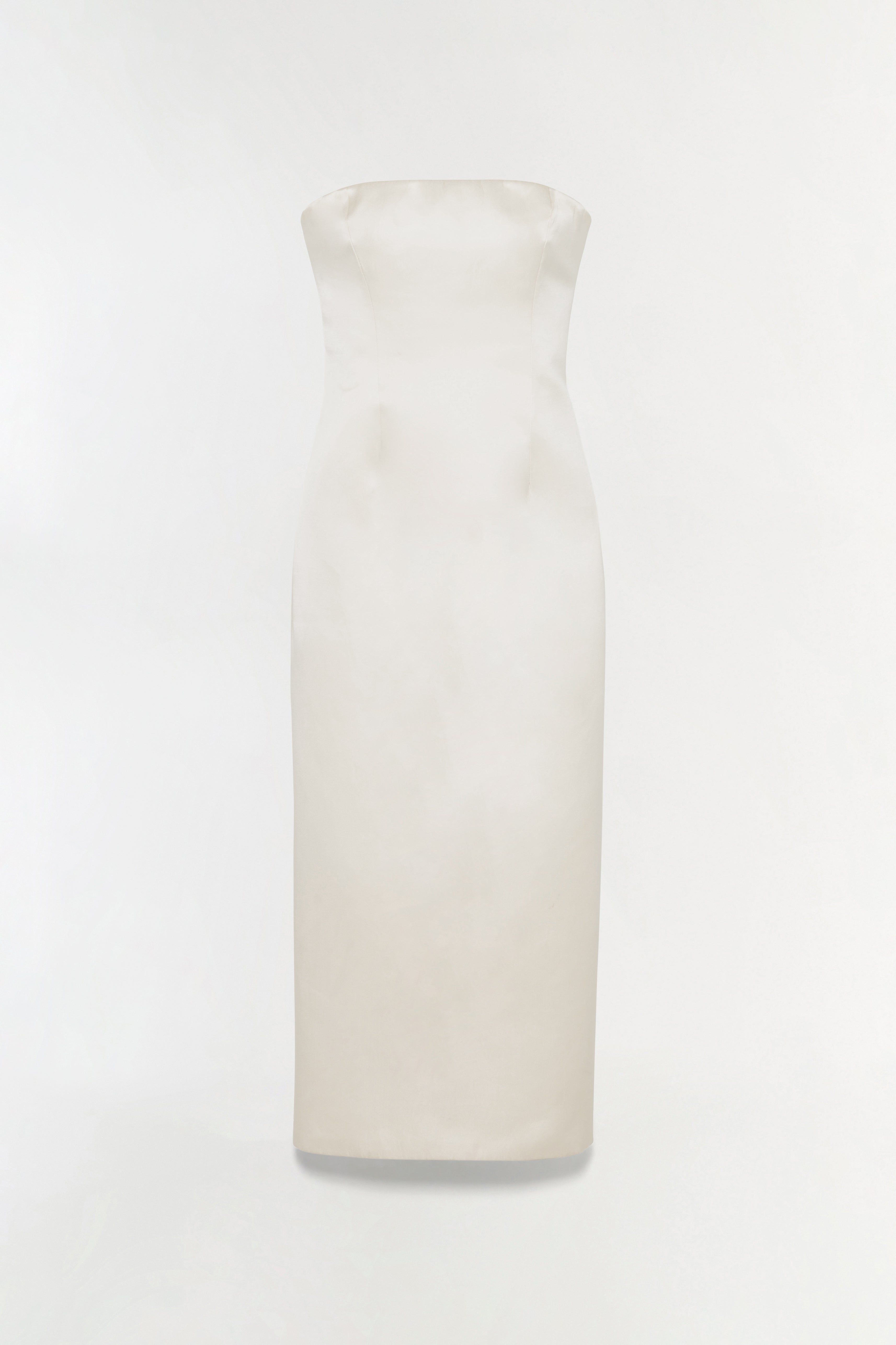 The Enid Satin Bustier Midi Dress in Porcelain. Sleek yet structured, this midi dress is crafted from lustrous satin with a subtle sheen. The tailored bustier bodice and clean lines define a flattering silhouette, offering a modern, elevated finish.