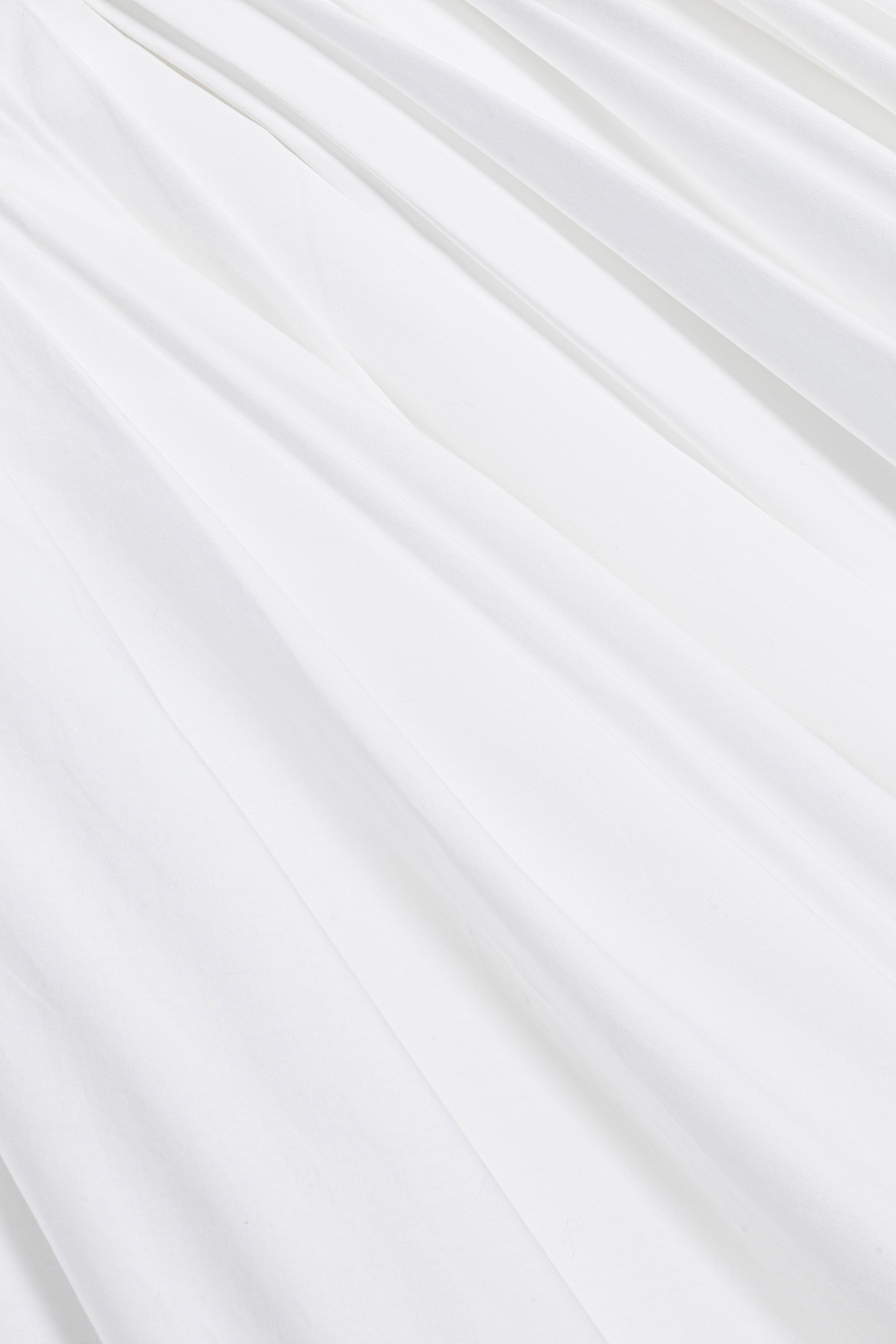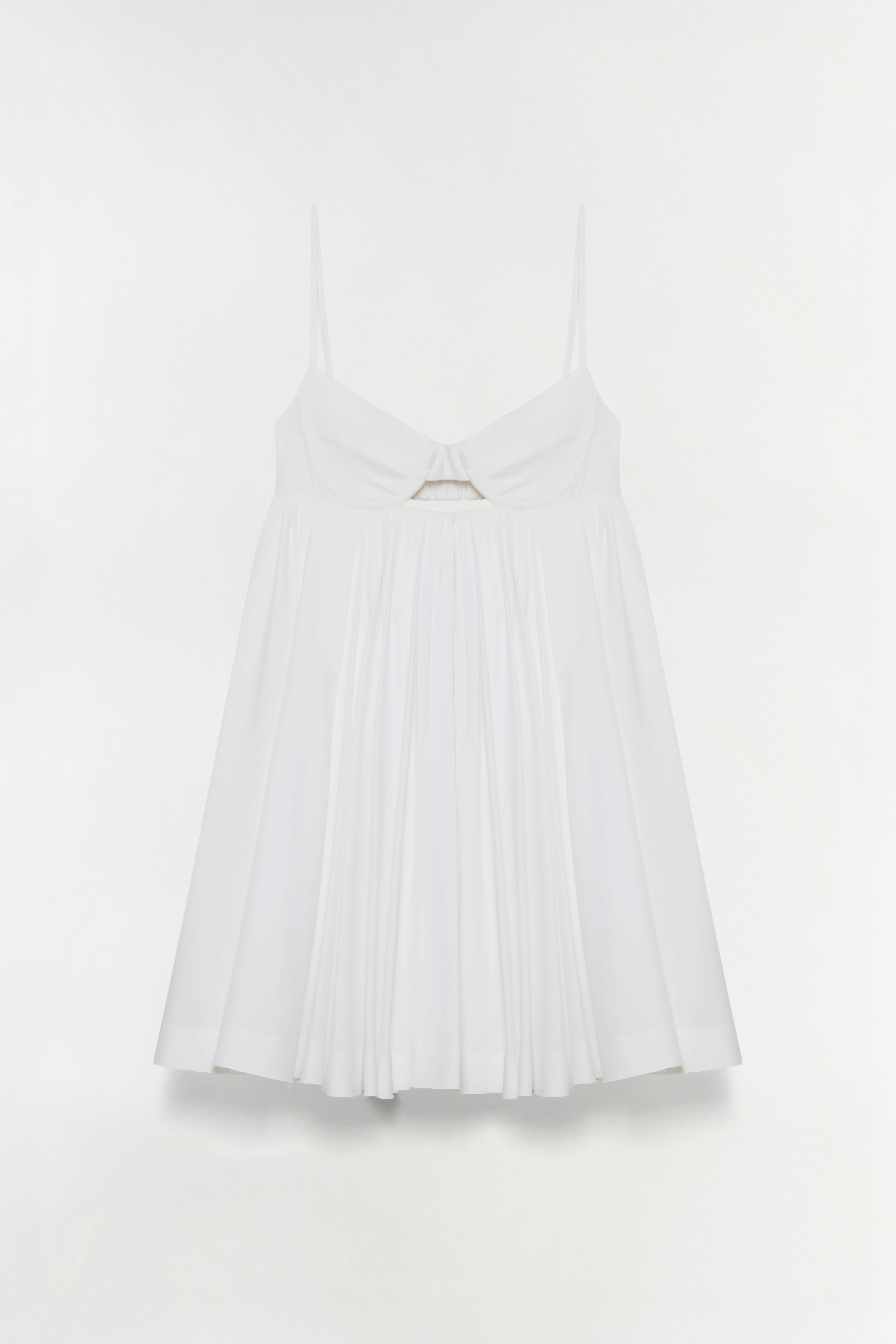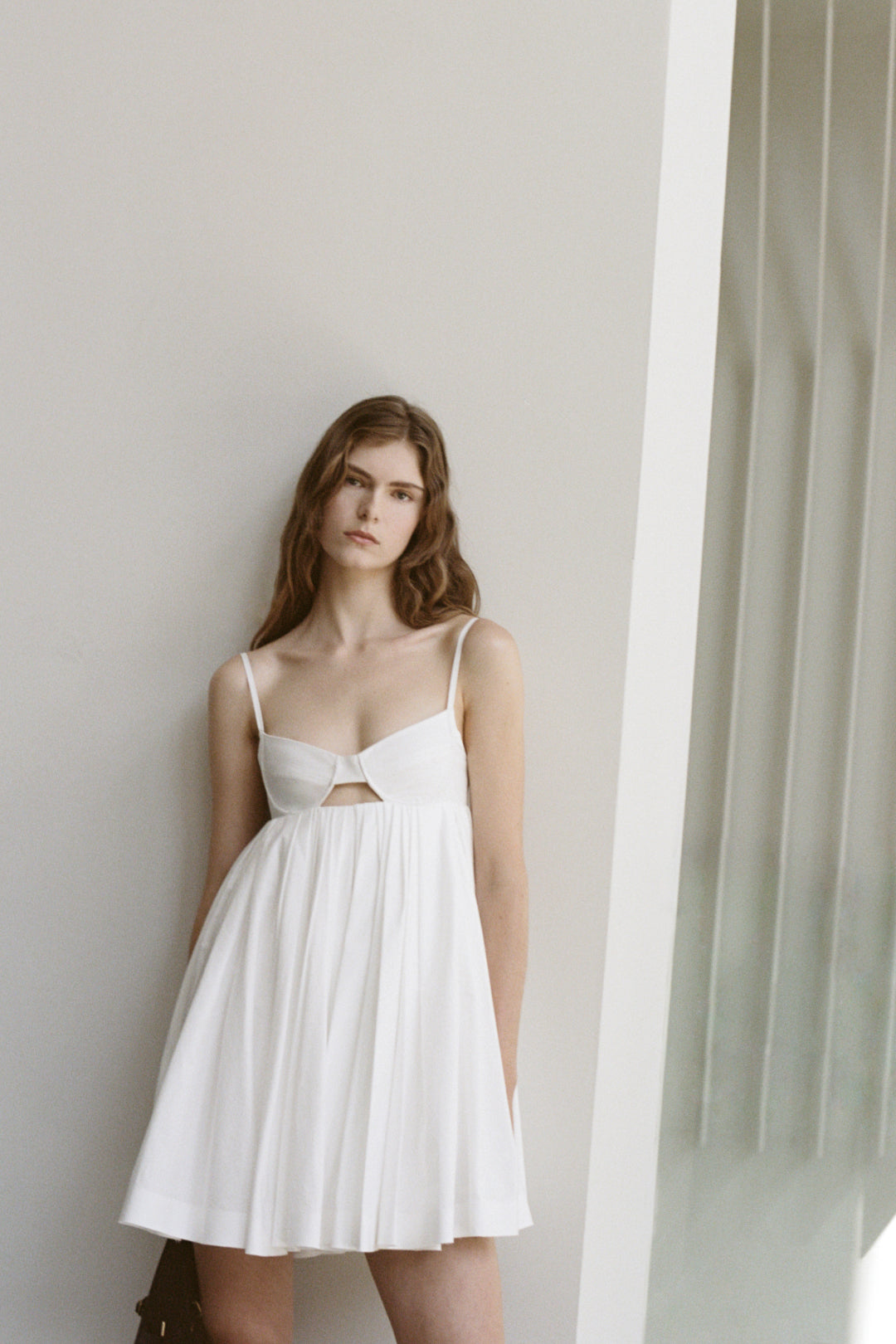 The Janie Cotton Mini Dress in White. This mini dress, cut in cotton poplin, features a playful, flared silhouette for effortless movement. The center-front cutout sits beneath a structured, bralette-inspired neckline for a modern, sculpted finish.