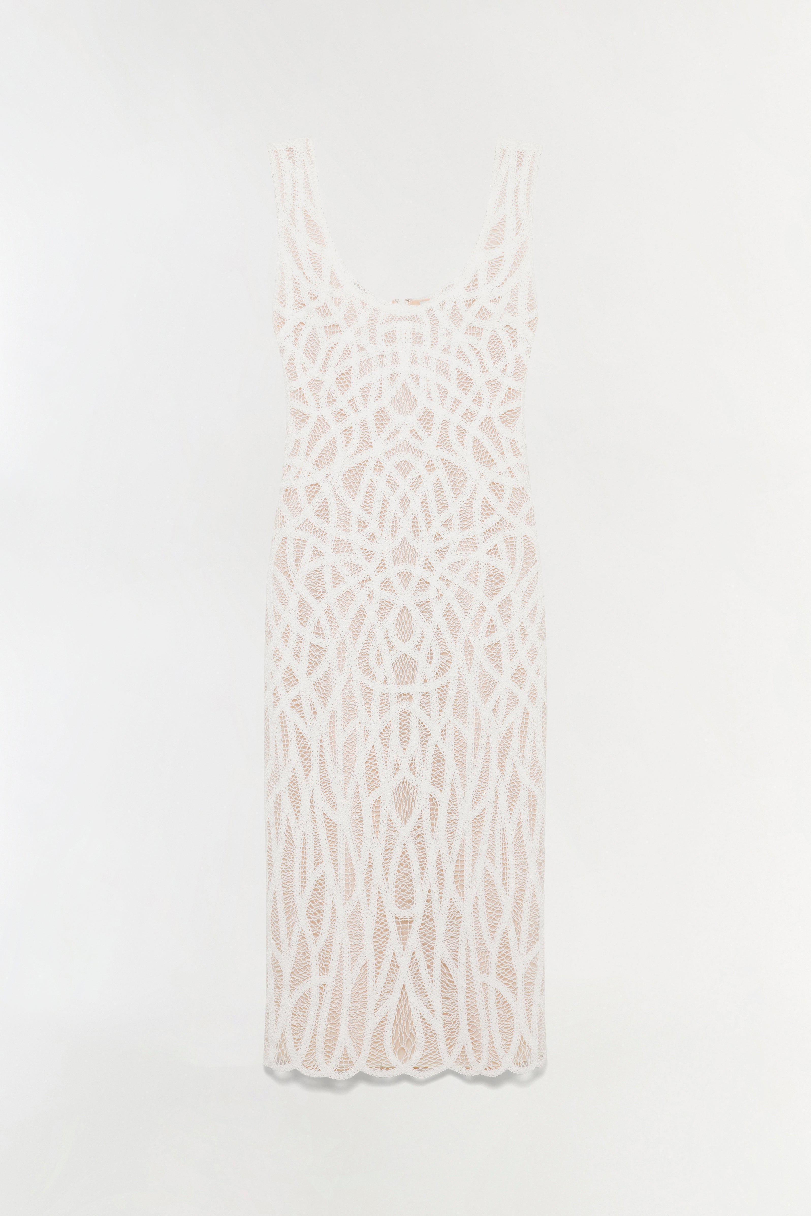 The Leonora Macrame Midi Dress in White. Crafted in botanical macramé embroidery, this strapless midi dress balances structure with sleek elegance. Soft scalloped edges frame the neckline, while precise detailing defines the silhouette for a meticulously constructed design.