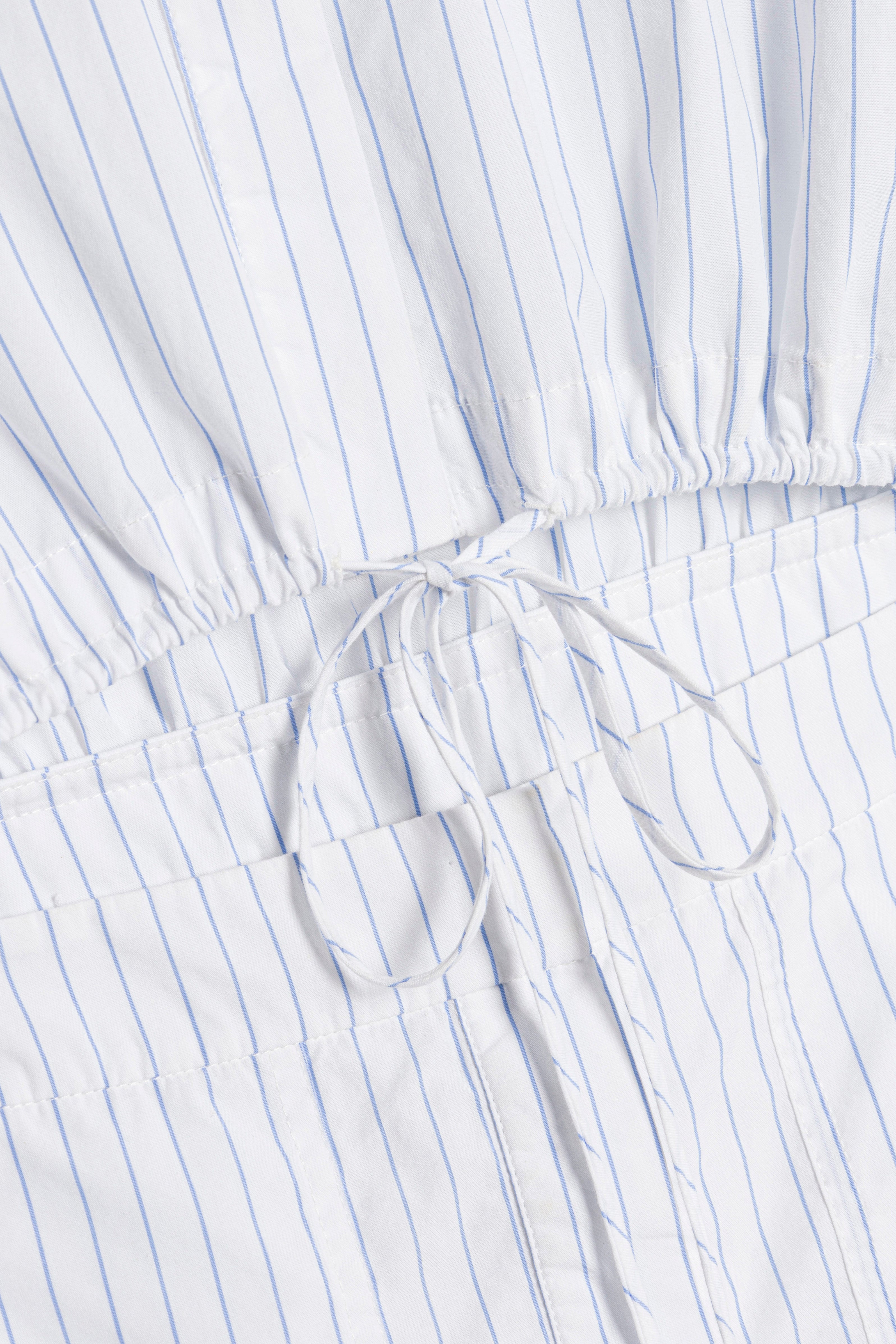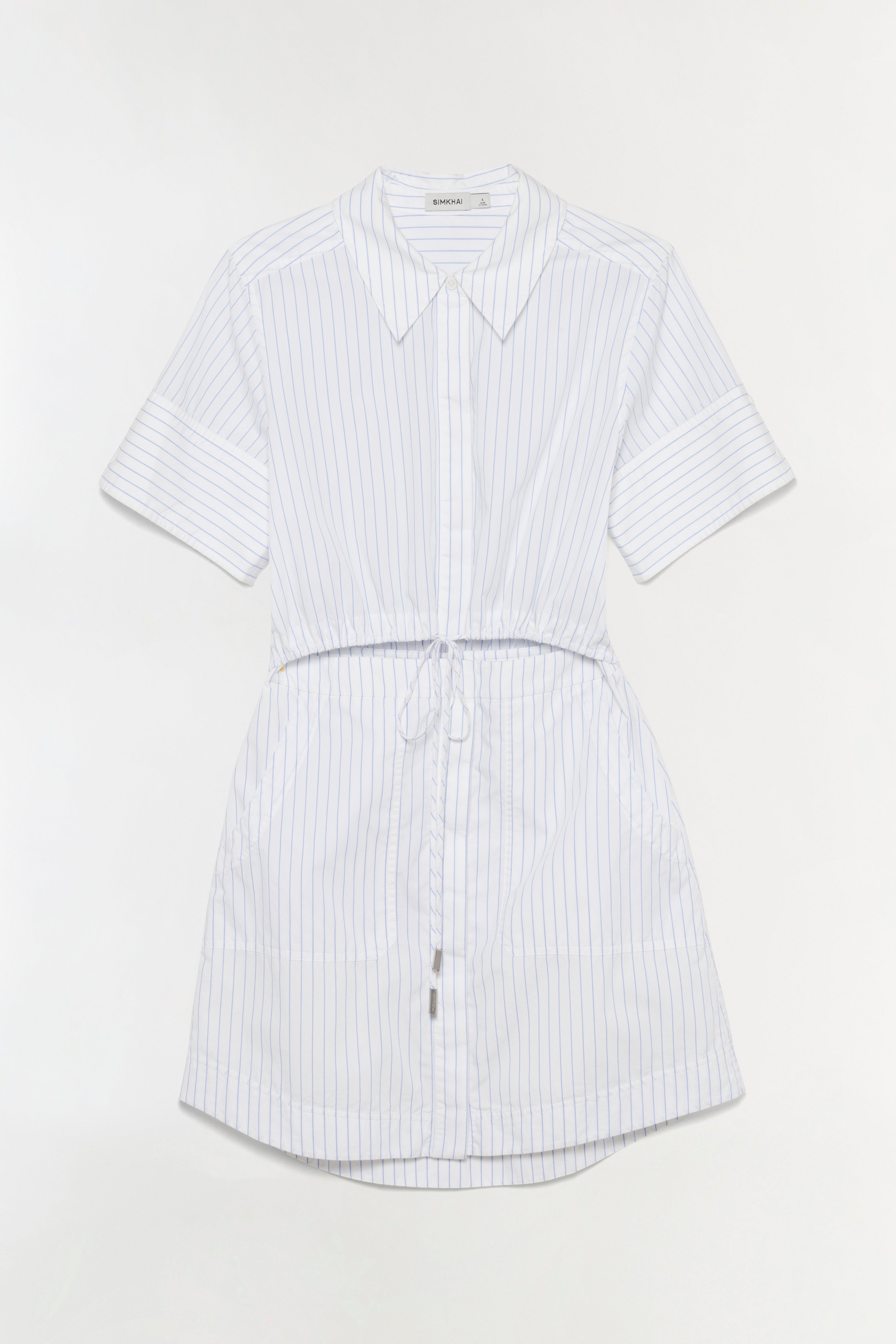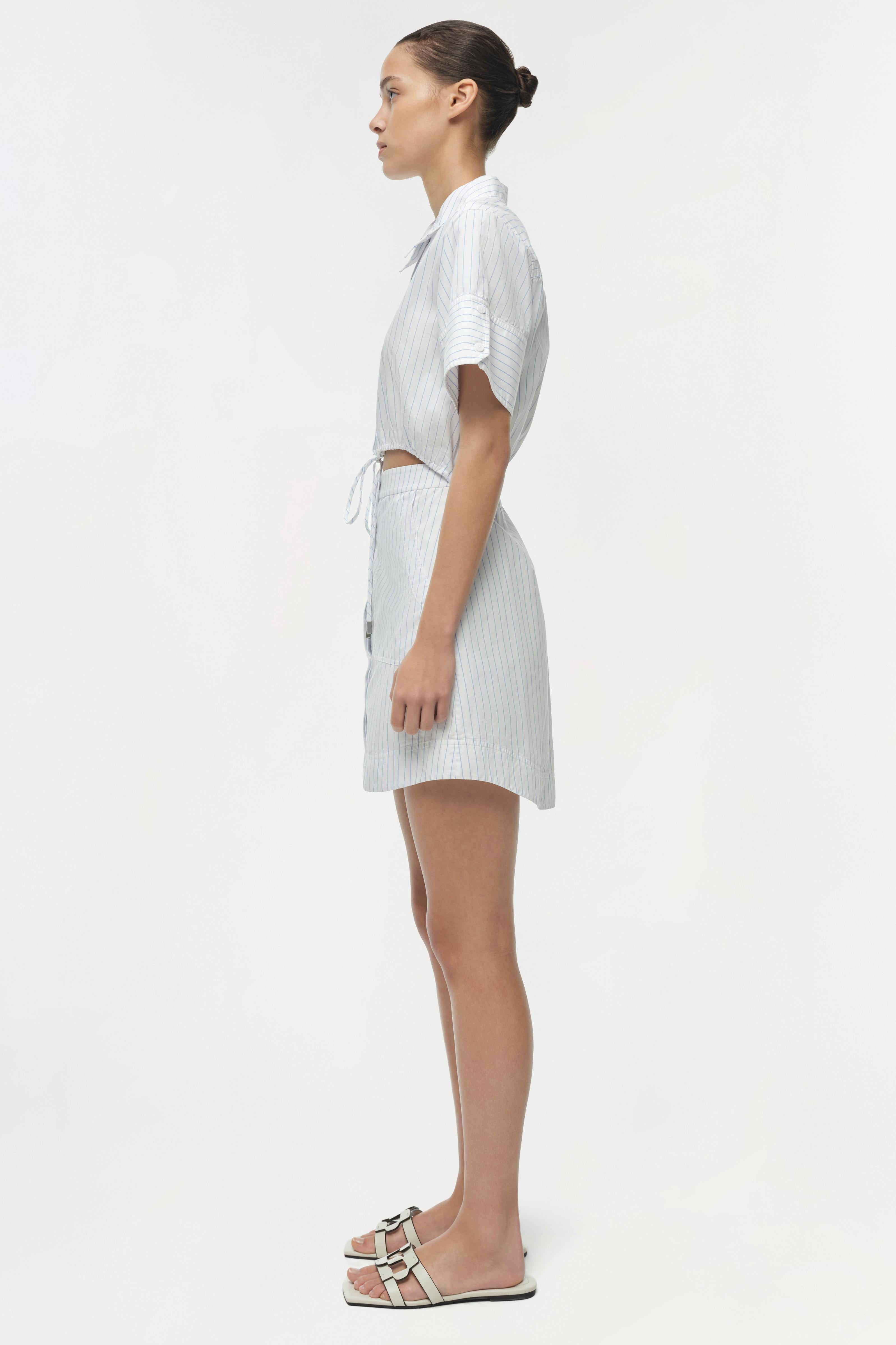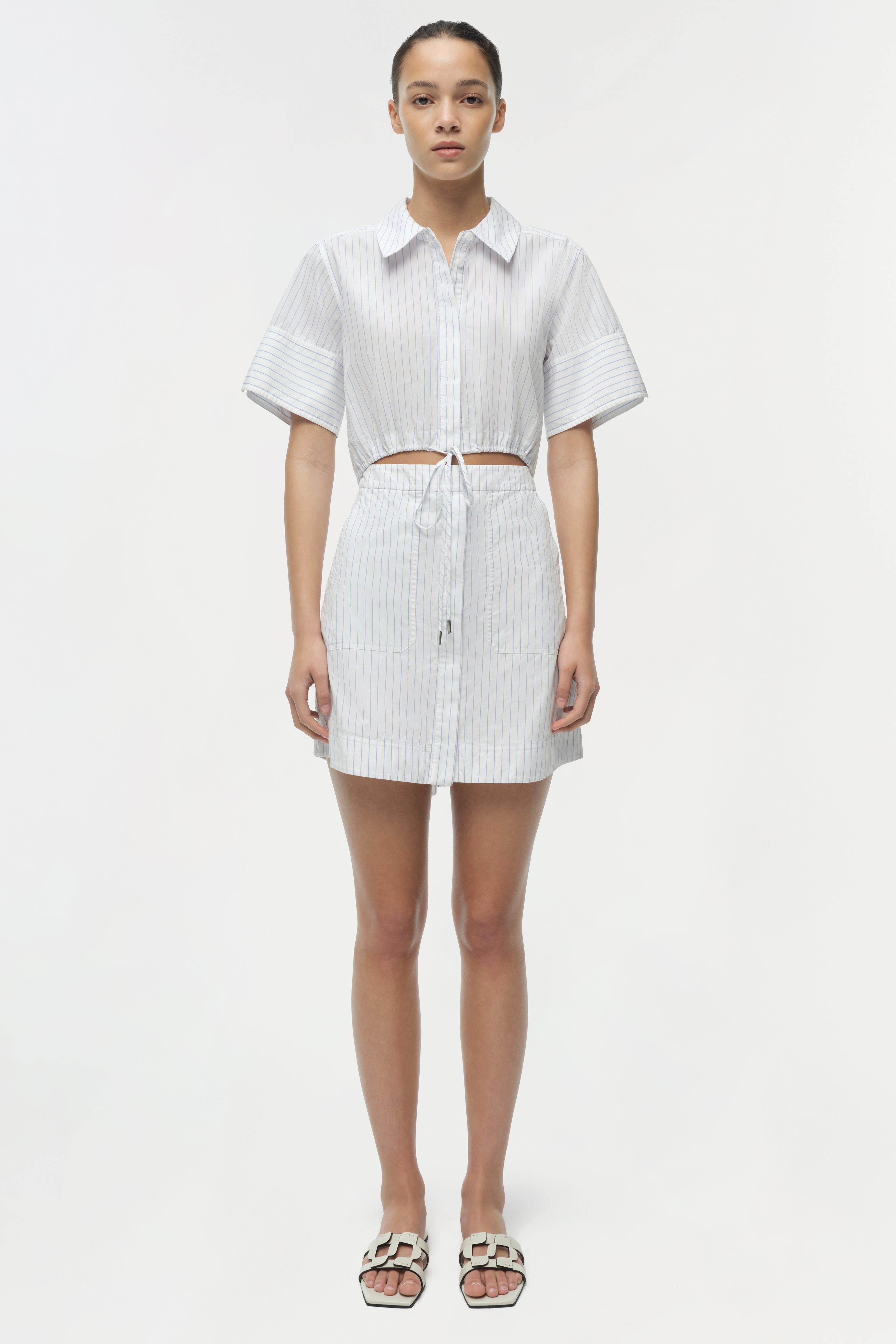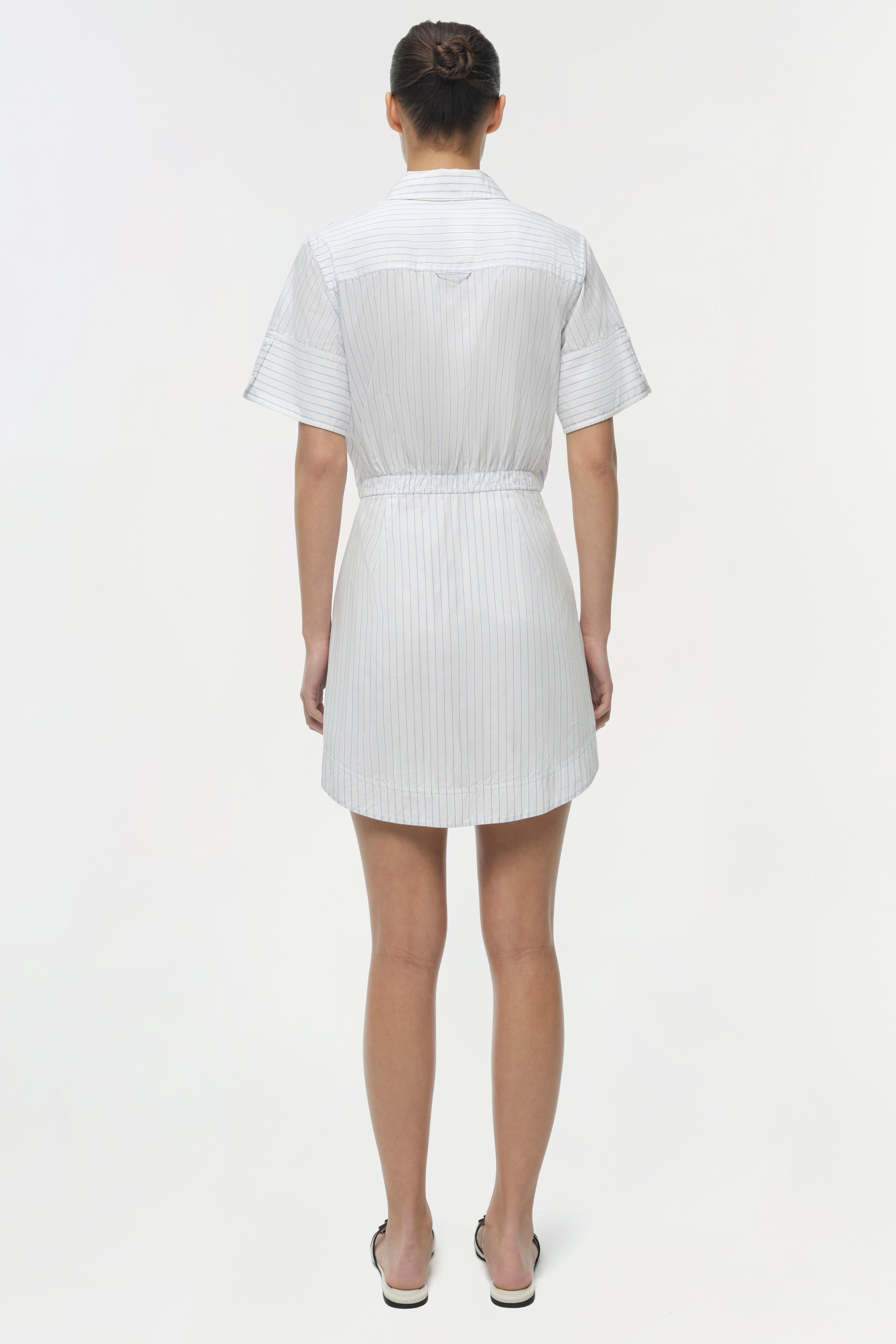 The Marcy Cotton Mini Shirt Dress in White Stripe. Crafted in a button-up style, this cotton mini dress combines polished shirting details with exaggerated sleeves, creating a balanced, contemporary look.