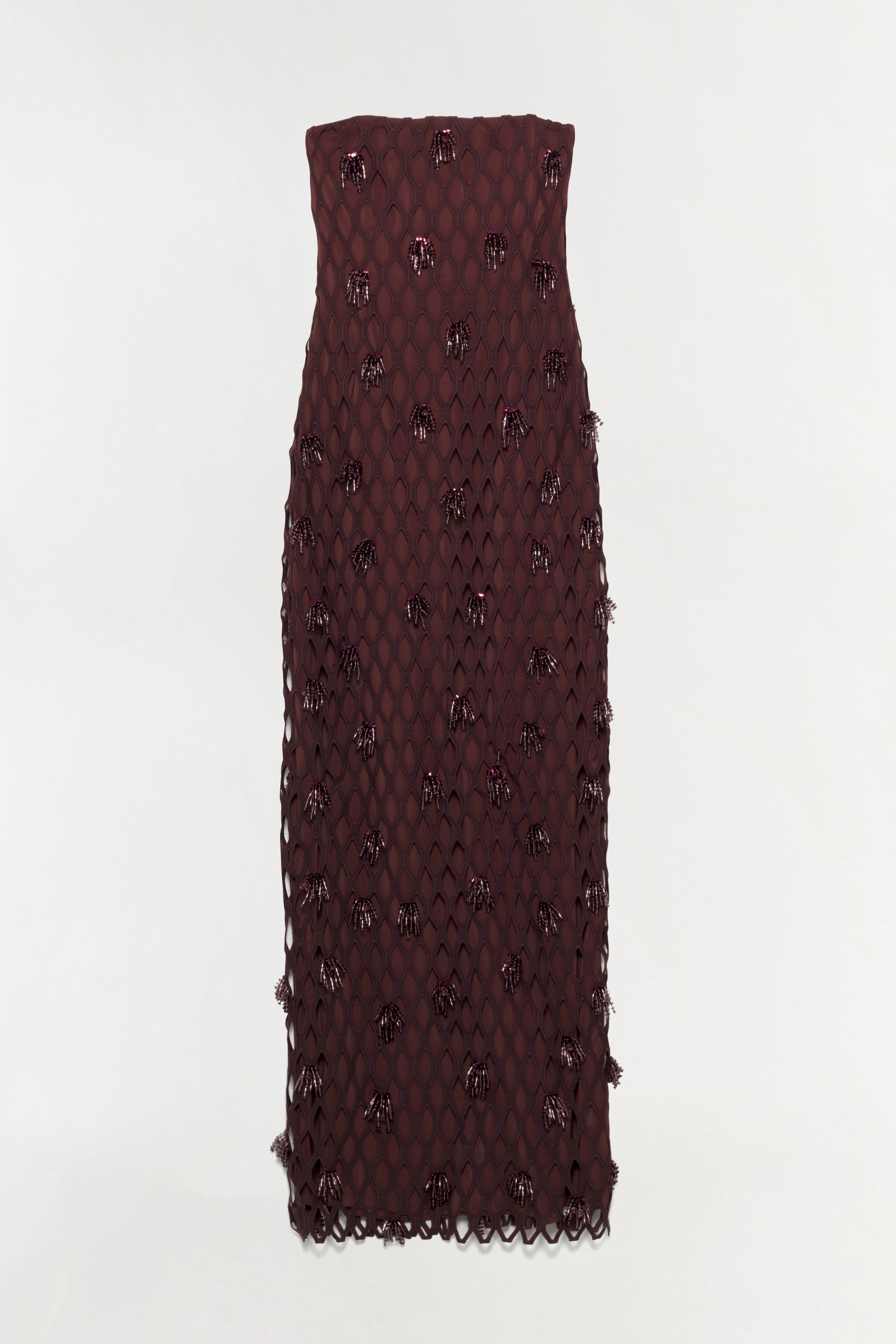 Crafted in structured netting with thoughtfully placed beaded embellishments, this dress introduces texture and motion with a refined ease. The columnar silhouette balances the open geometric overlay with a sleek under layer, resulting in a striking yet refined look.