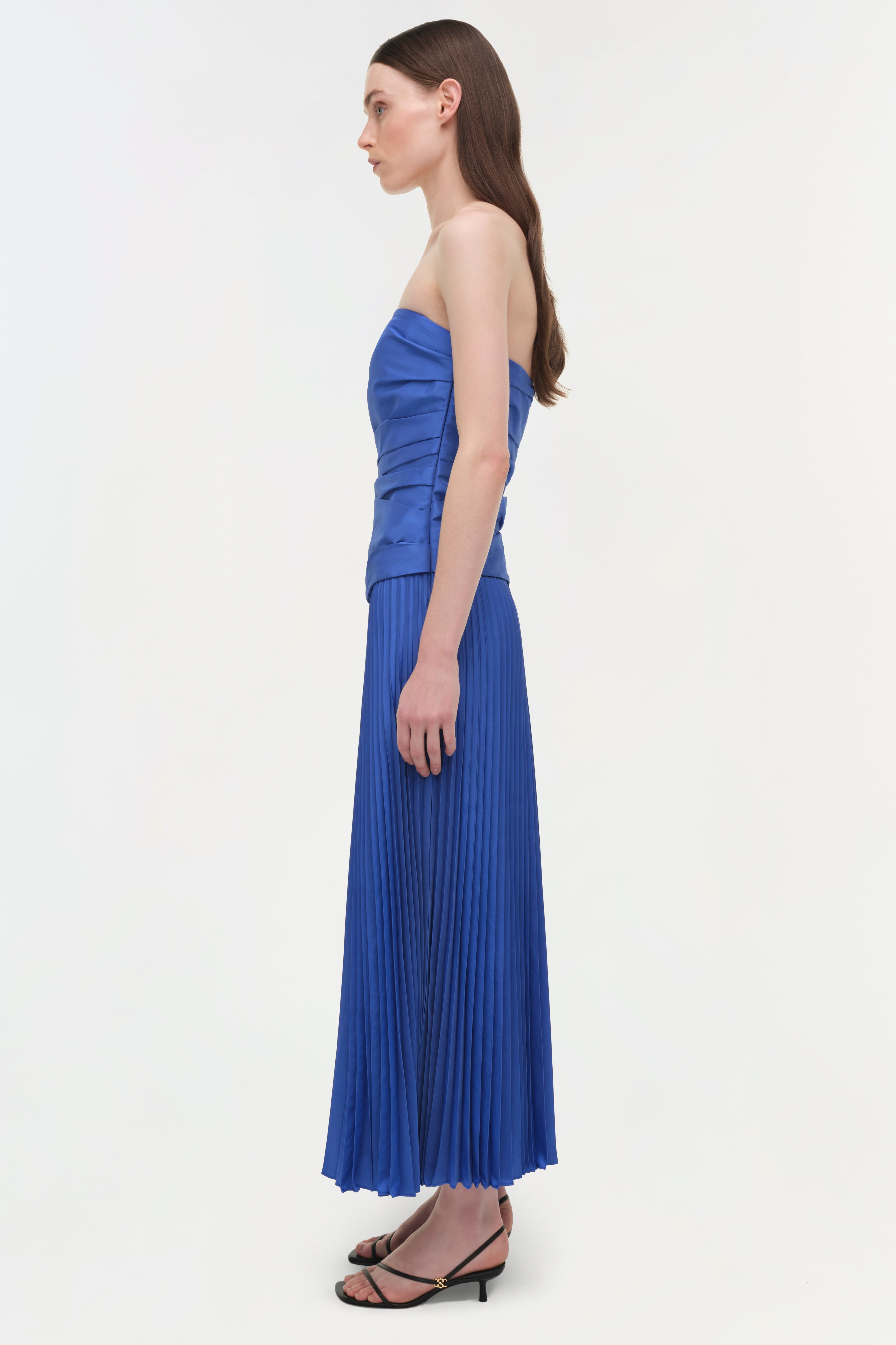 Crafted in crisp taffeta, this strapless midi dress is tailored with a sculpted, ruched bodice that defines the waist. The skirt falls into precise pleats, creating fluid movement and a refined sense of volume. A polished silhouette, designed with modern structure.