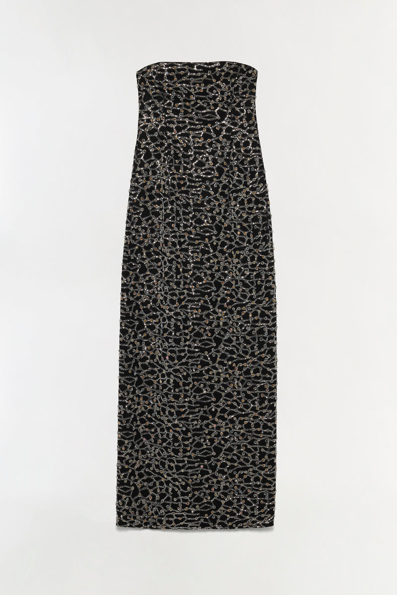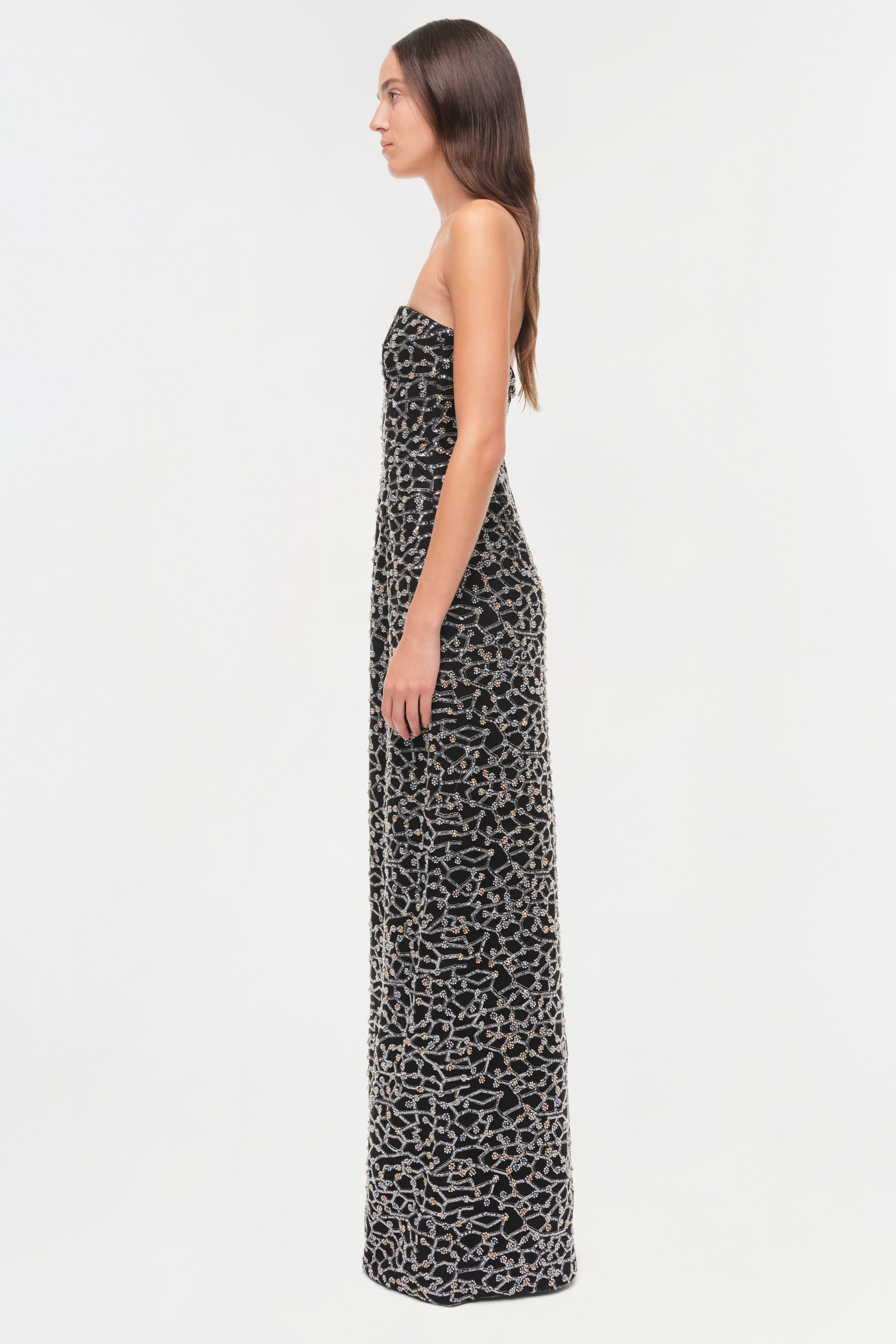 A strapless gown crafted in structured crepe, and embellished with hand sewn sequins. The sequins create a lattice pattern across the dress, tracing the silhouette with contrast and shaping in at the waist. A classic shape, balancing glamour with ease.
