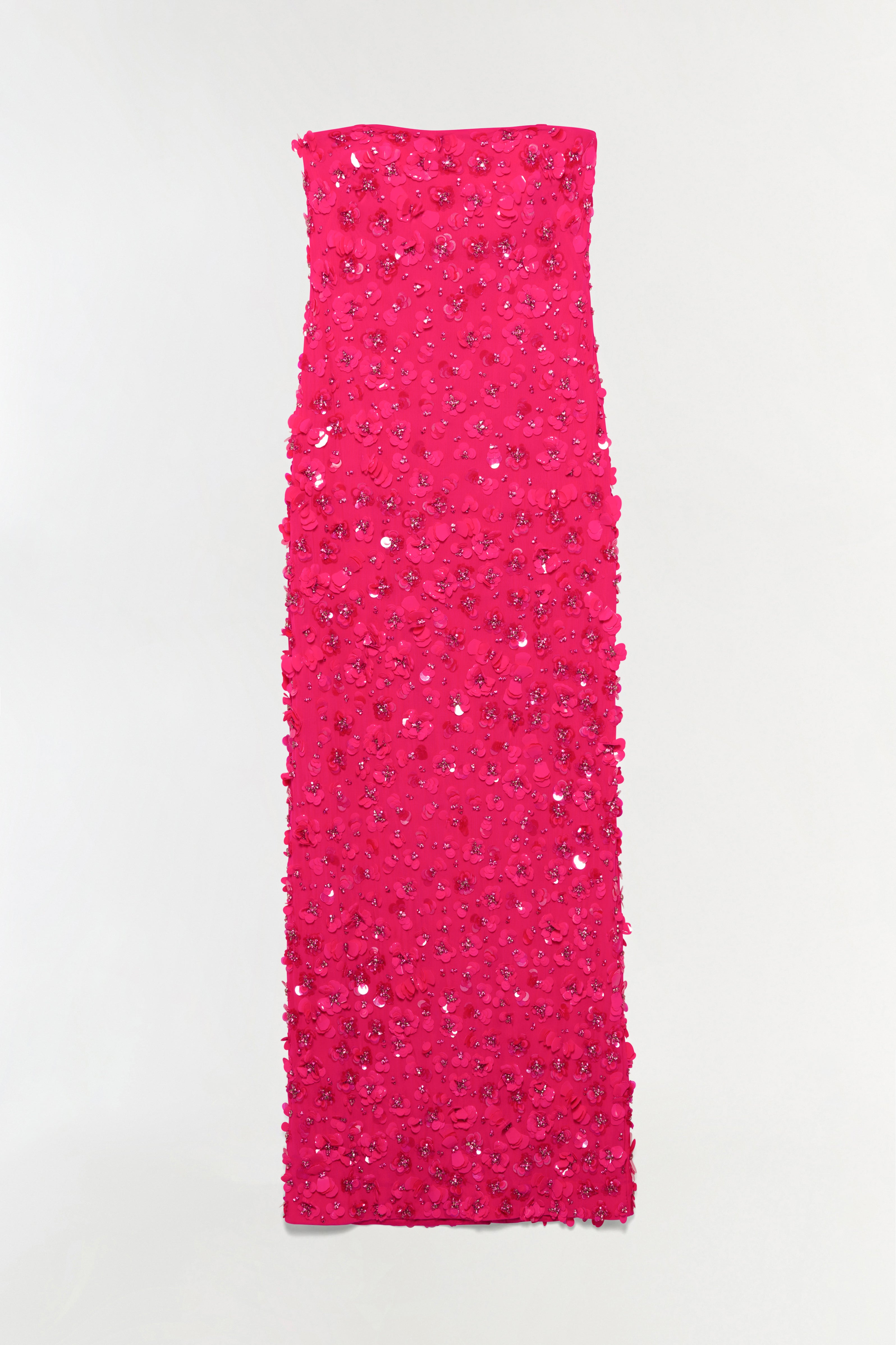 Hand-applied sequins and floral appliqué trace the surface of this strapless column gown. The bodice contours the figure, falling into a straight, floor-length line. Sculpted and radiant, it captures light with every movement.