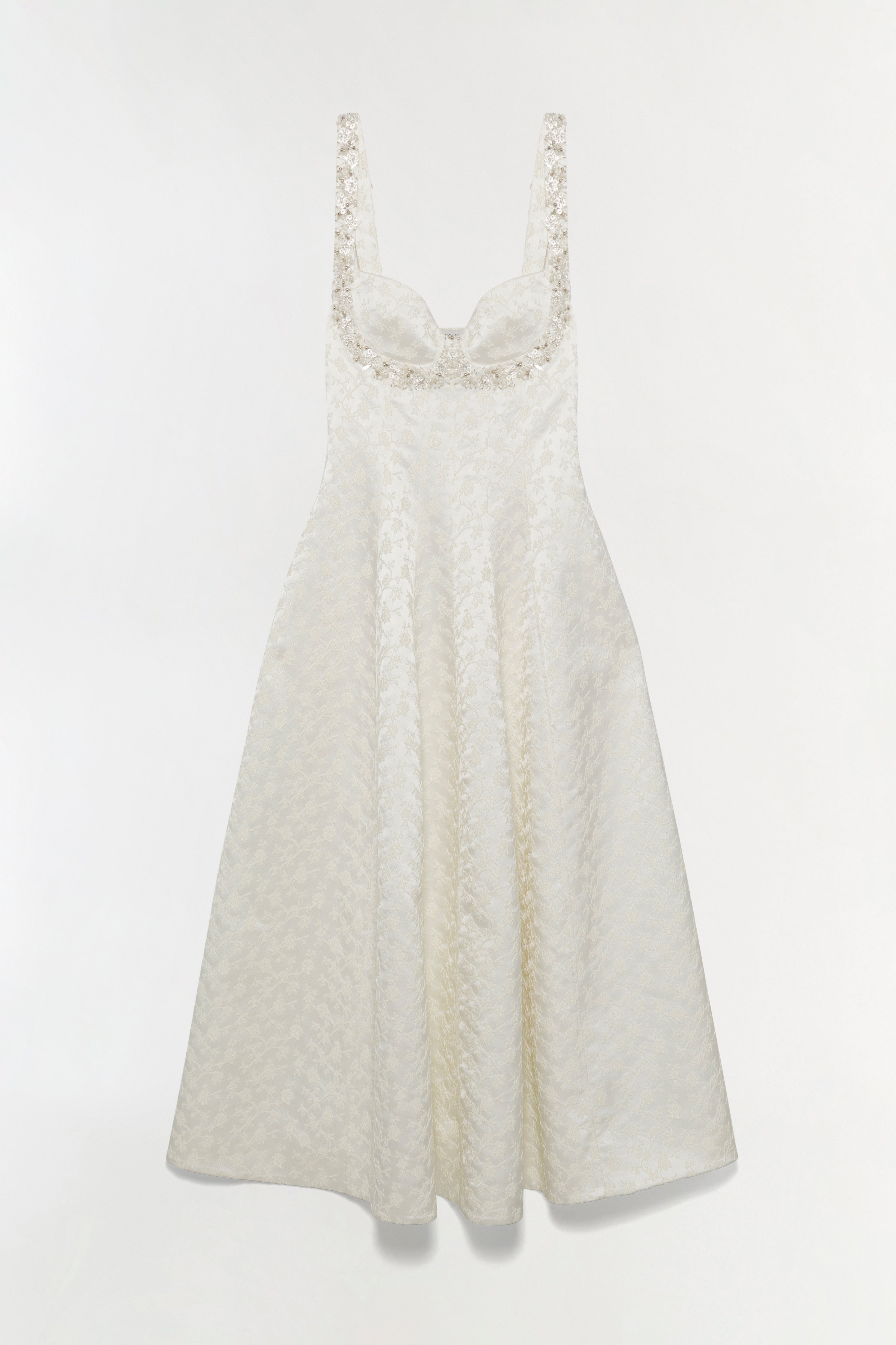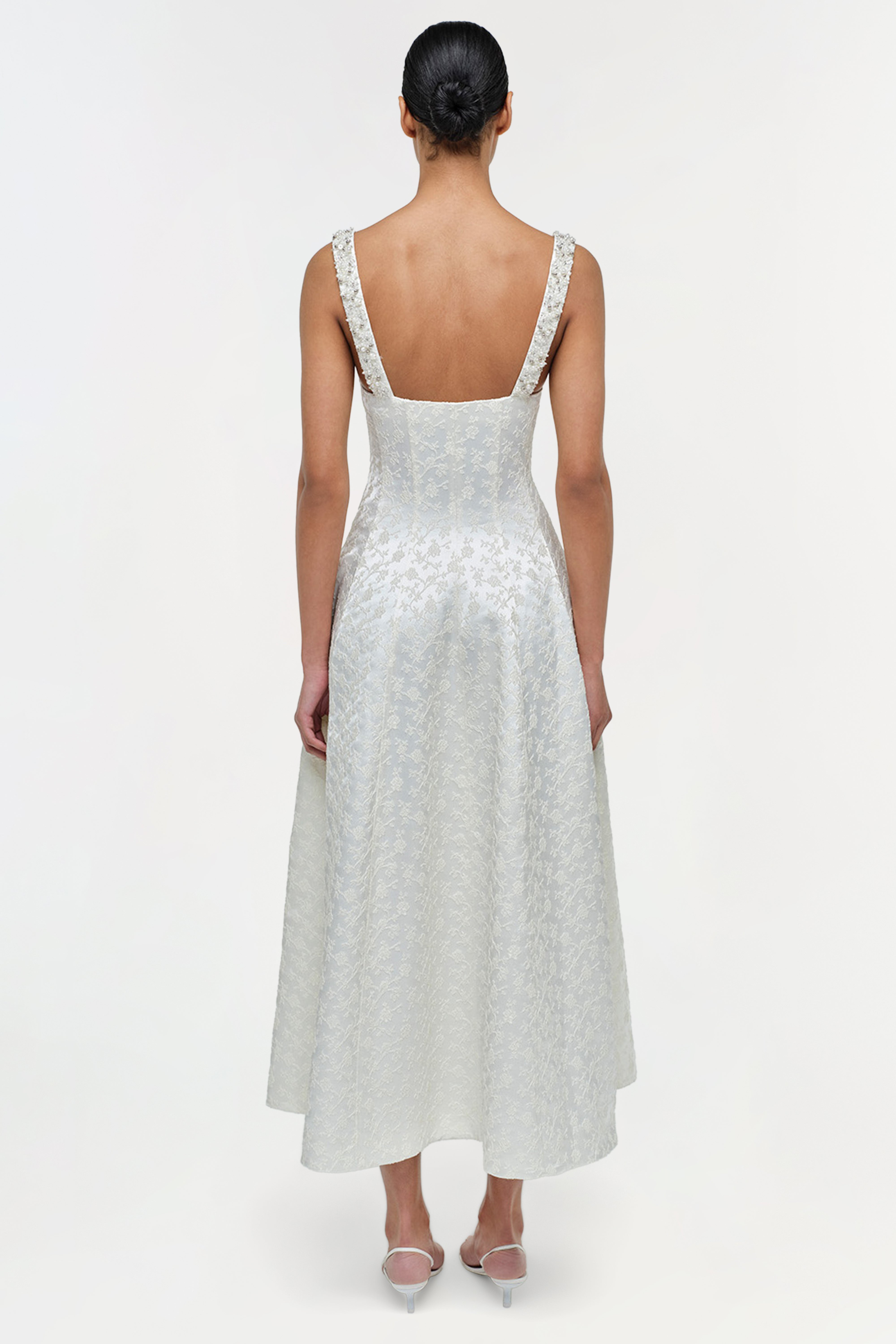 This floral jacquard midi dress is tailored in luminous woven fabric, its structure enhanced by a sweetheart bust adorned with hand-placed embellishments. The fitted bodice flows into a gently flared skirt, balancing precision with romance.