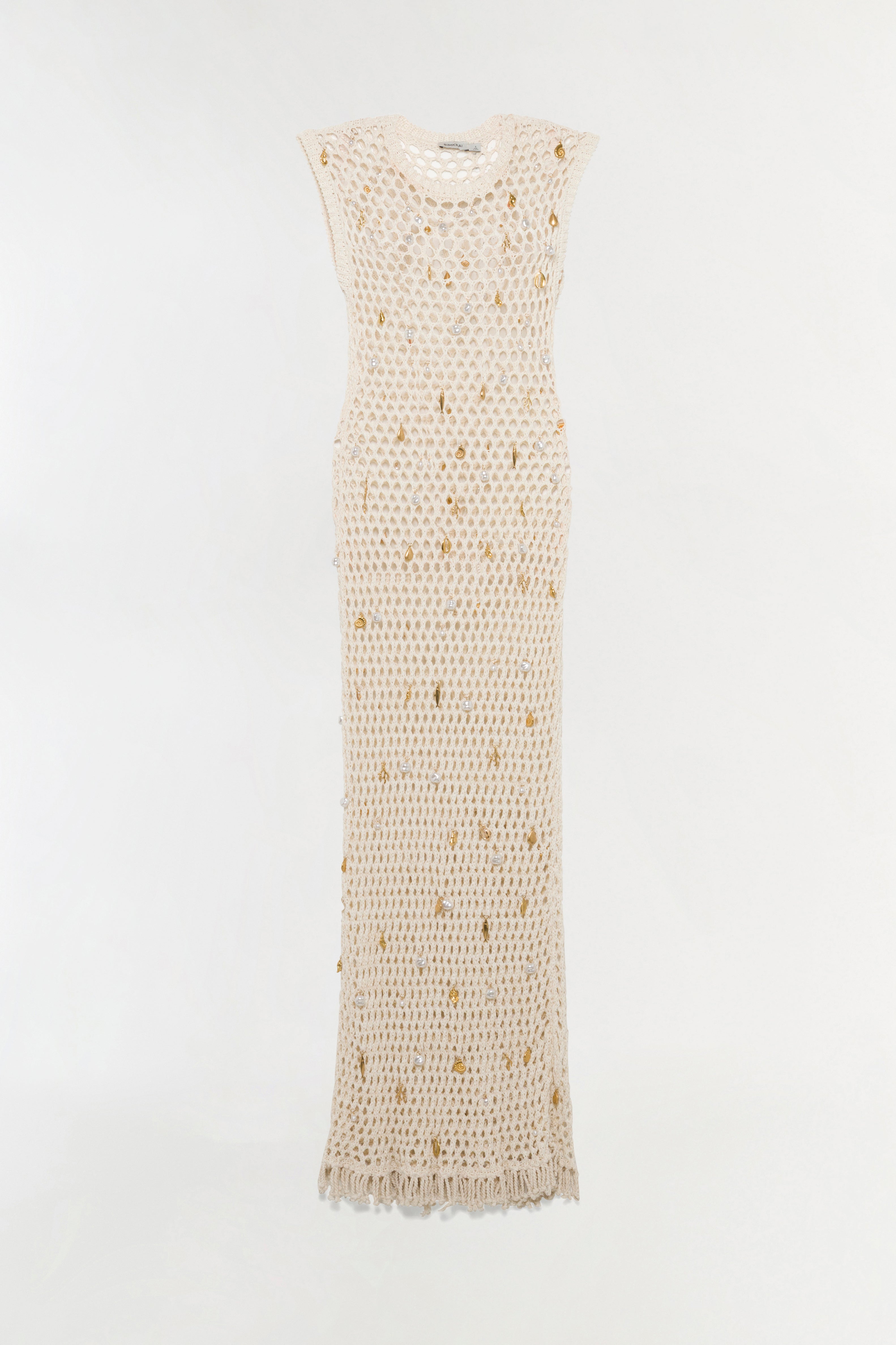 An open crochet knit charmed with treasures from the sea. Ribbed trim defines the neckline and shoulders, while a subtle fringed hem adds texture and movement. Light catches across the embellishments, adding texture and movement.