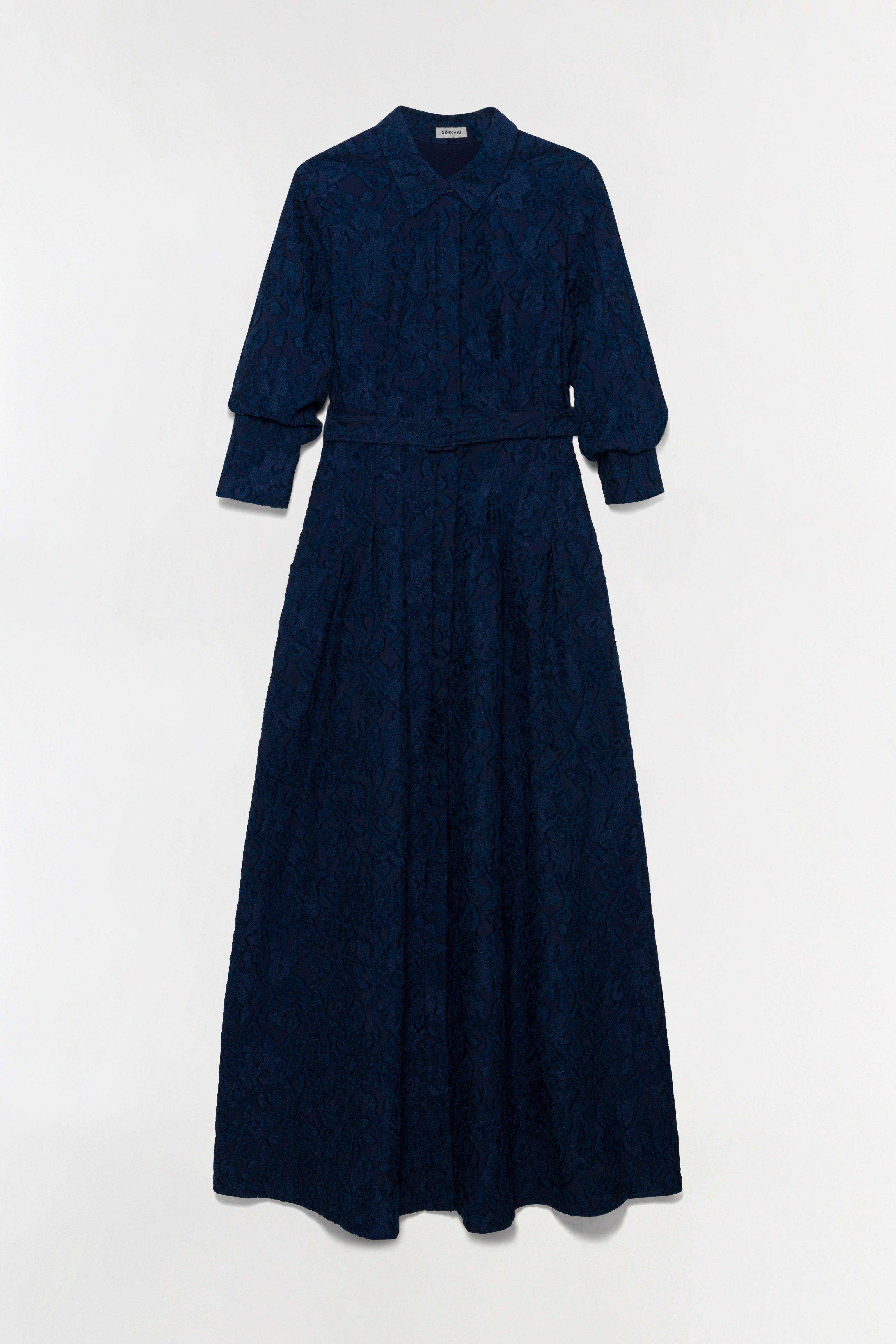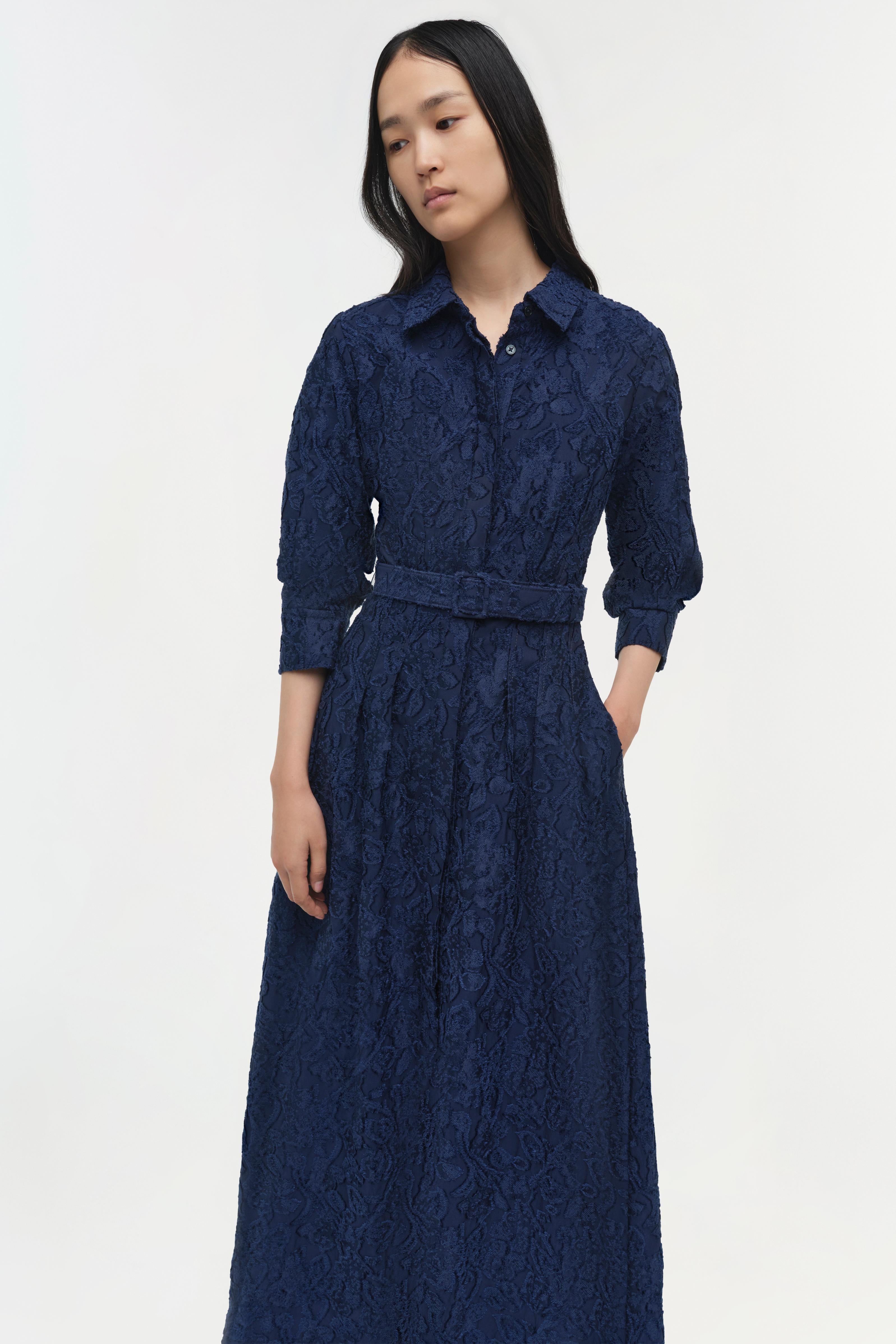 The Courtney Belted Gown in Midnight. Crafted in sheer organza jacquard, this gown balances a structured, button-up bodice with a flowing skirt. The waist belt accentuates the silhouette, adding definition and style.