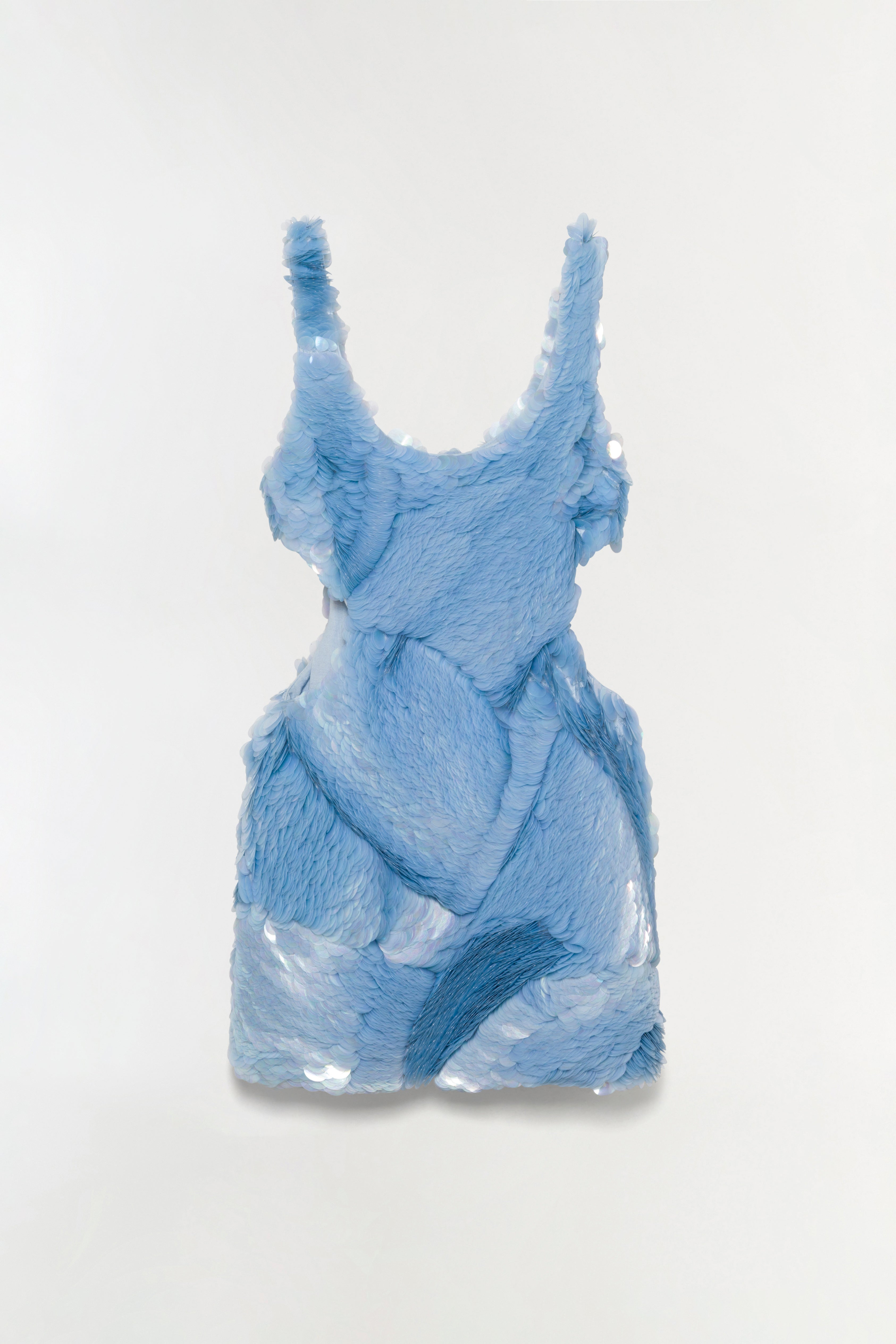 Layered sequins form a rhythmic, light-reflective pattern that create dimension and movement throughout. Side cutouts contour the waist, lending the silhouette a sculpted, modern edge.