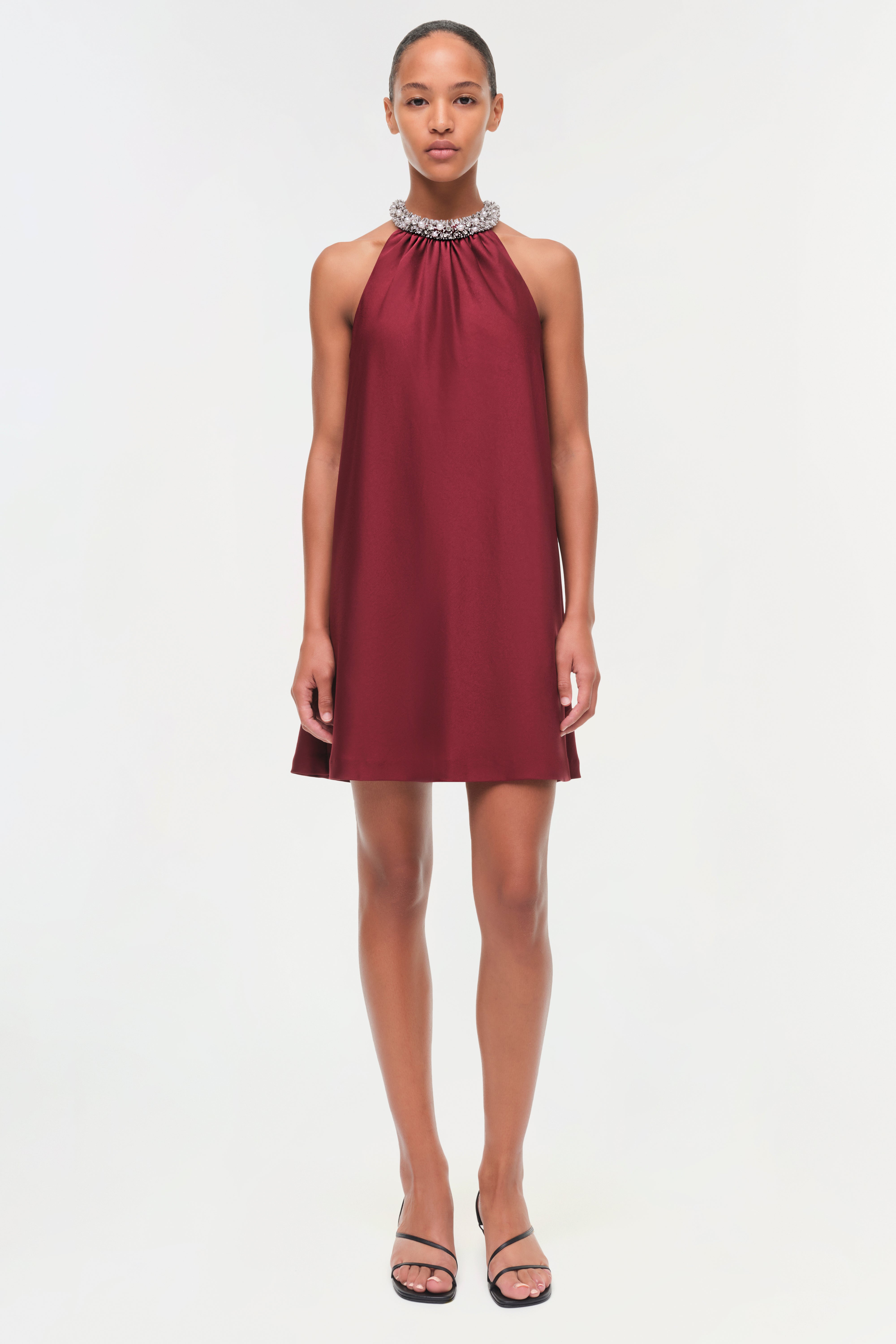 A satin mini dress defined by its jewel-embellished neckline, where hand-applied stones and metallic accents form a striking collar. The clean A-line silhouette creates a sharp contrast, letting the intricate craftsmanship at the neckline command attention.