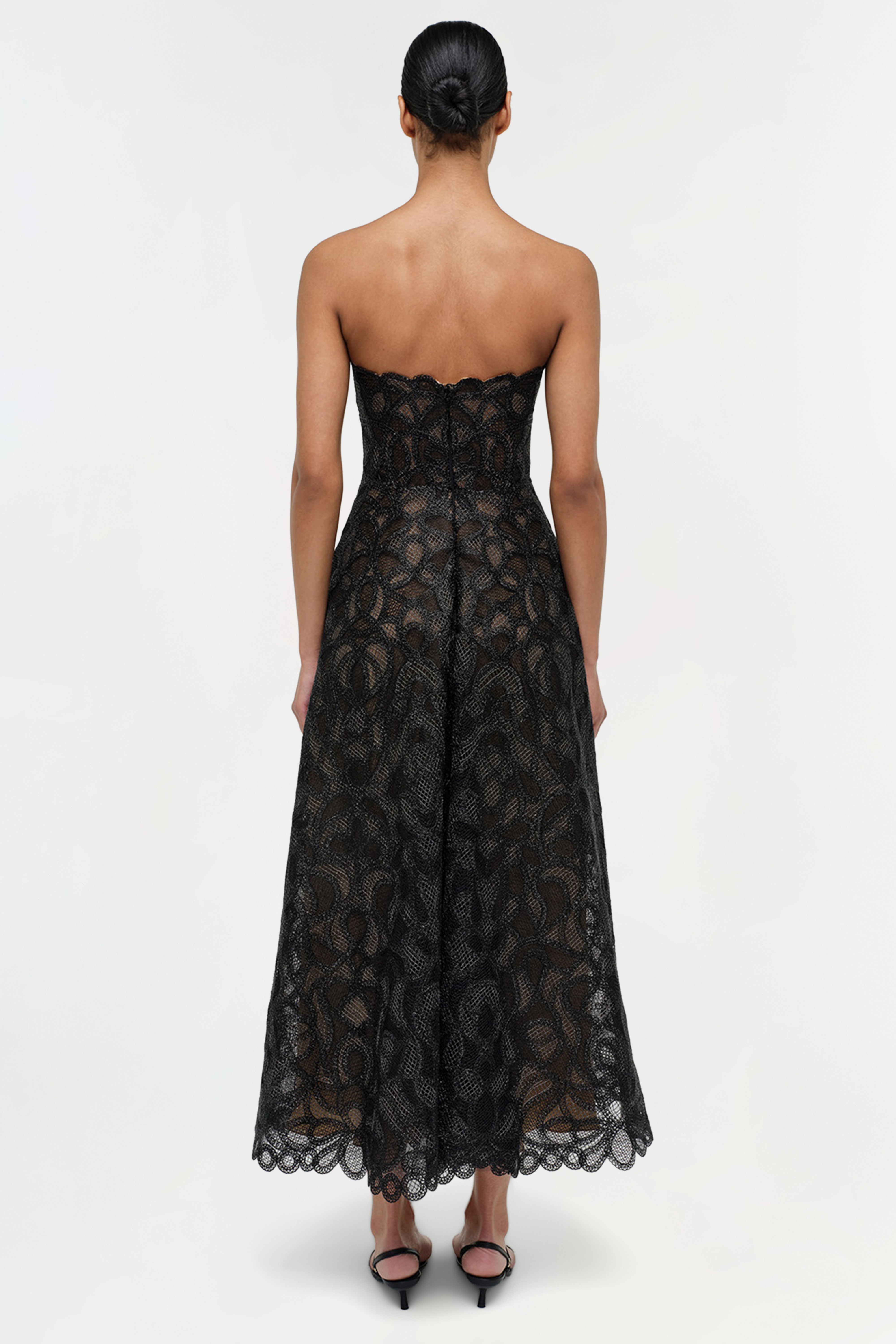 A strapless midi dress cut from a gilded guipure lace, threaded with metallic accents that shimmer in motion. The scalloped neckline and hem highlight the intricacy of the lace, while the structured bodice opens into a fluid A-line skirt. The result is a piece of quiet opulence, defined by detail and precision.