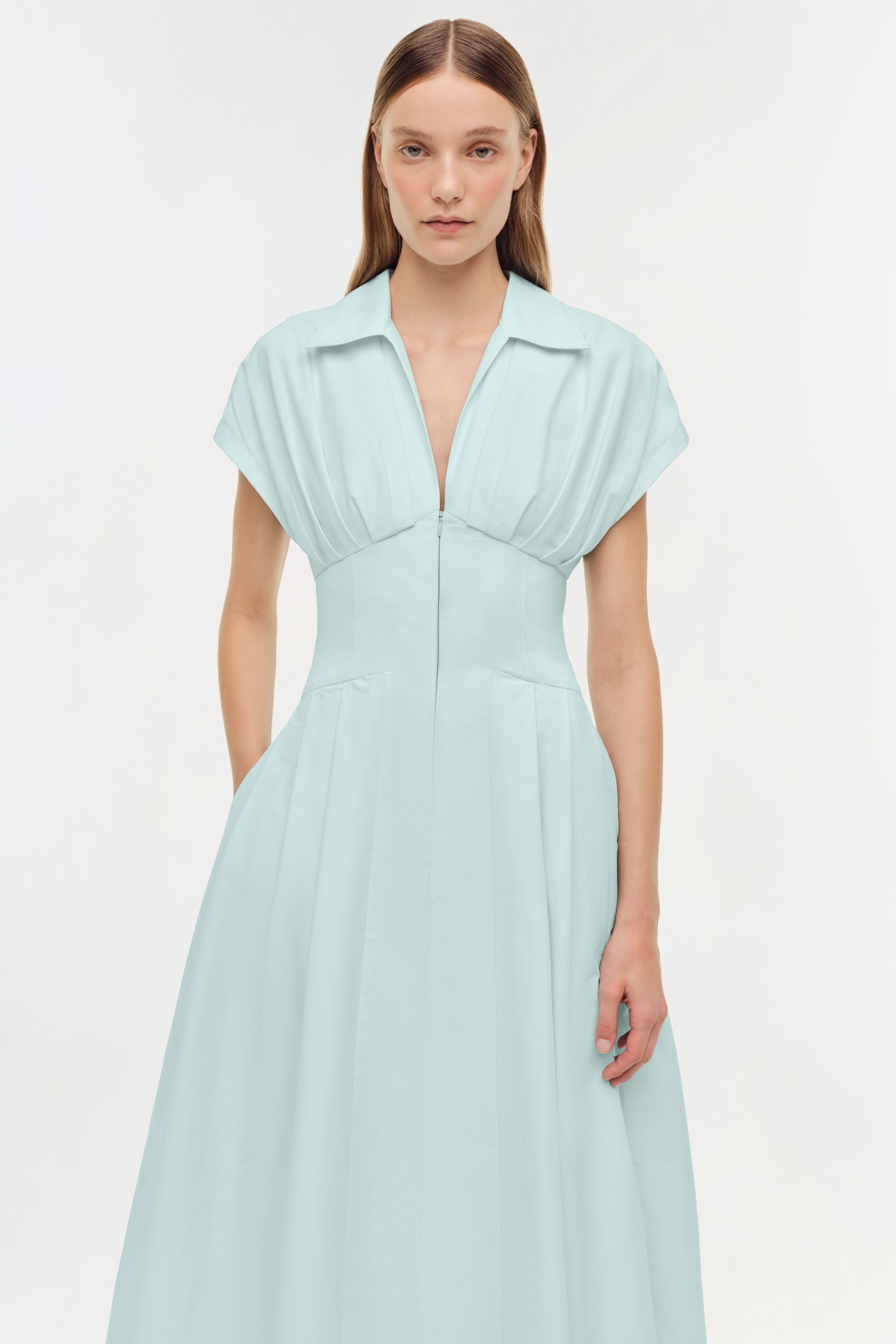 Crafted in crisp cotton faille, this dress holds it shape while offering effortless comfort. The midi-length silhouette falls with subtle ease, softly defining the waist of a polished, understated look.