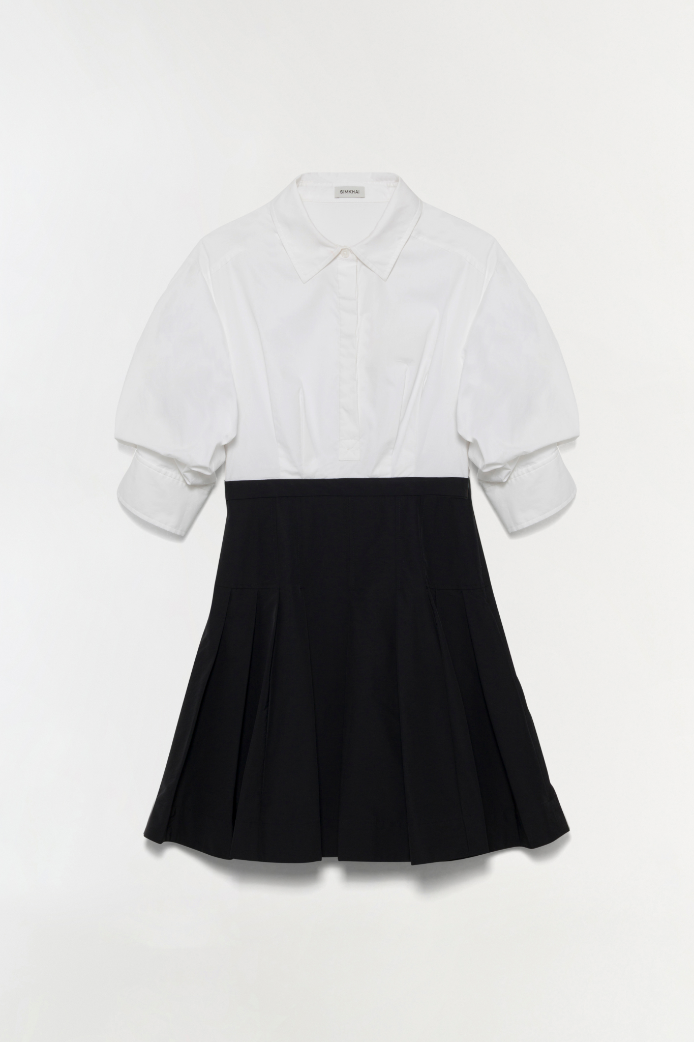 Made from lightweight cotton, this dress pairs a crisp, collared bodice with a sculpted waist and flared pleats. The clean lines and compact structure create an elevated, versatile shape