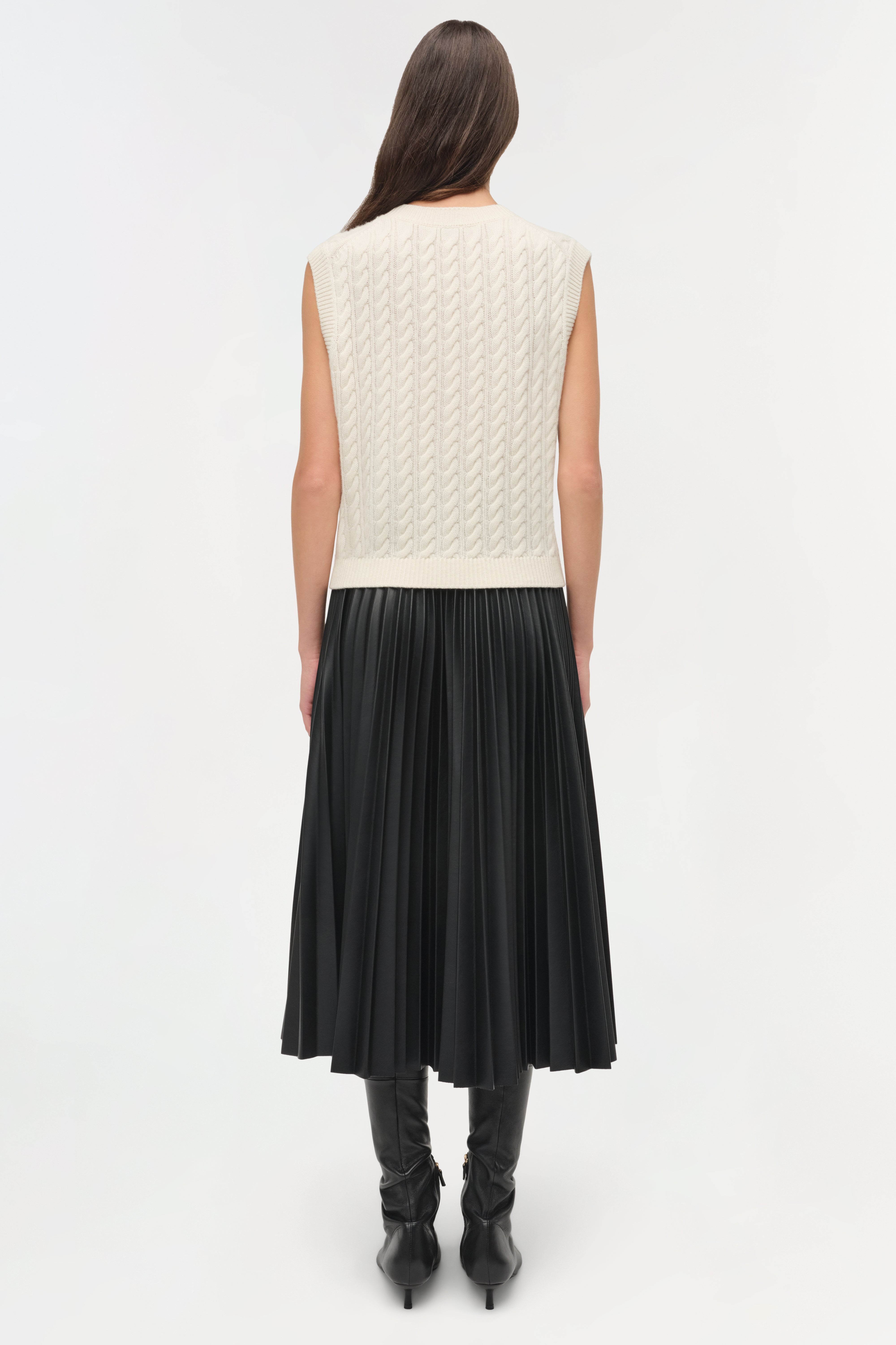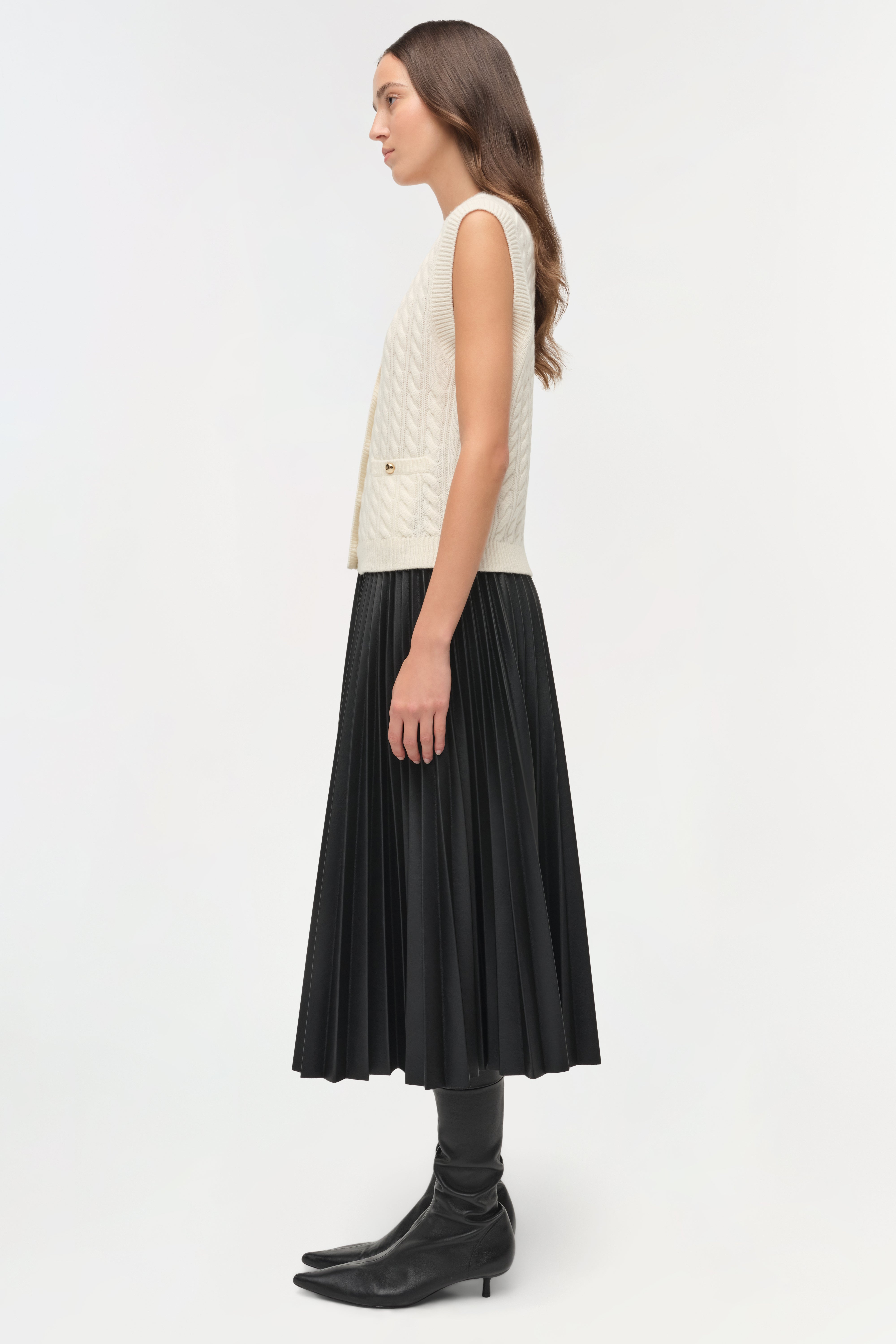 Knitted from soft cashmere, this vest showcases a classic cable texture and refined V-neckline. Gold-tone buttons provide subtle contrast. Designed as a enduring staple across seasons.