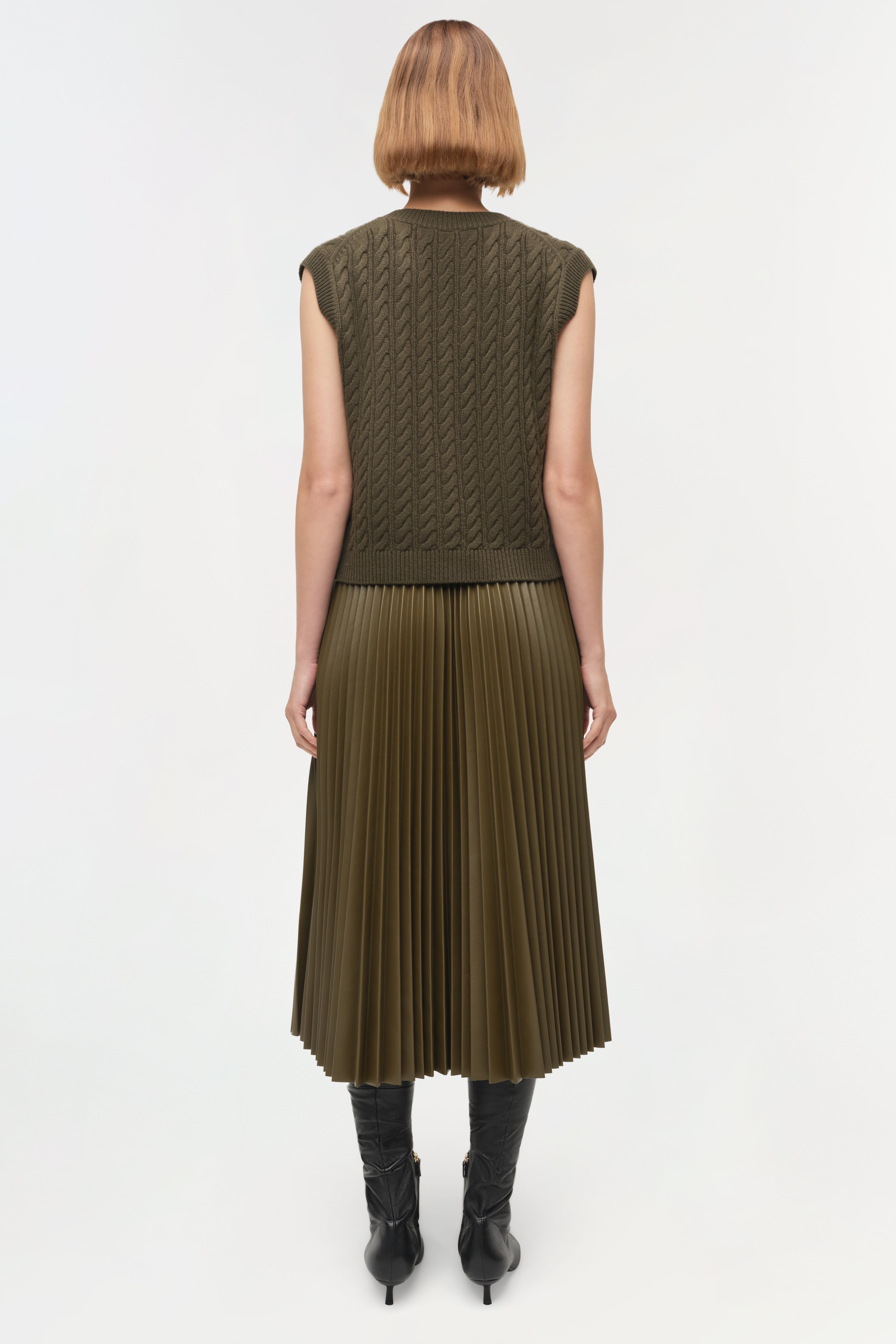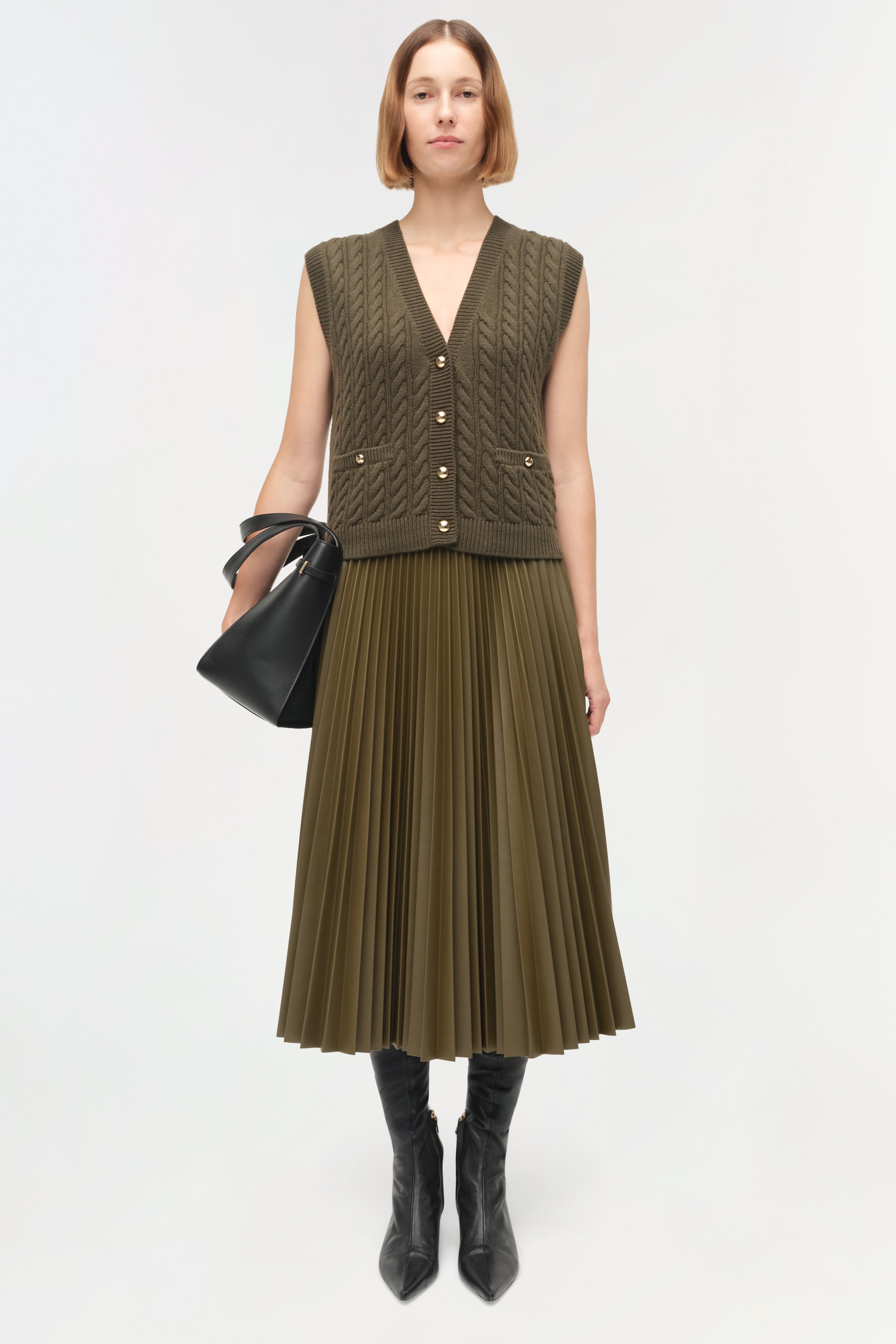Knitted from soft cashmere, this vest showcases a classic cable texture and refined V-neckline. Gold-tone buttons provide subtle contrast. Designed as a enduring staple across seasons.