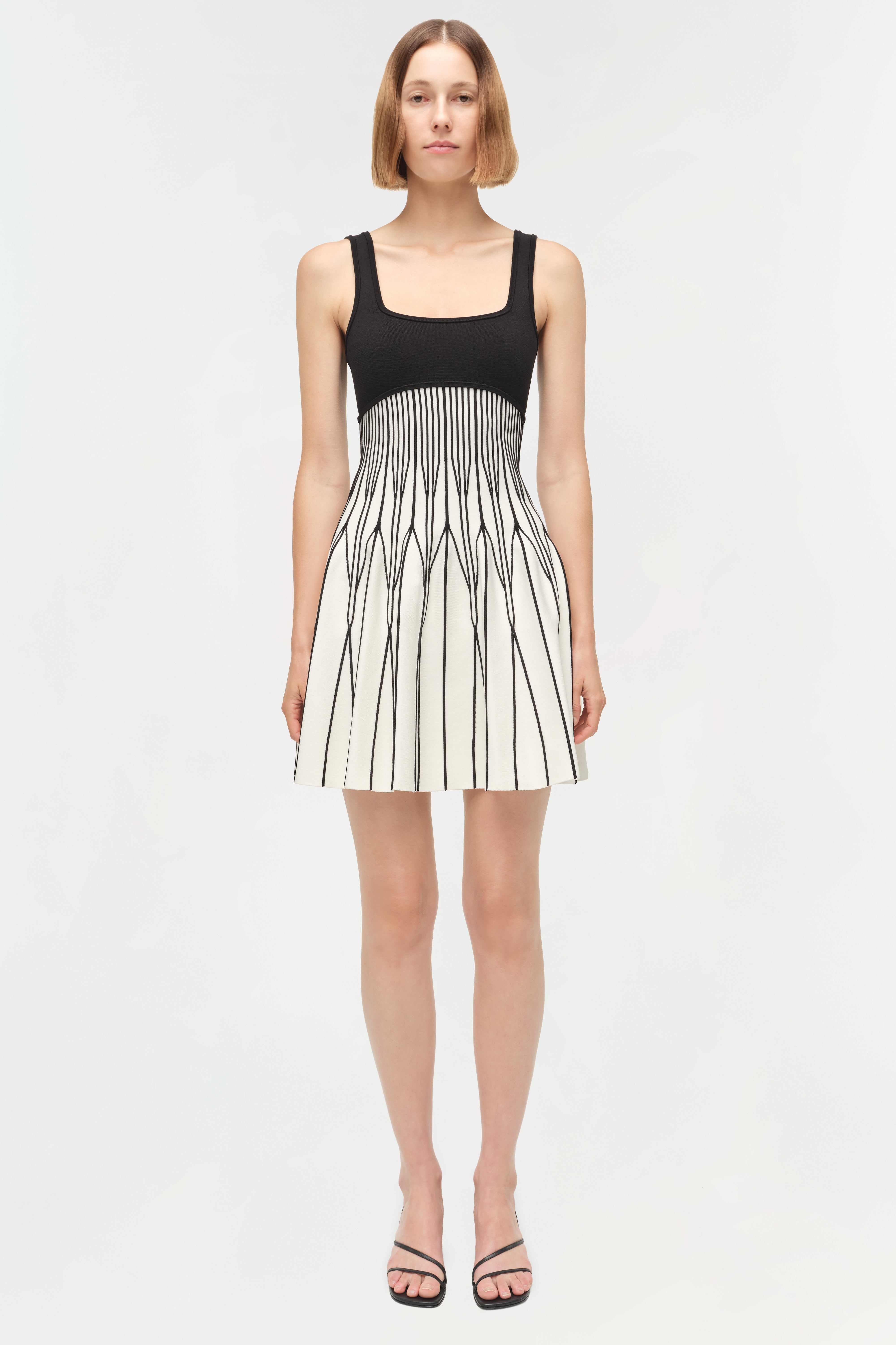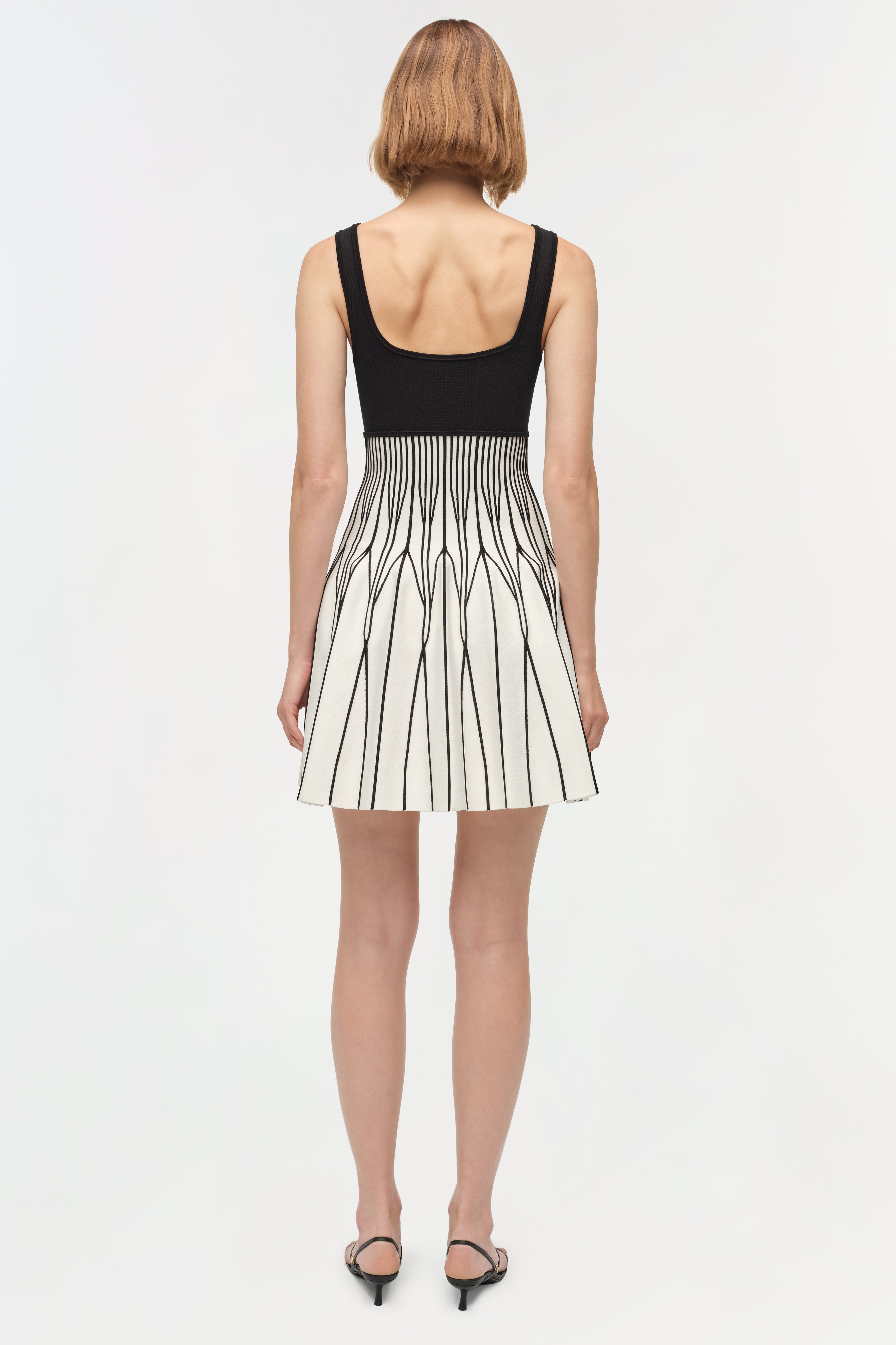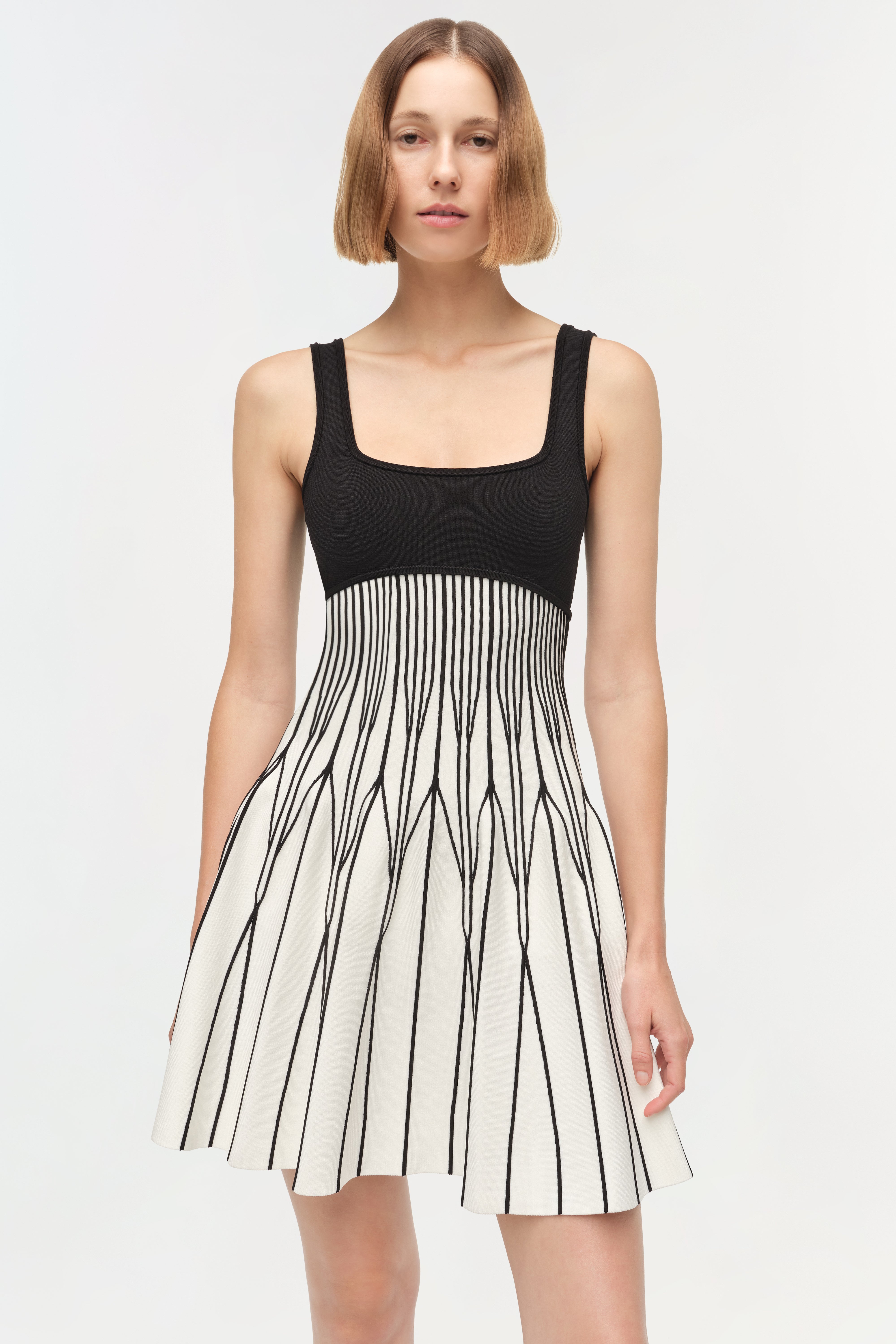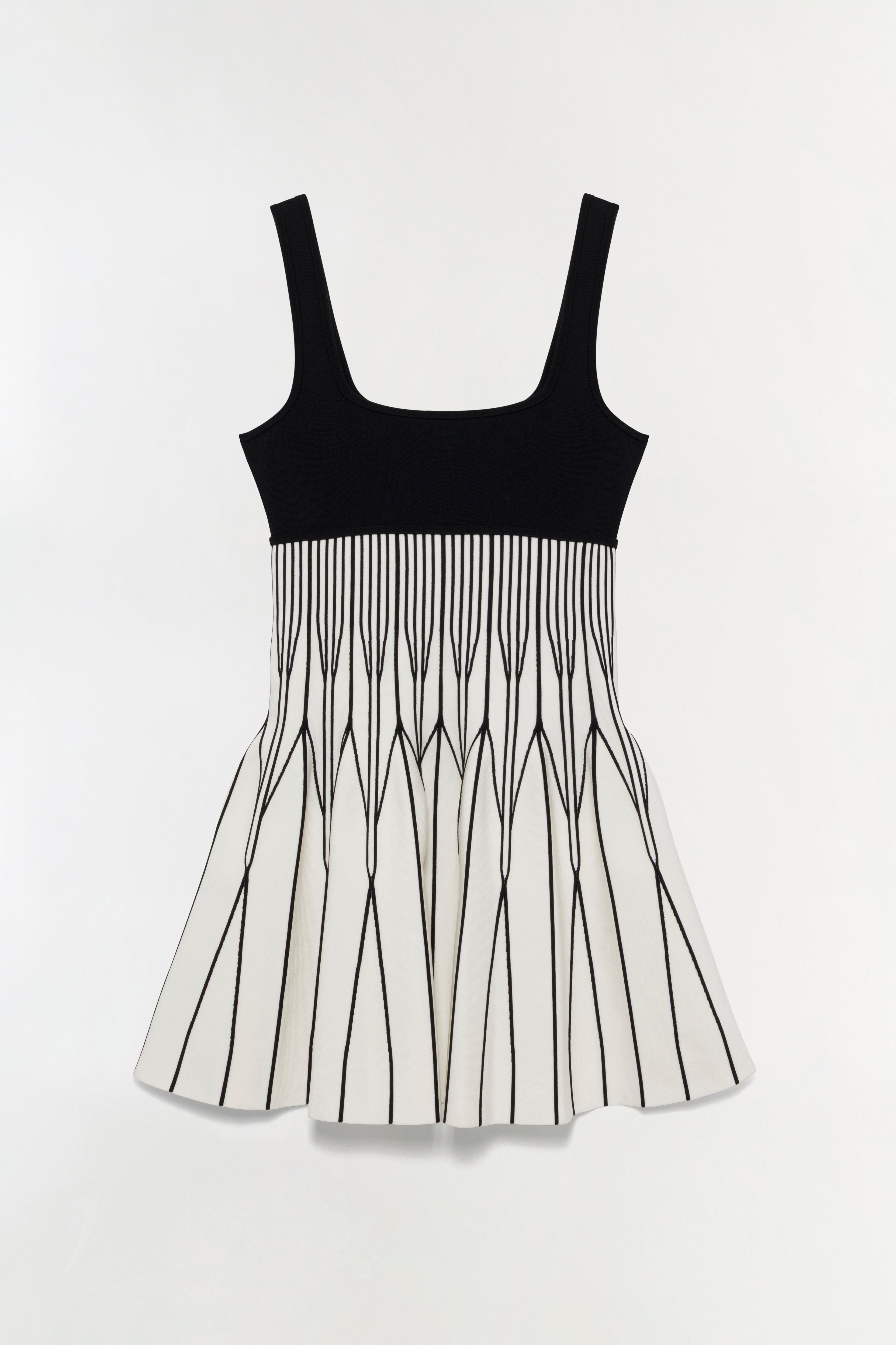 Knit in a compact weave, this mini dress contours the body before flaring into a softly structured skirt. Vertical contrast lines elongate the form, creating a sculptural illusion of movement. A refined play of texture and proportion.