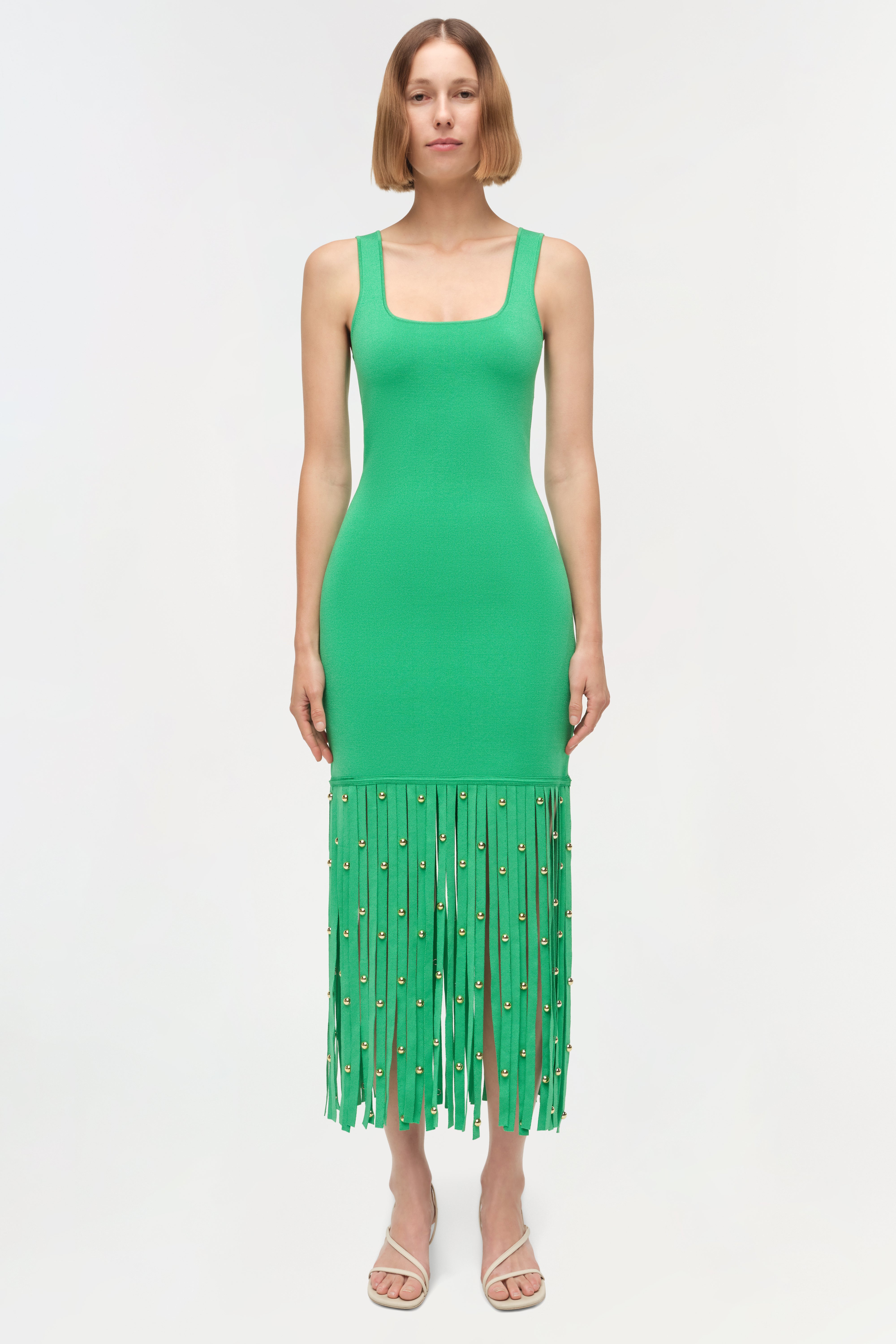 Knit in a matte compact weave, this midi dress contours the frame with smooth precision. A square neckline leads into a clean, elongating silhouette finished with cascading fringe detailed in metal hardware. Sleek and sculptural, it moves with ease.