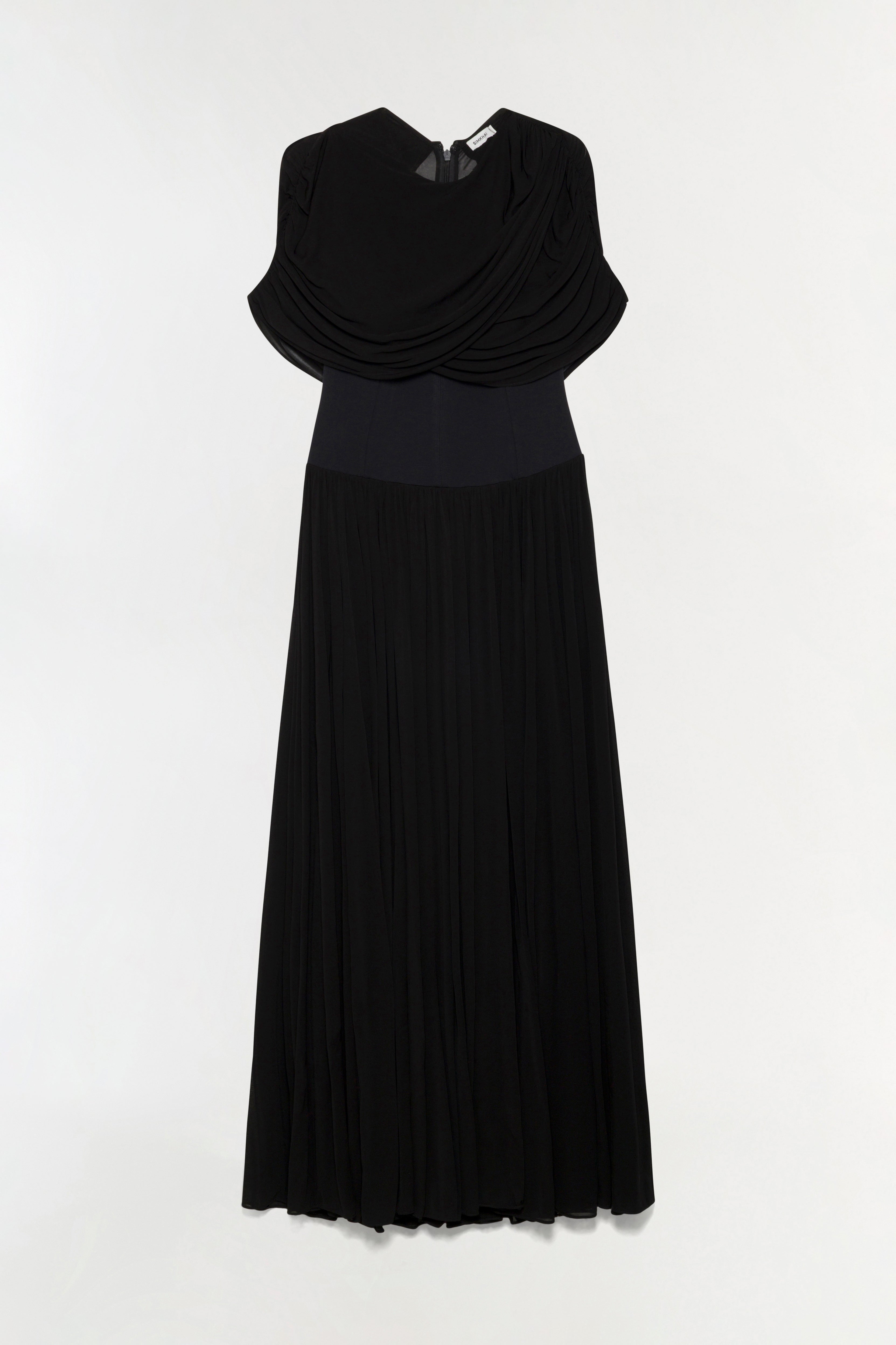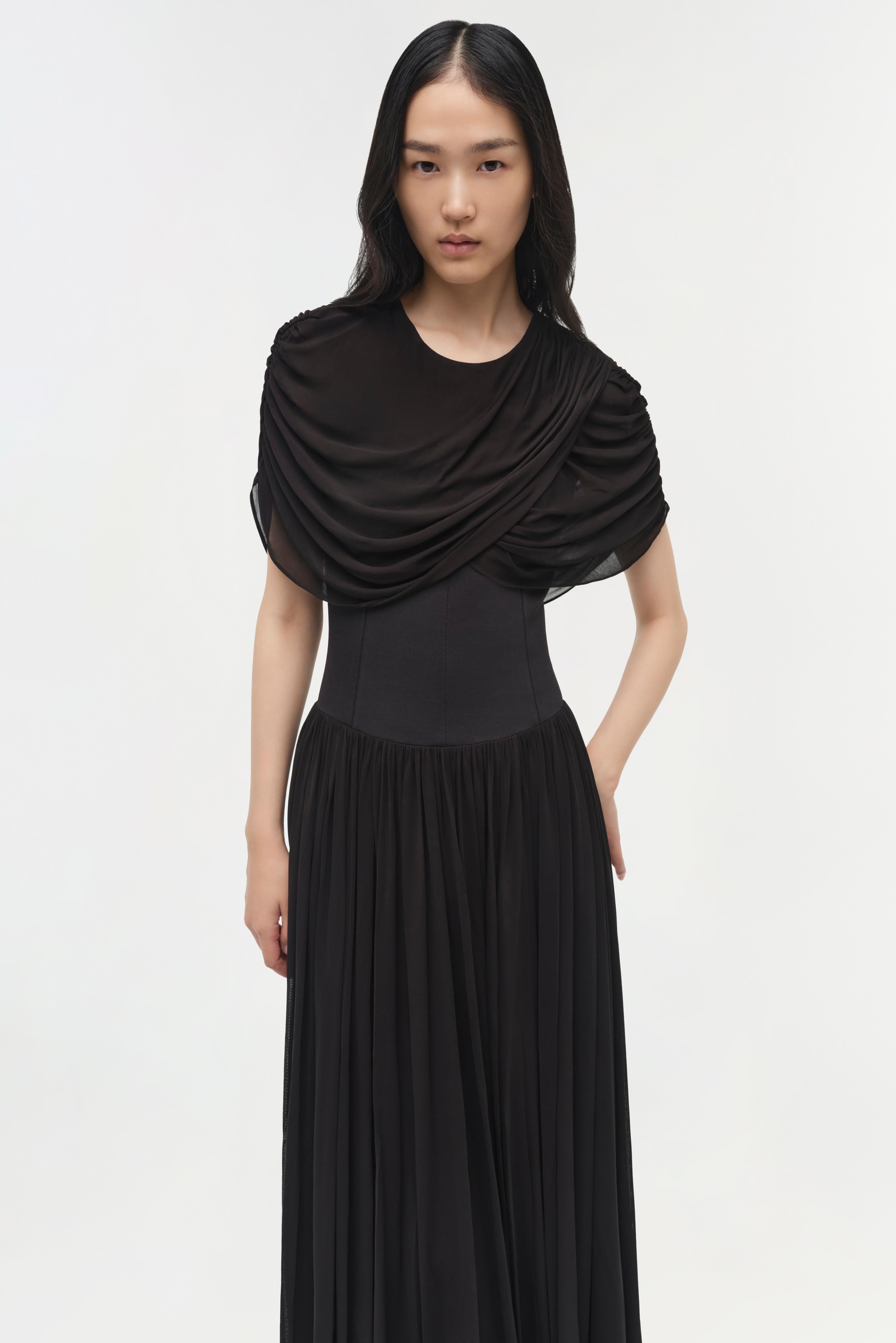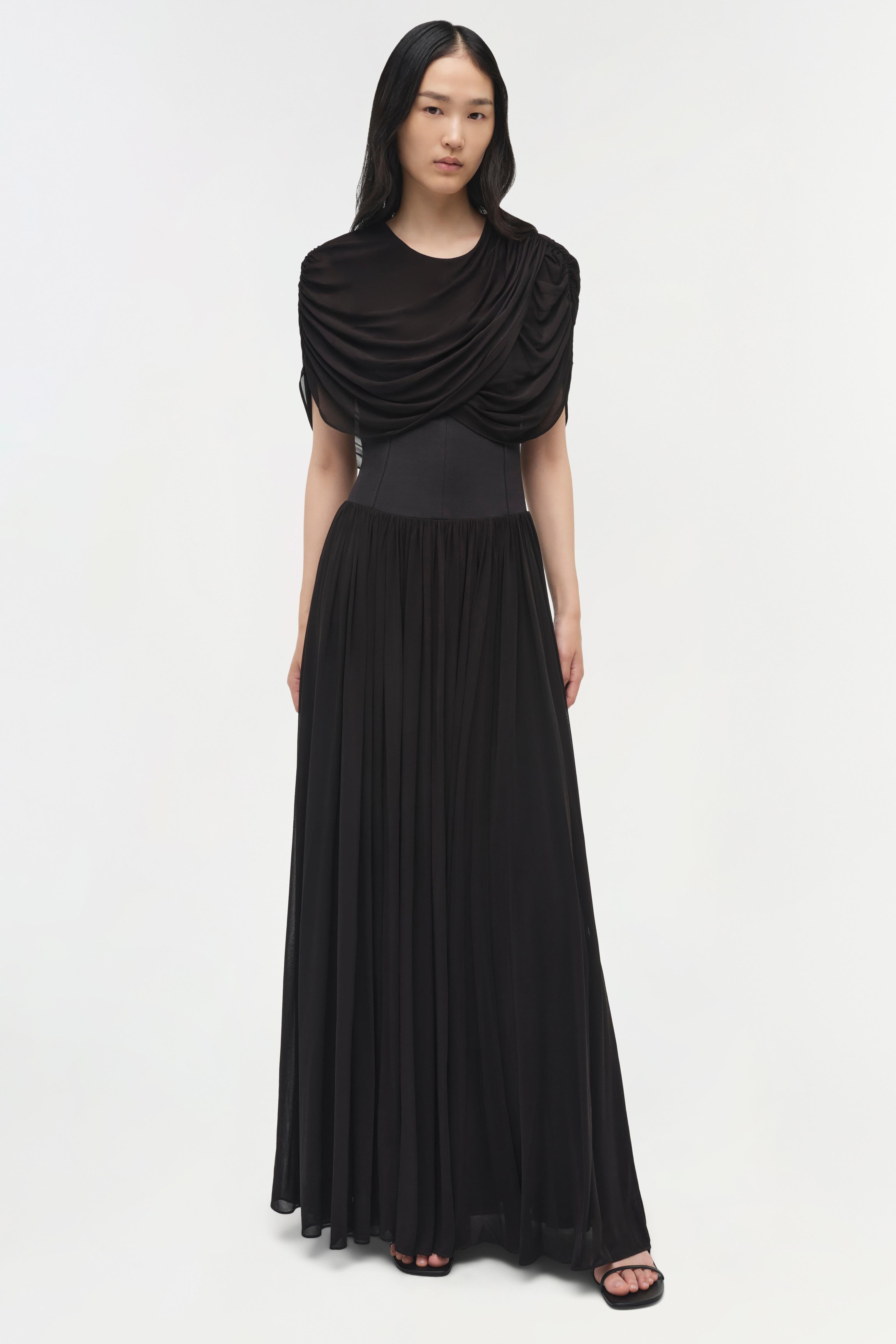 Crafted from a draped jersey, this gown embodies an architectural ease with a timeless sensuality. The maxi length and fluid drape elongate the silhouette, while the cape-inspired back adds a whisper of drama and effortless elegance.