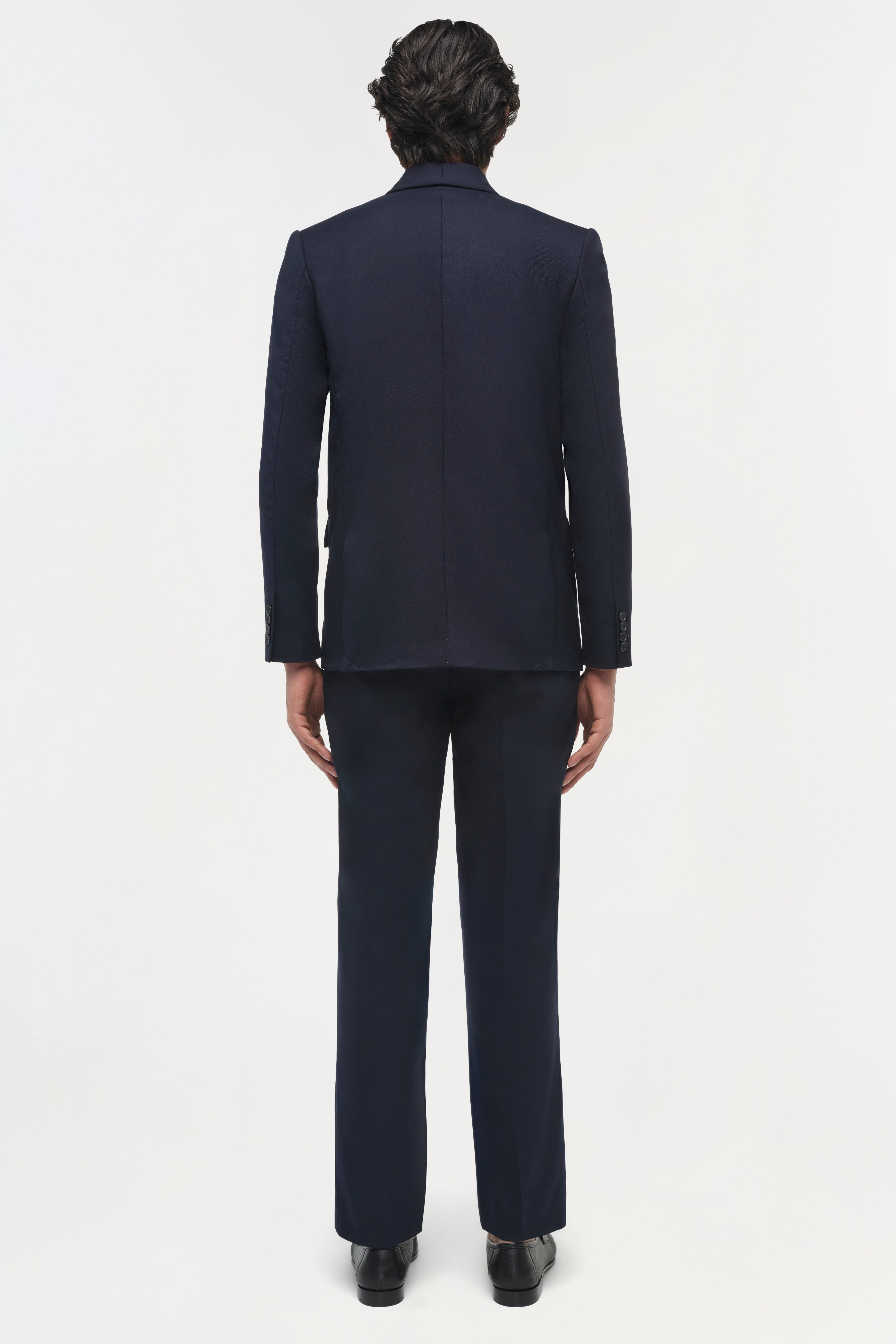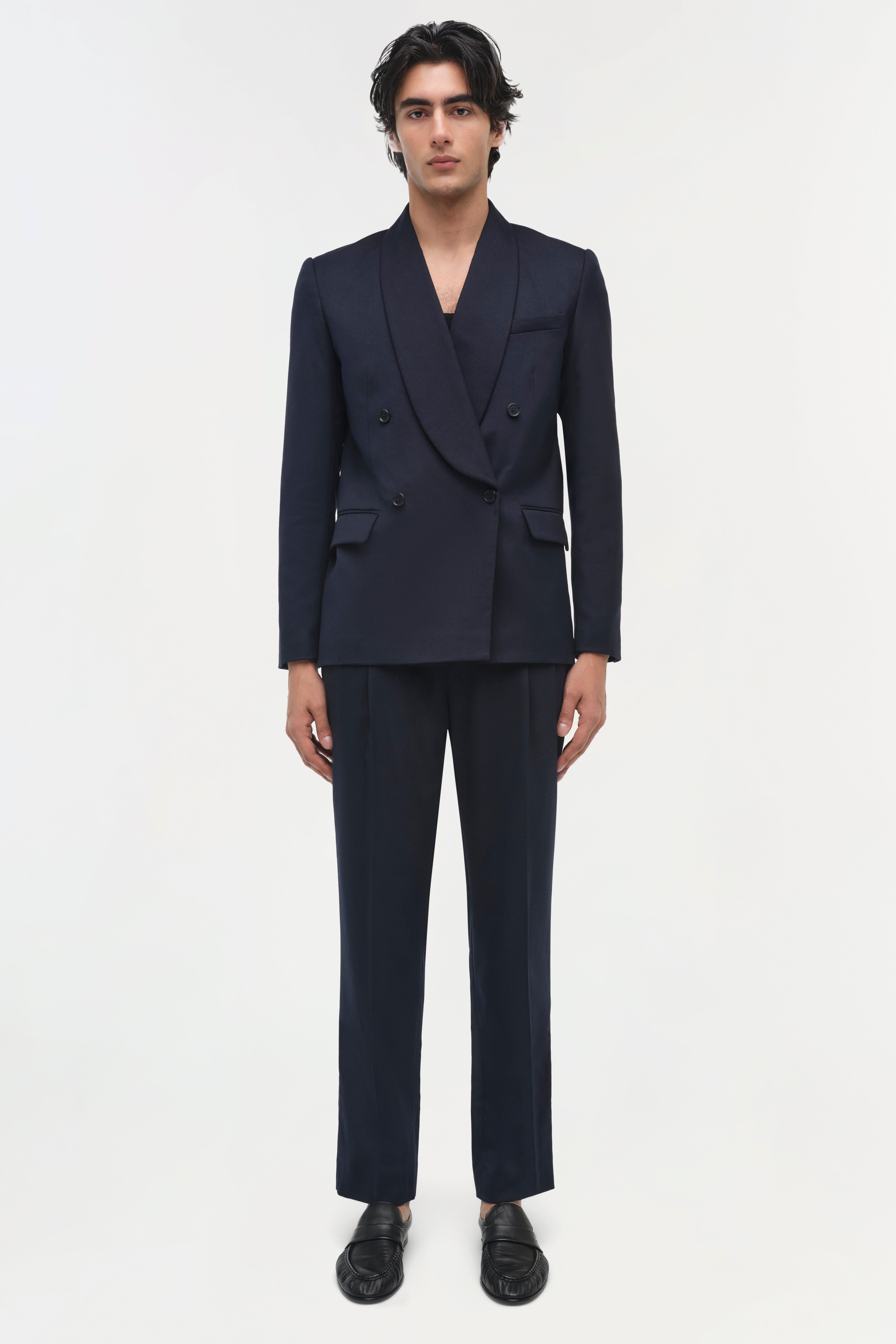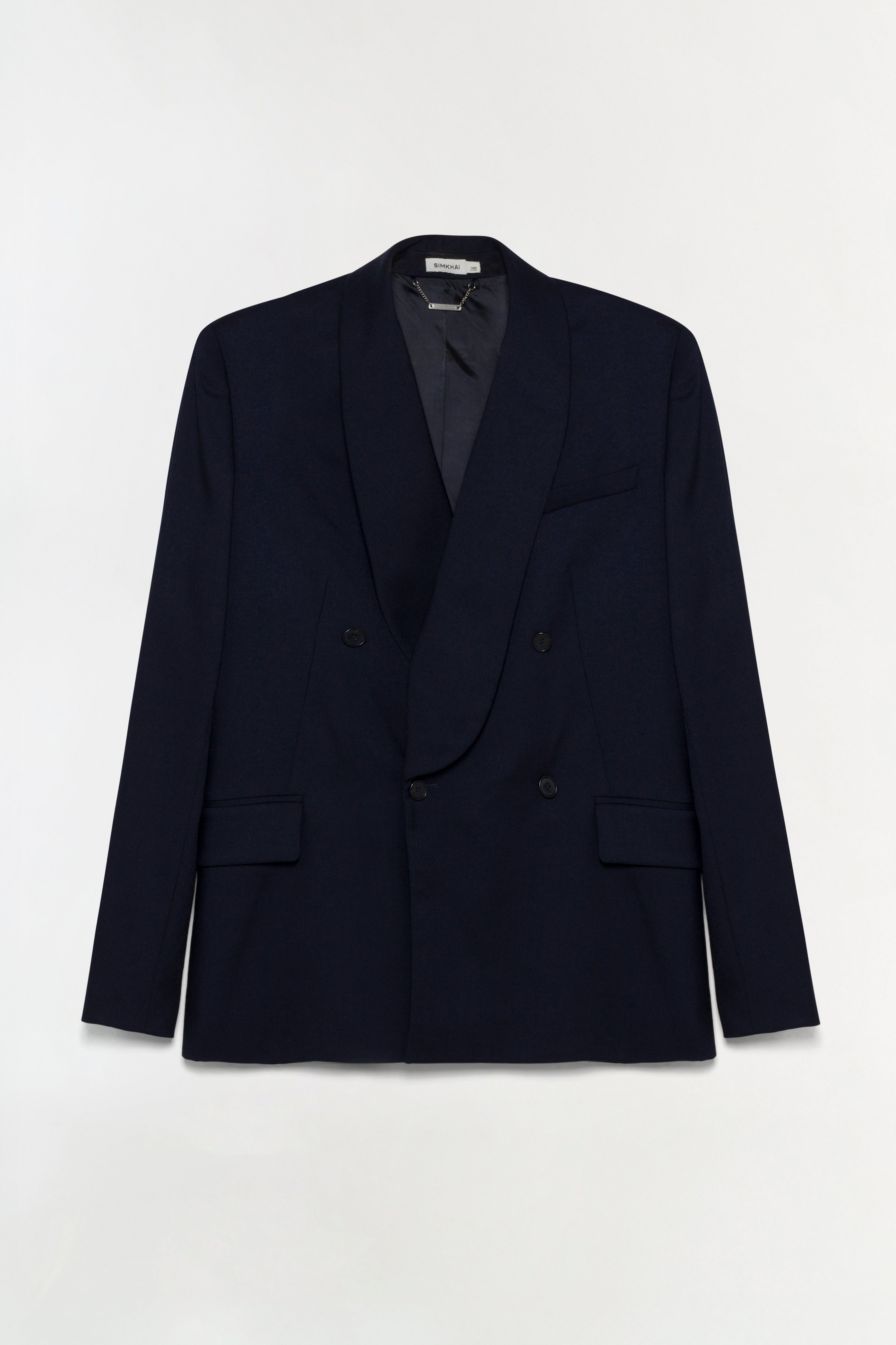 Tailored in a sleek suiting fabrication, this blazer offers a sharp, modern fit. The double-breasted construction and sculpted shawl collar elevate the shape, highlighting the precision of its tailoring.