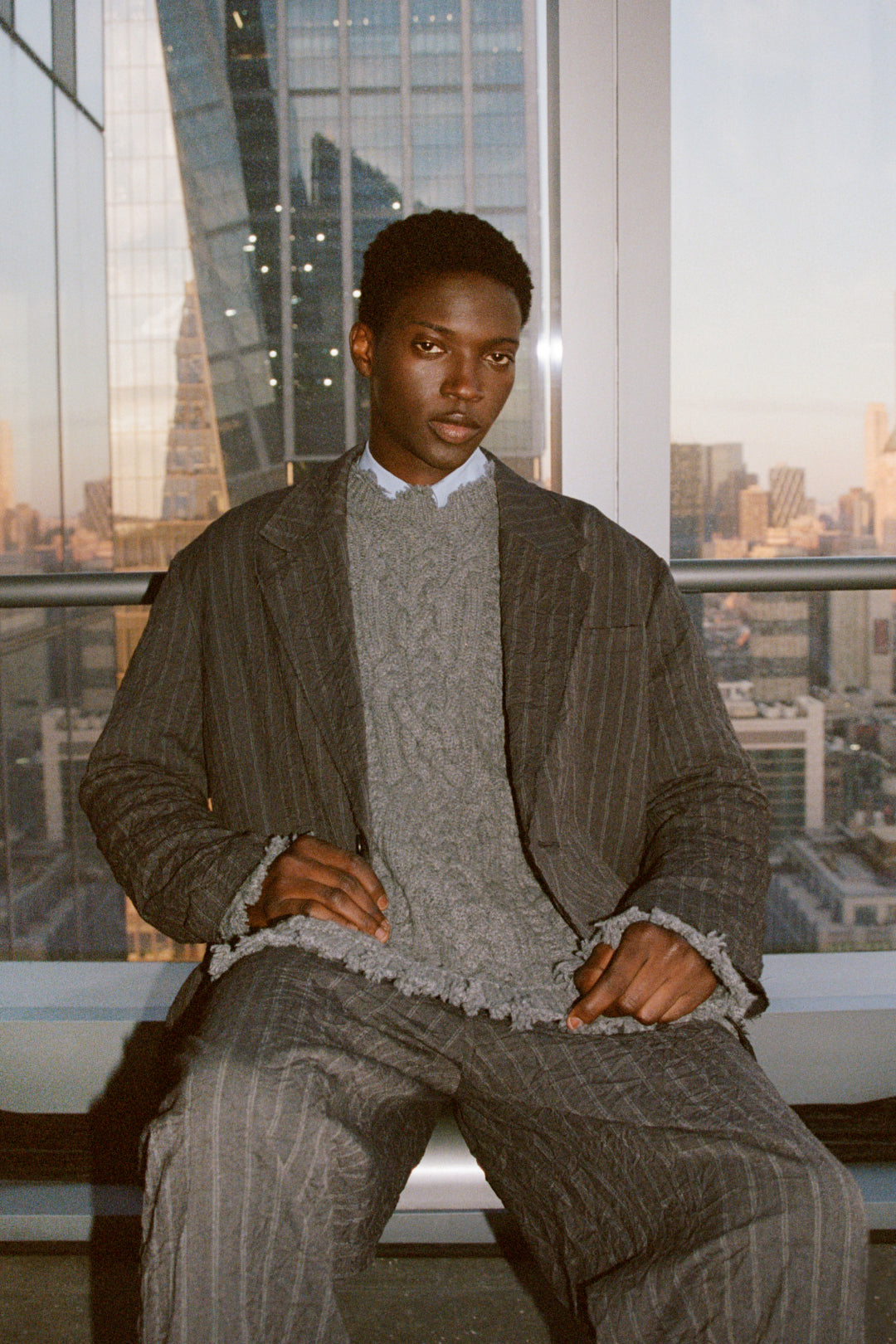 Cut in pinstriped suiting with a crinkle finish, this single-breasted blazer balances sharp lines with relaxed texture. Designed with a notched lapel, front buttons, and welt pockets.