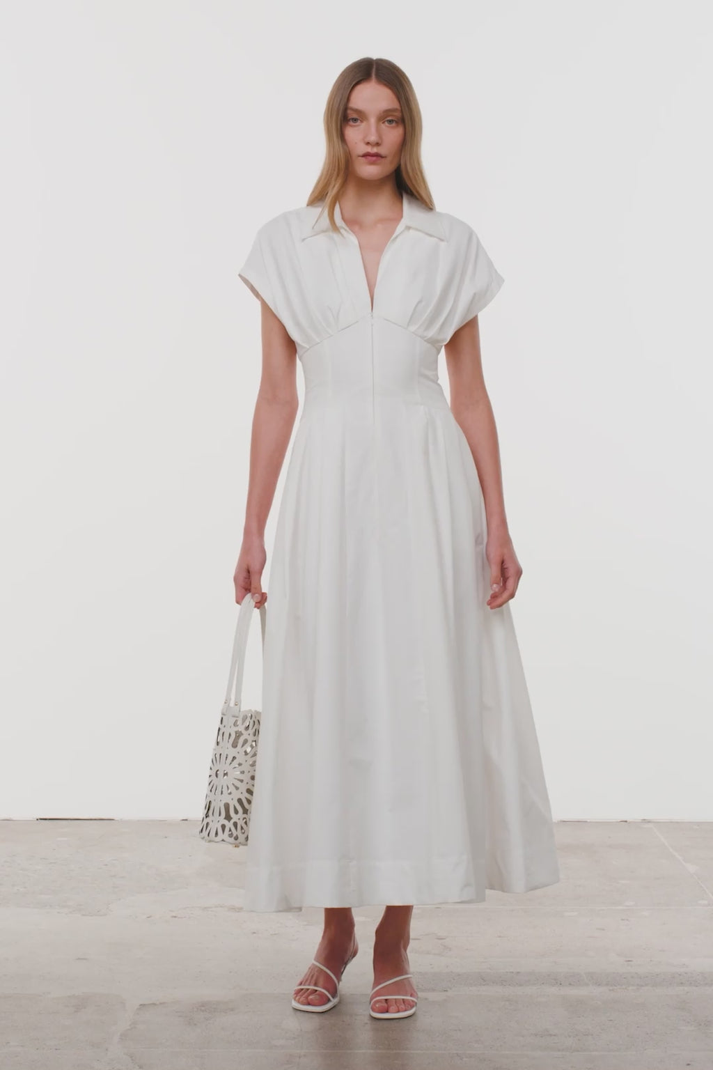 Crafted in crisp cotton faille, this dress holds it shape while offering effortless comfort. The midi-length silhouette falls with subtle ease, softly defining the waist of a polished, understated look.