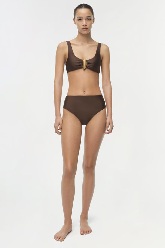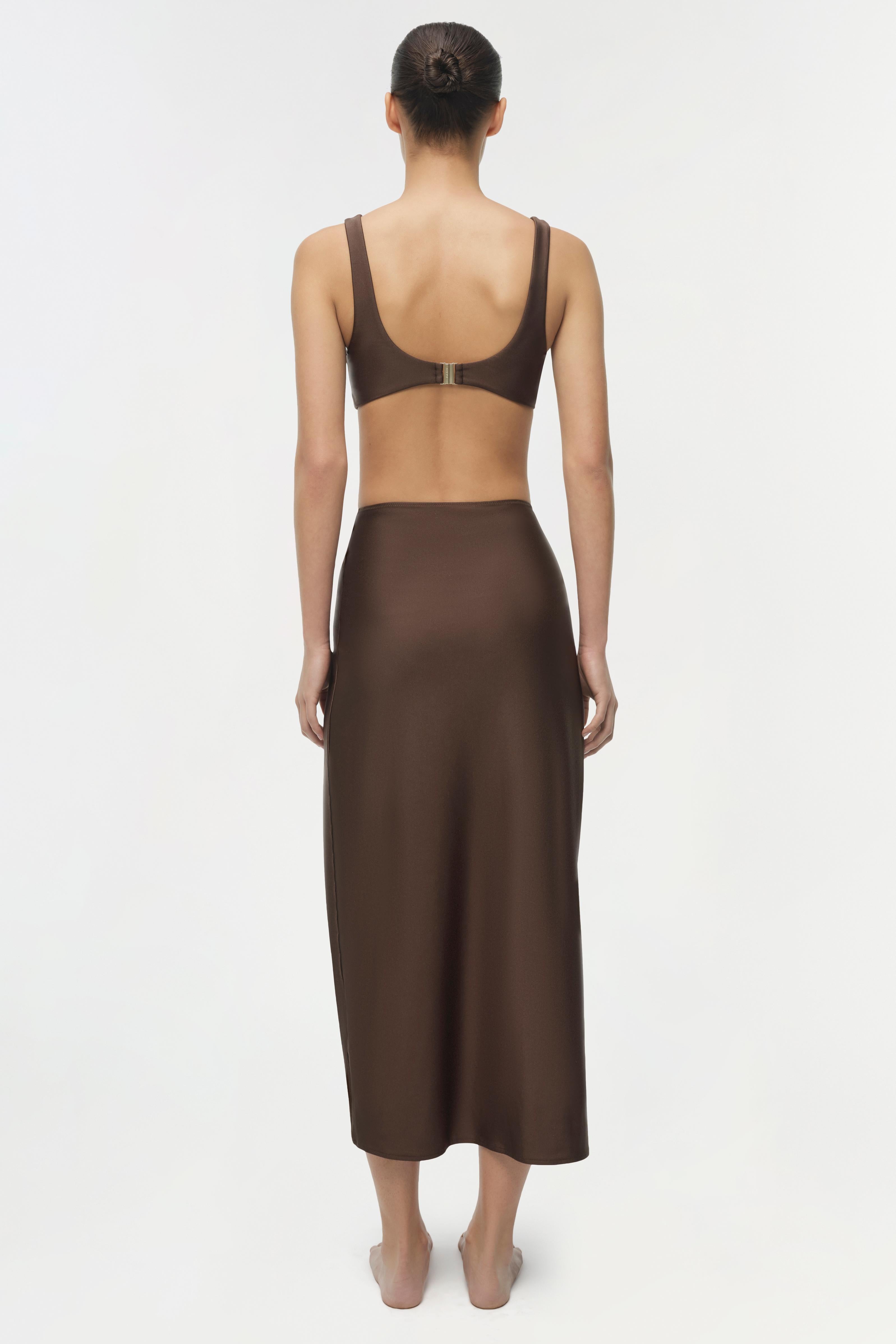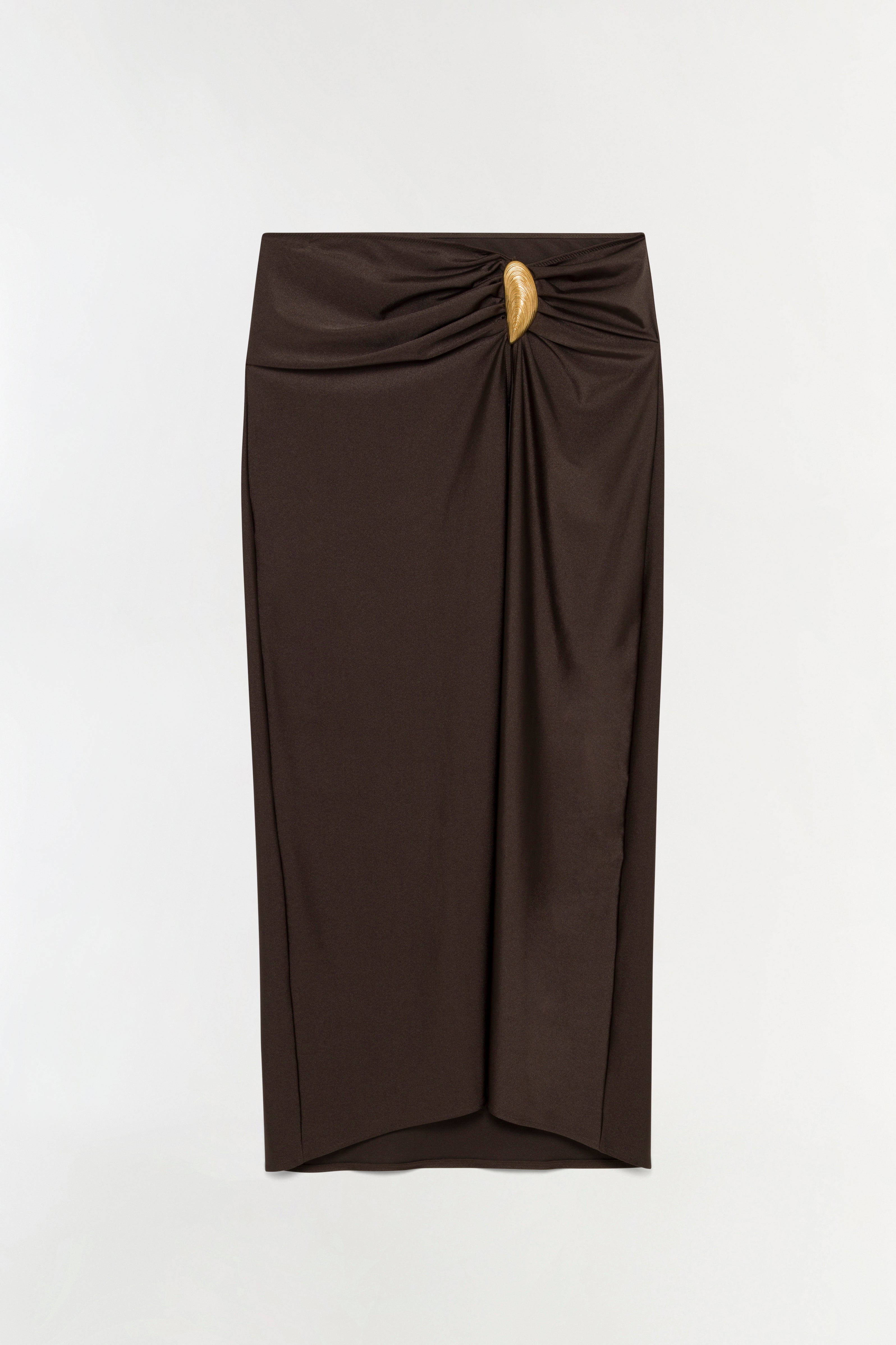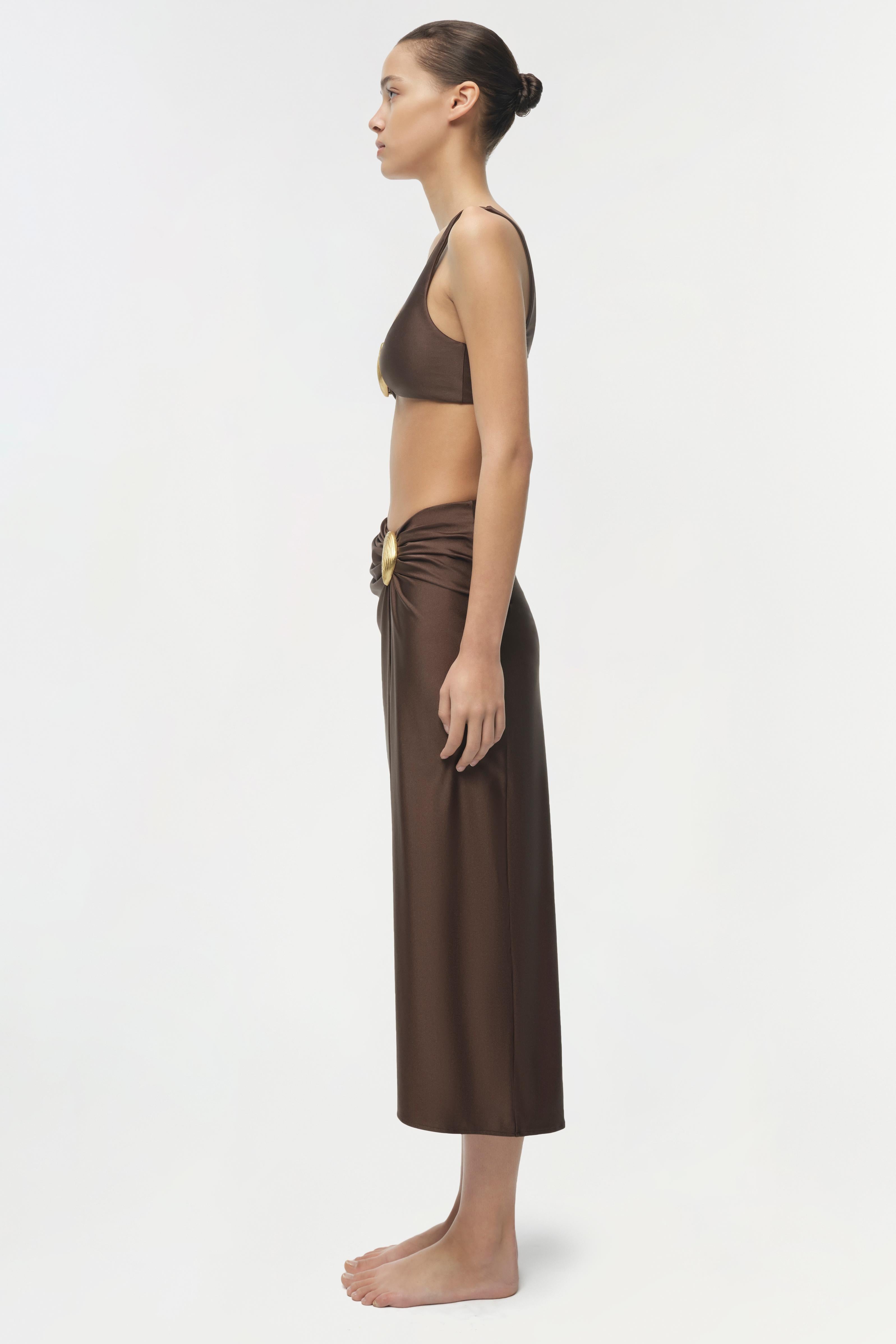 The Eiana Shell Midi Skirt in Chocolate. Cut from a smooth stretch fabric with a subtle satin sheen, this skirt is shaped with a softly ruched waist, secured by a shell accent detail. The midi length and high slit make it effortless to layer over a bikini, offering a versatile silhouette that balances coverage with fluid movement.