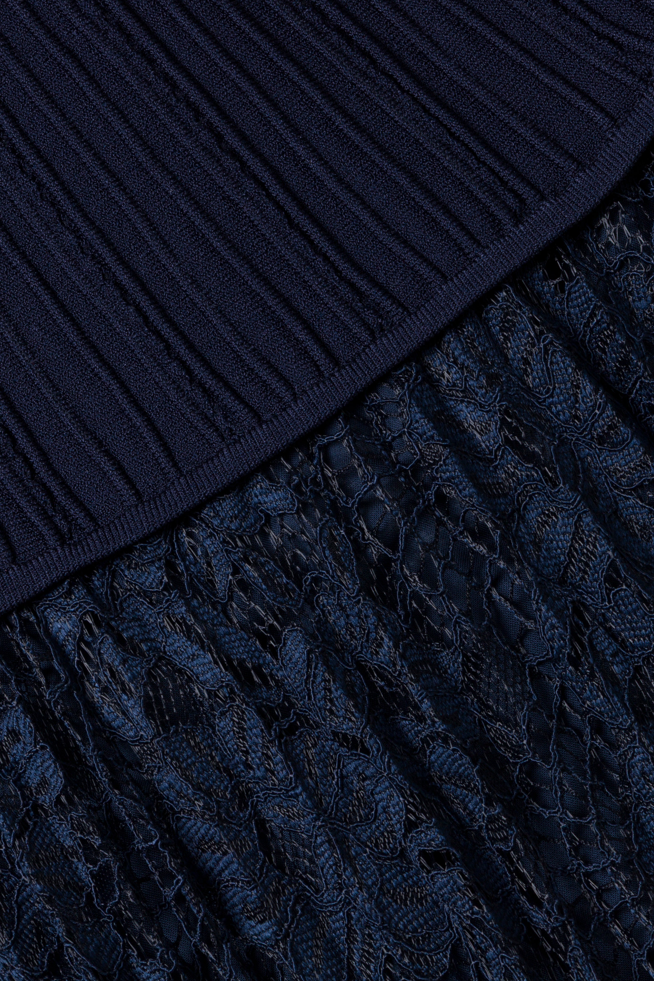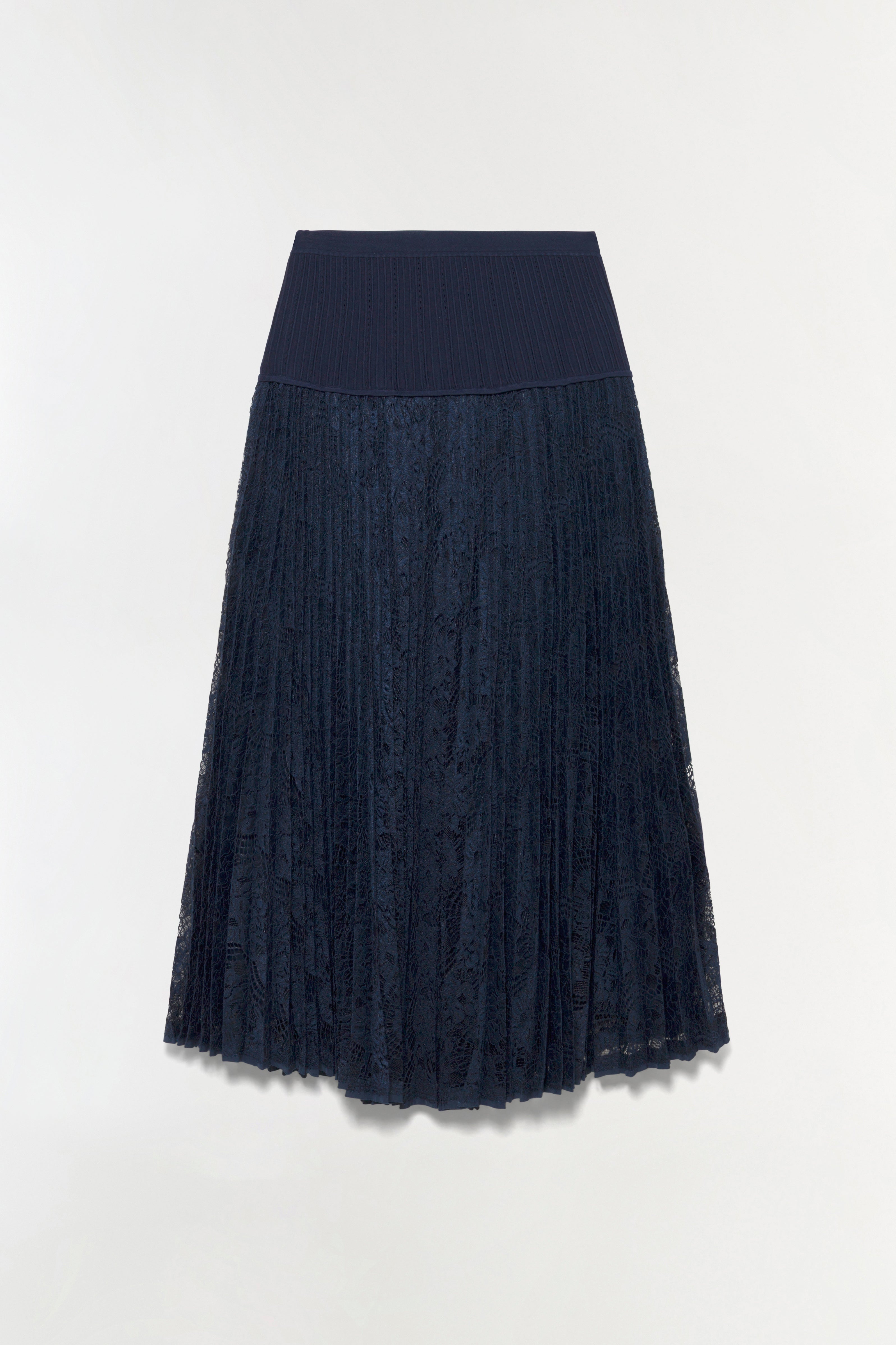 The Verona Lace Midi Skirt in Midnight. This lace midi skirt features soft seams and a waistband that contours the waist and opens into an A-line silhouette for a fluid, mid-length finish in pleats and lace.