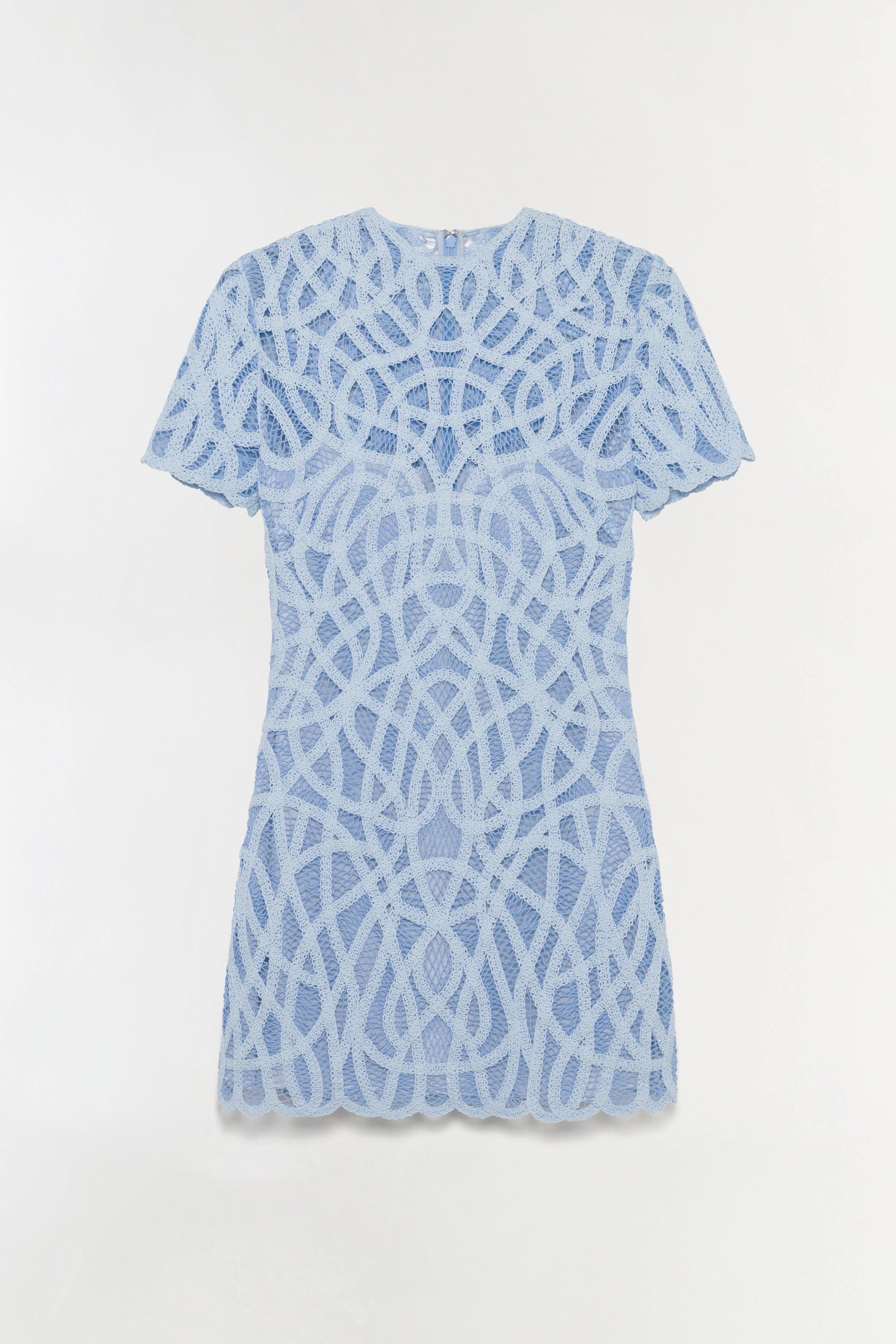 Crafted in botanical macramé embroidery, this mock-neck mini dress balances structure with sleek elegance. Short sleeves and precise detailing define a refined silhouette.