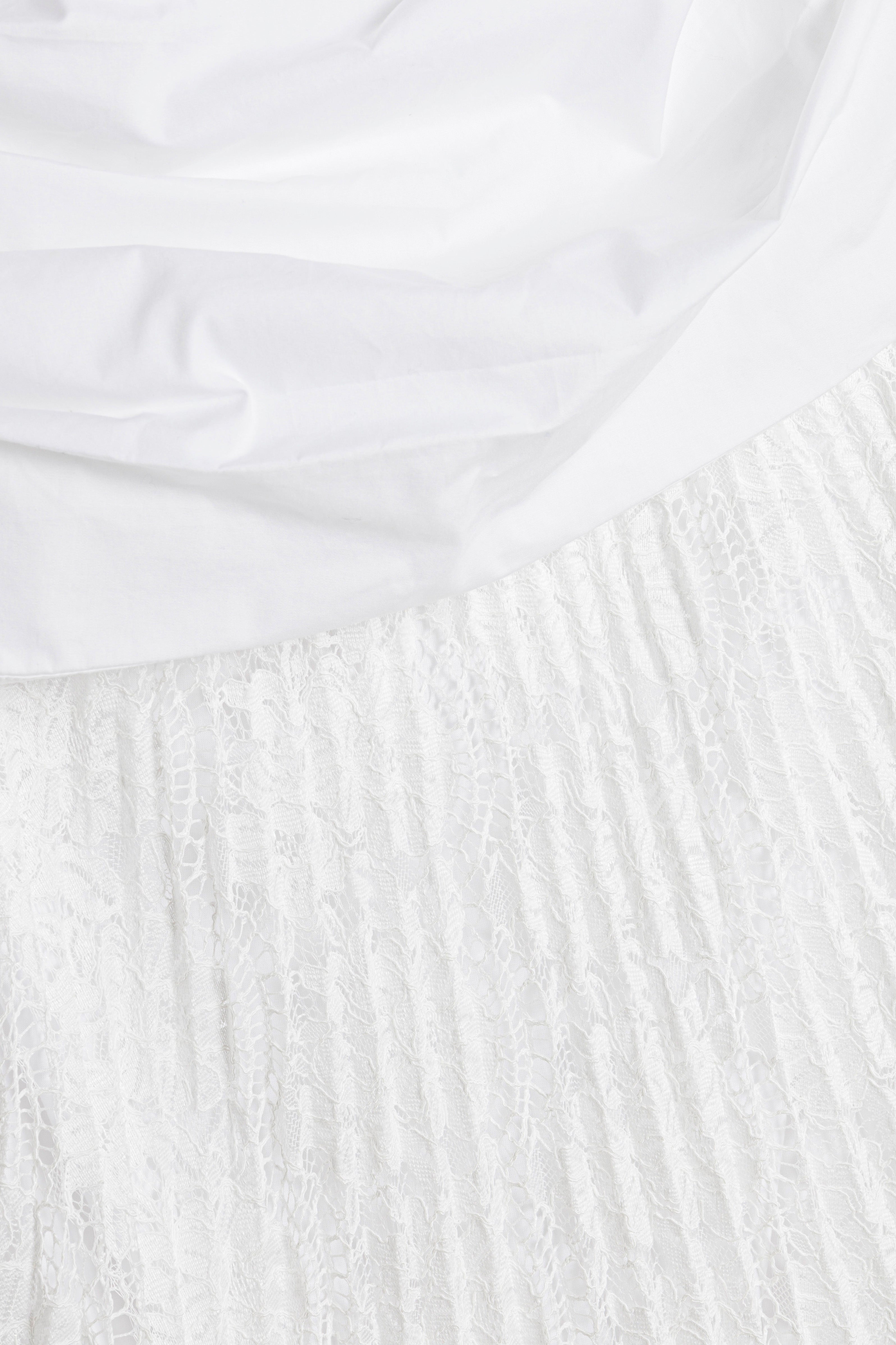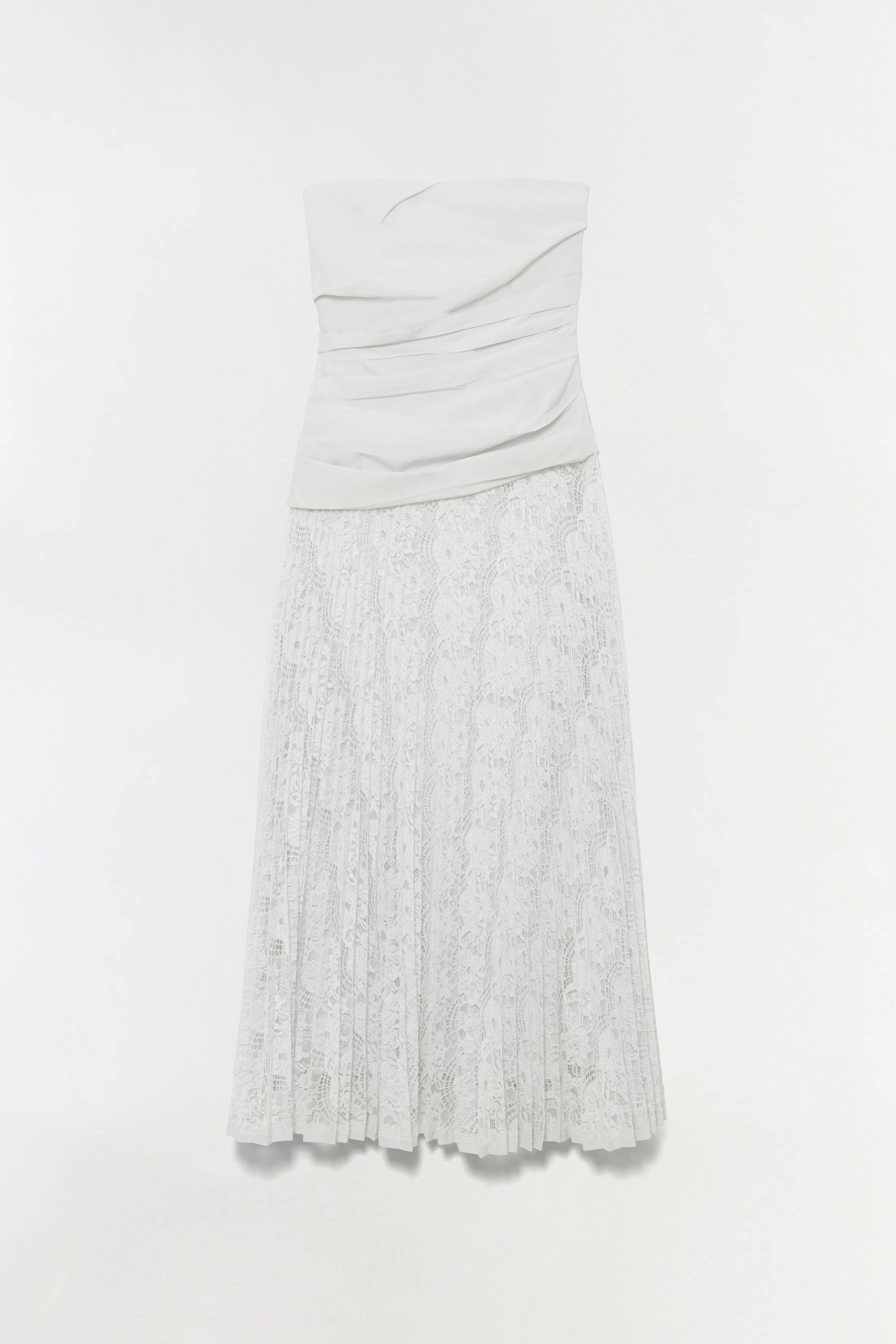 The Annalise Cotton Lace Midi Dress in Ivory. Crafted from a mix of pointelle knit and cotton poplin, this midi dress features a strapless bustier, sculpted bodice and flowing pleated lace skirt.