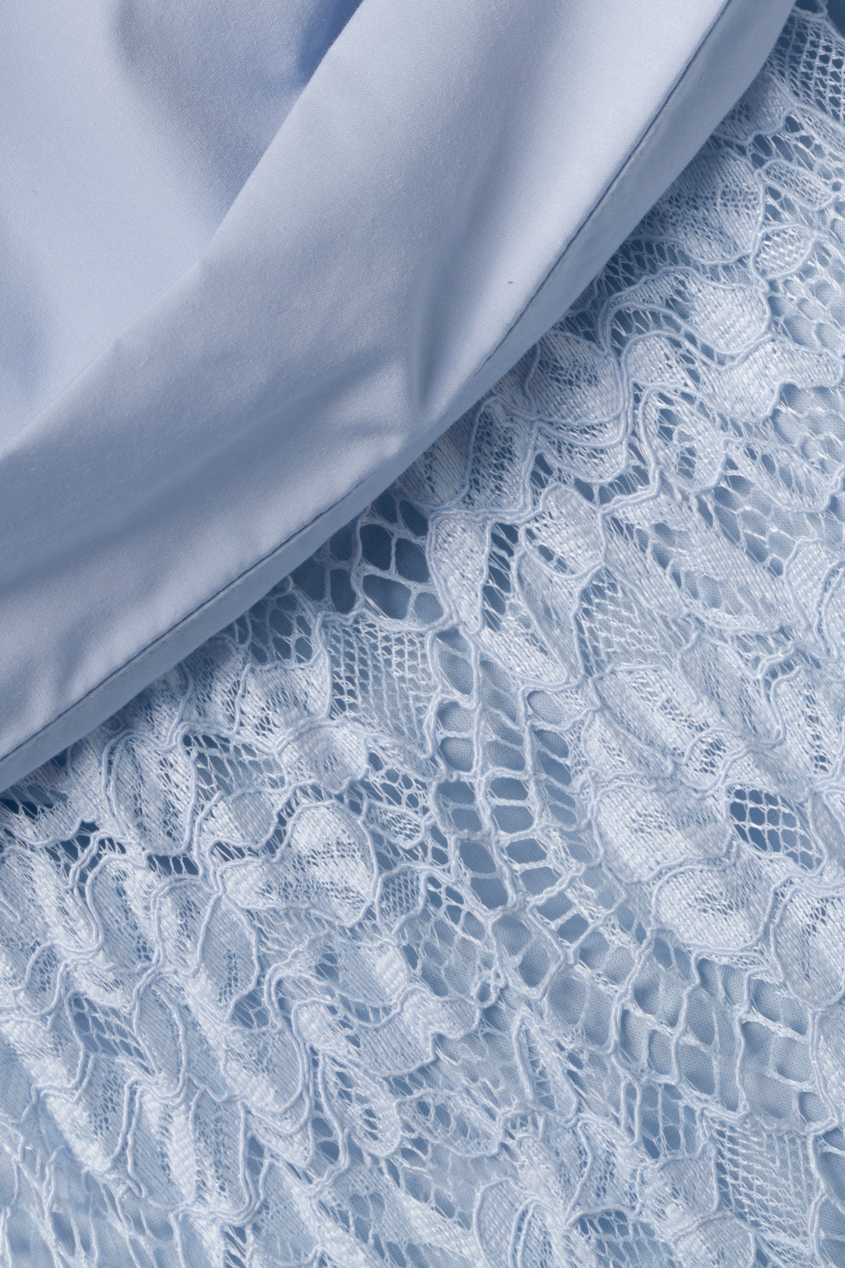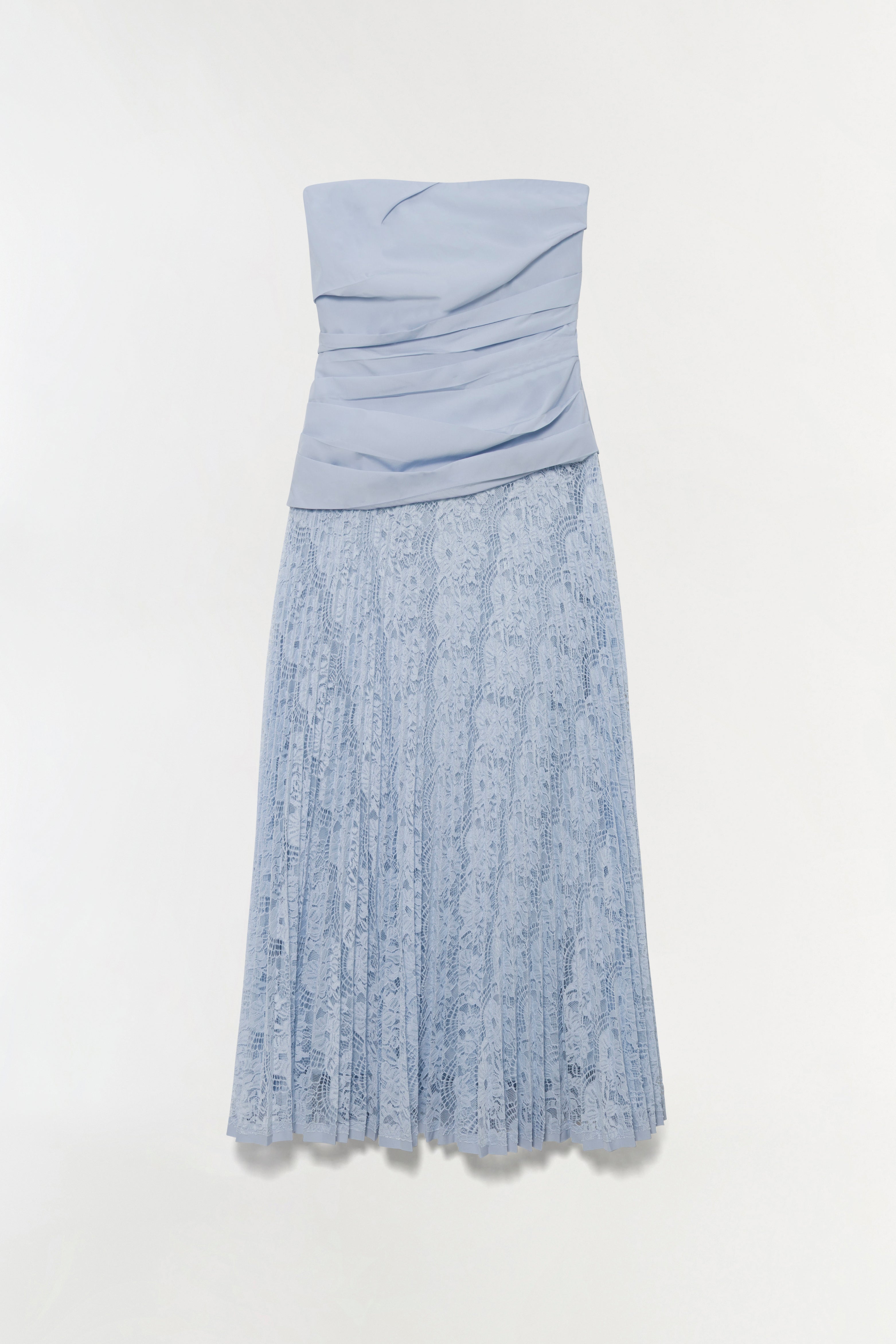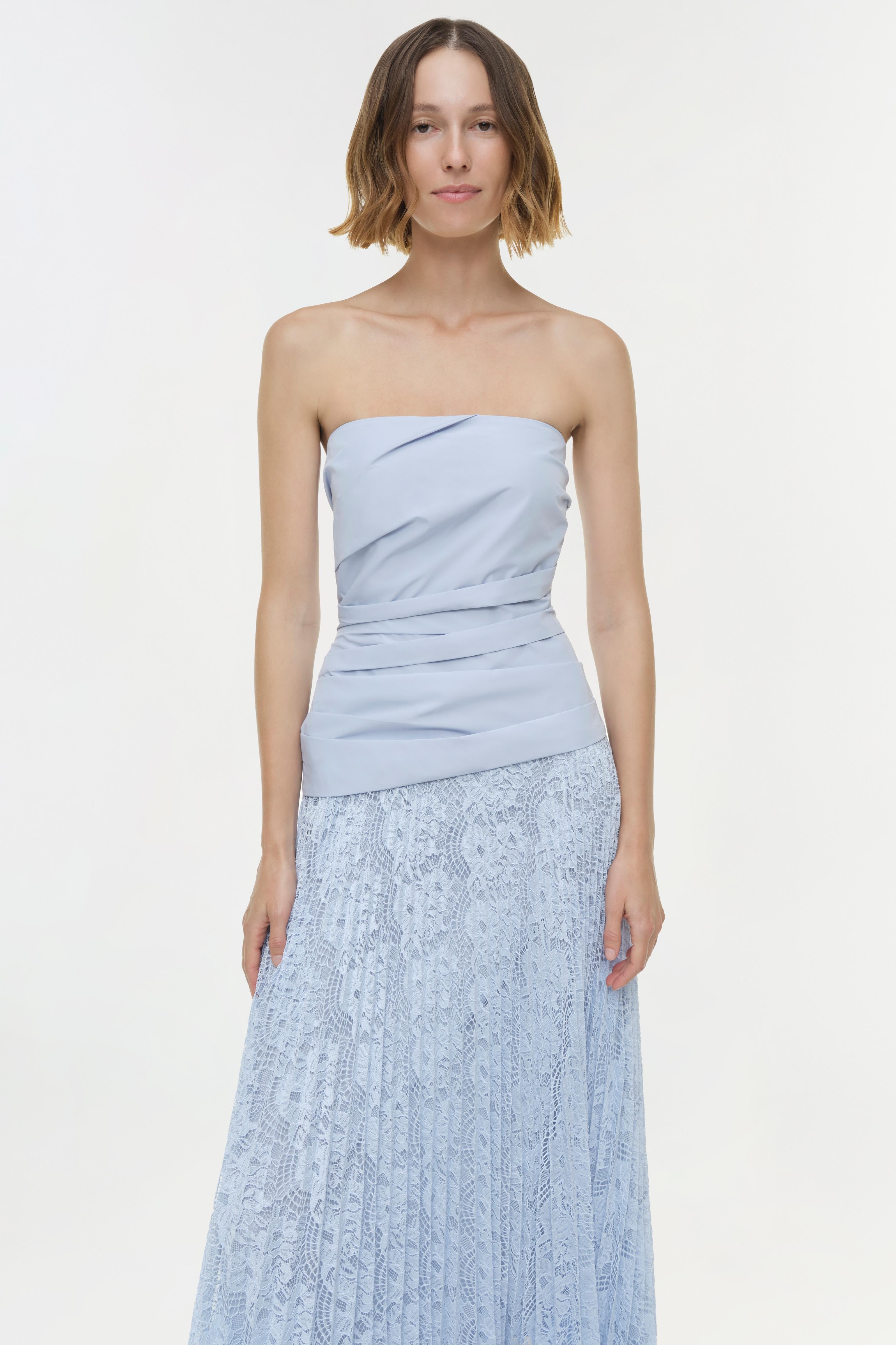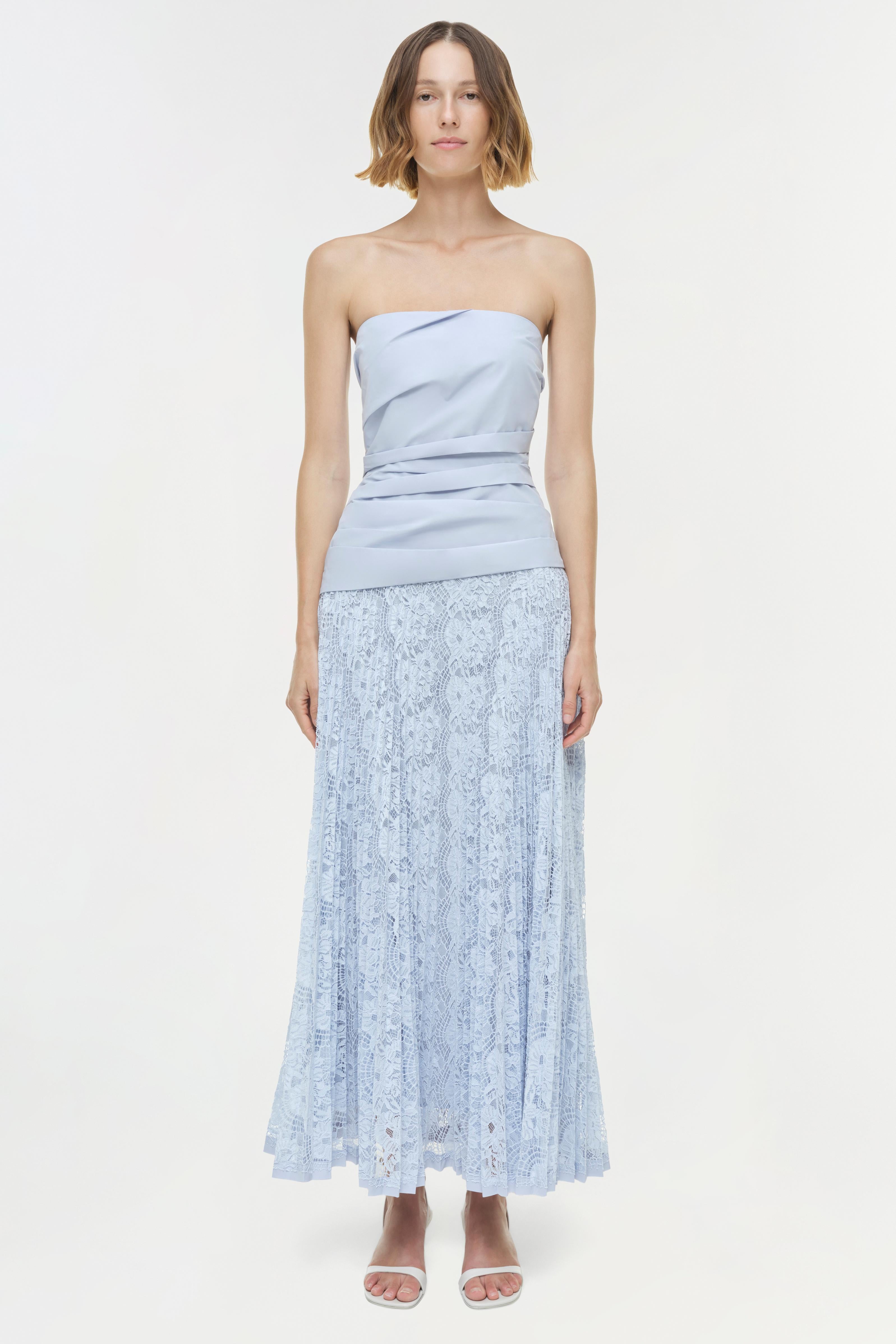 The Annalise Cotton Lace Midi Dress in Periwinkle Sky. Crafted from a mix of pointelle knit and cotton poplin, this midi dress features a strapless bustier, sculpted bodice and flowing pleated lace skirt.