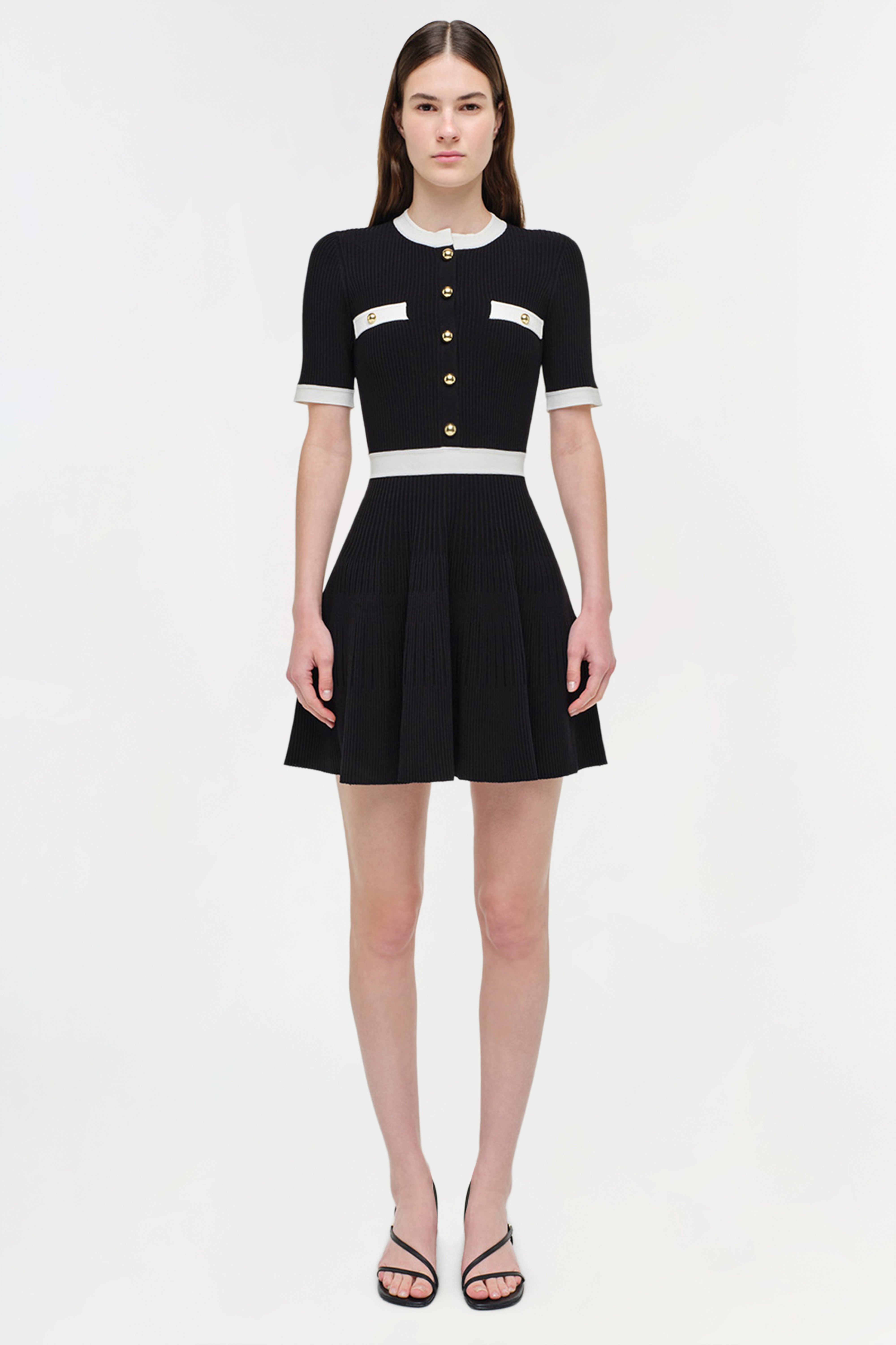 Cut in ribbed knit, this mini dress is framed with ivory trim and adorned with golden buttons down the front. A fitted waist gives way to a softly flared skirt. Classic details create a soft elegance in a dress thats as easy as it is graceful.