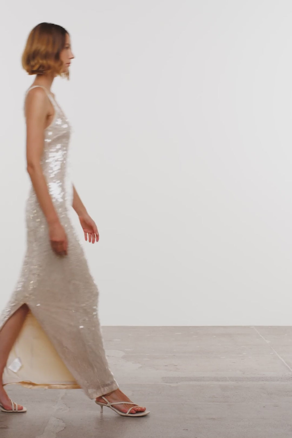 The Bex Dress in Champagne. This tank-style maxi is adorned with a sea of sequins, catching the light for a subtle yet captivating sparkle. The sleeveless cut and gentle scoop neckline provide a tasteful simplicity, with a straight fit that elegantly traces the body’s lines.