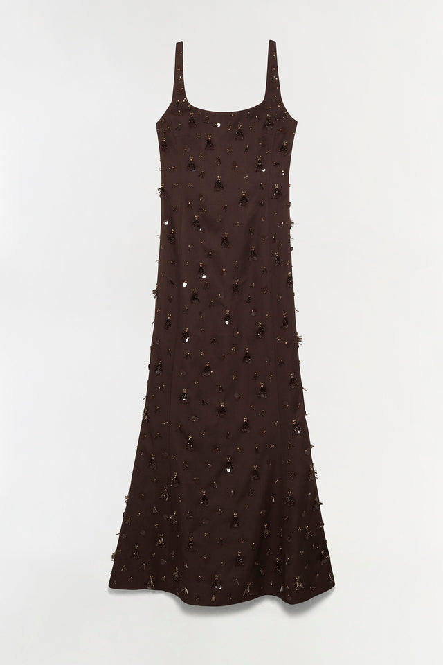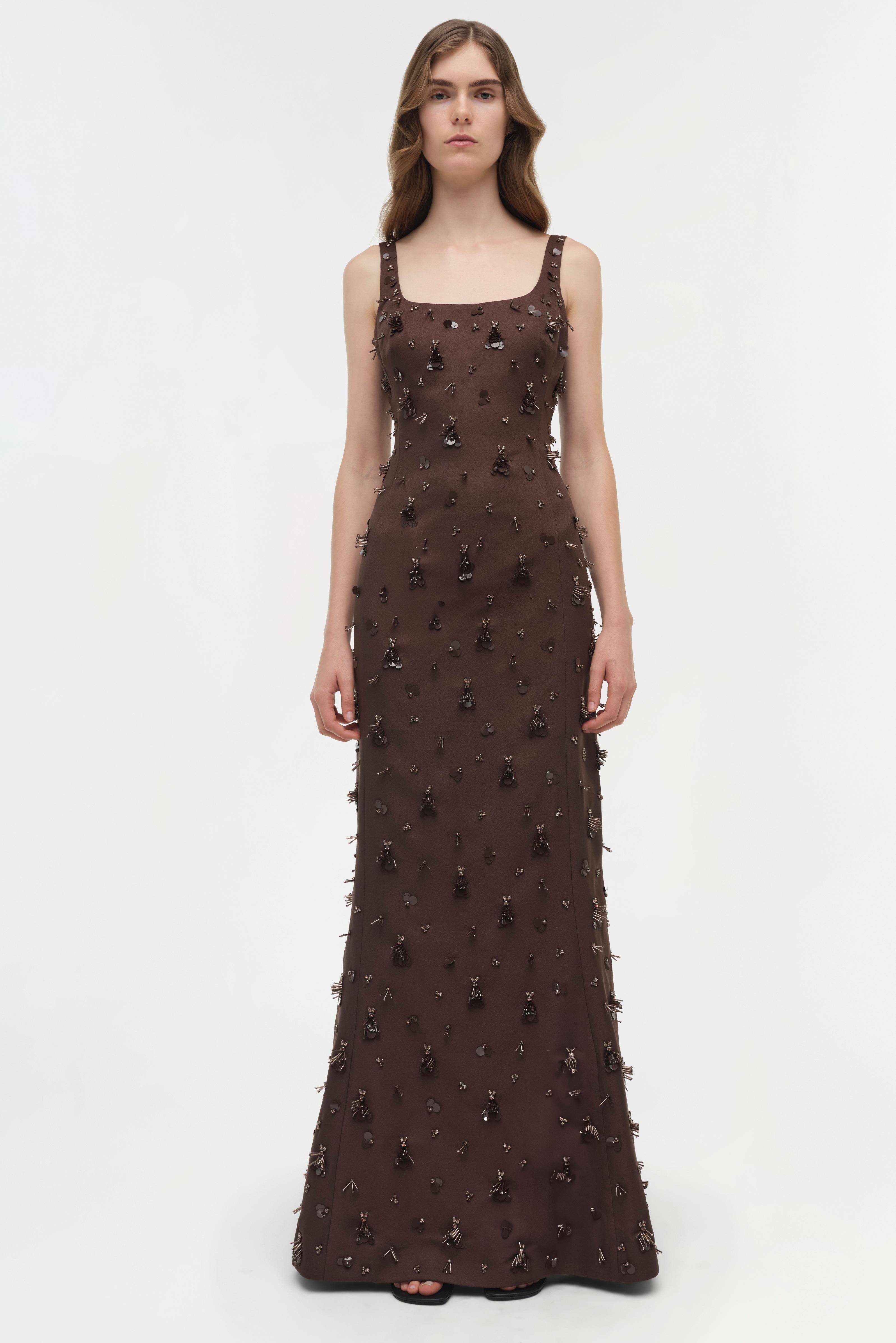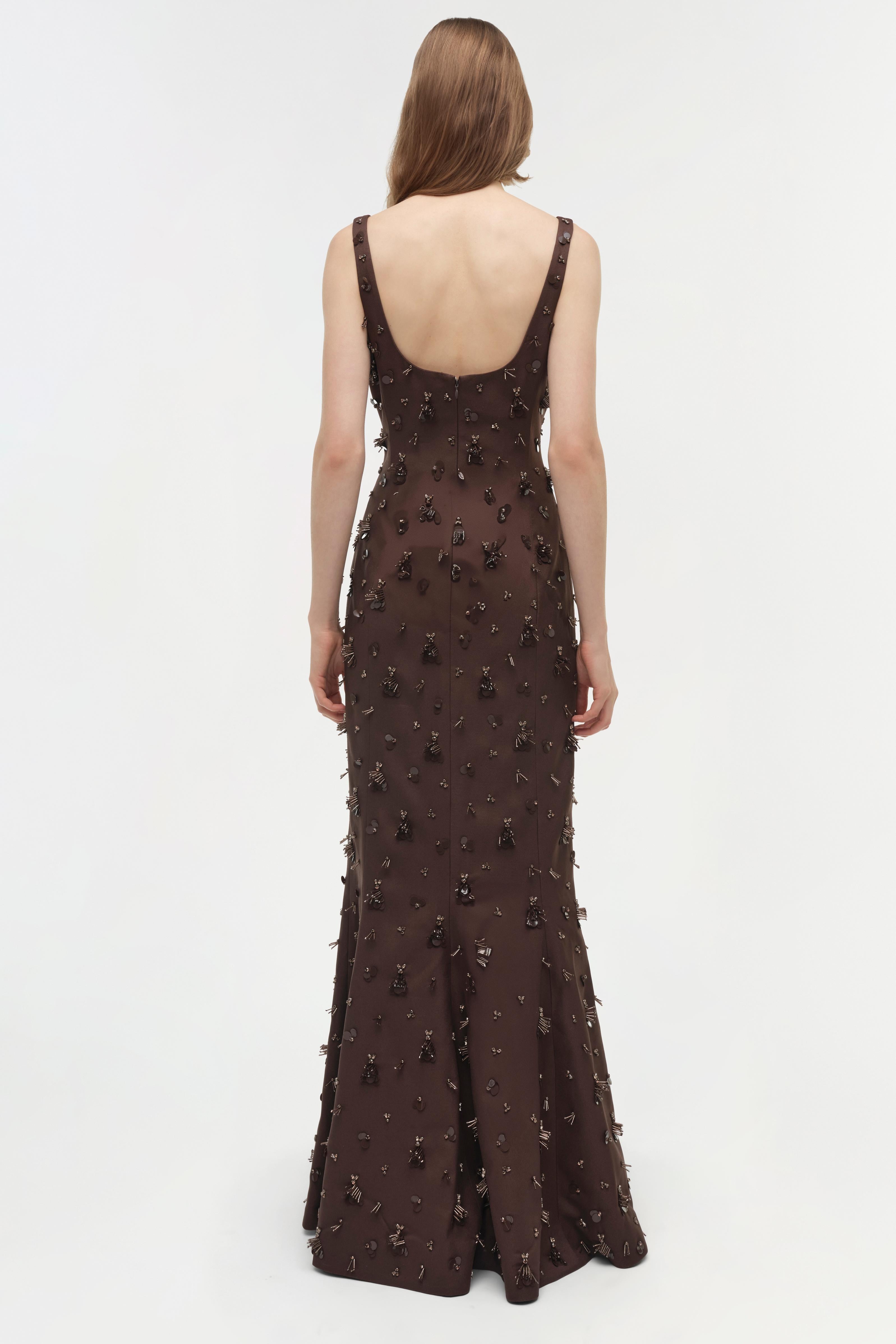 A floor length gown constructed from luxe crepe for an enviable drape. Studded all over with embellished details.