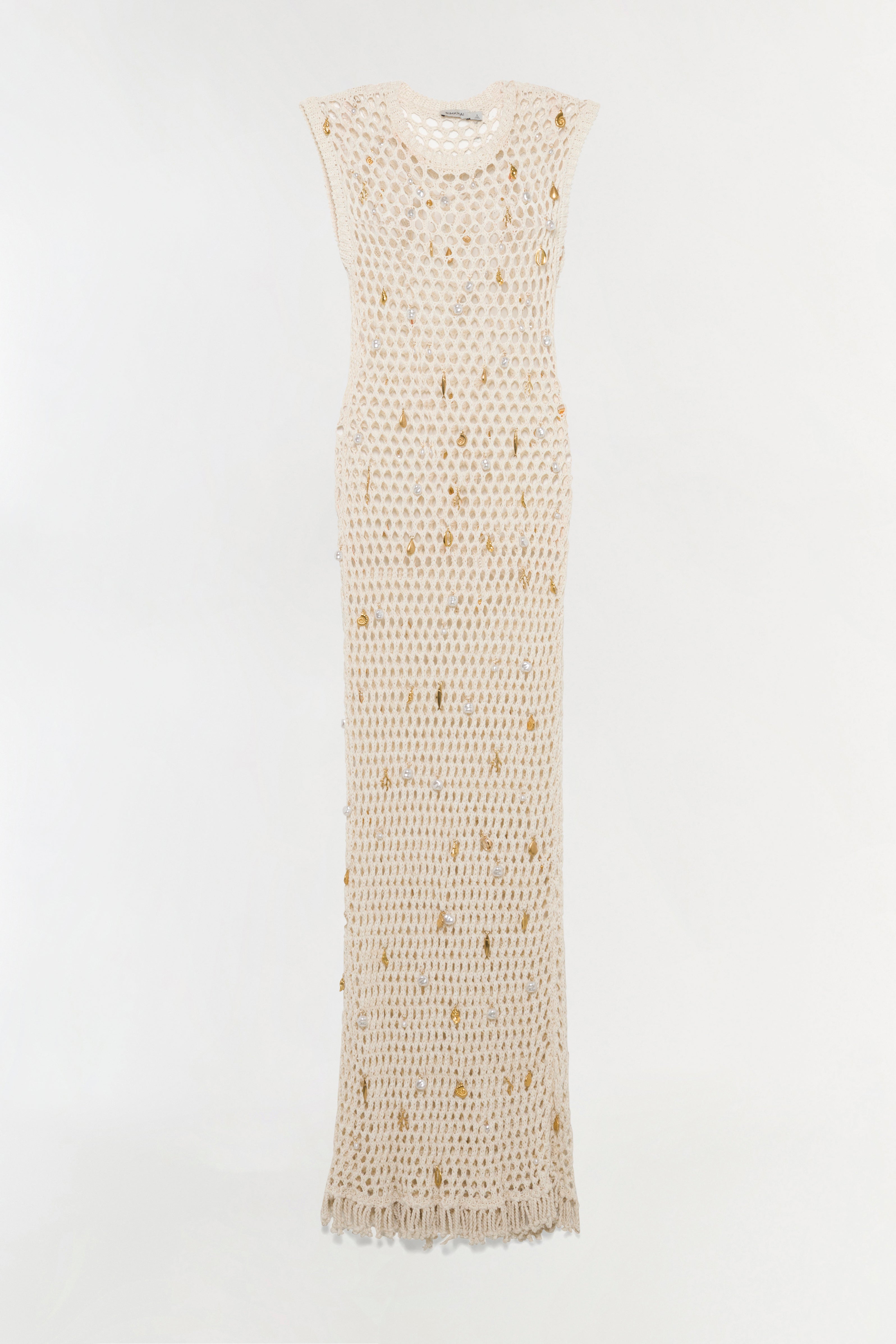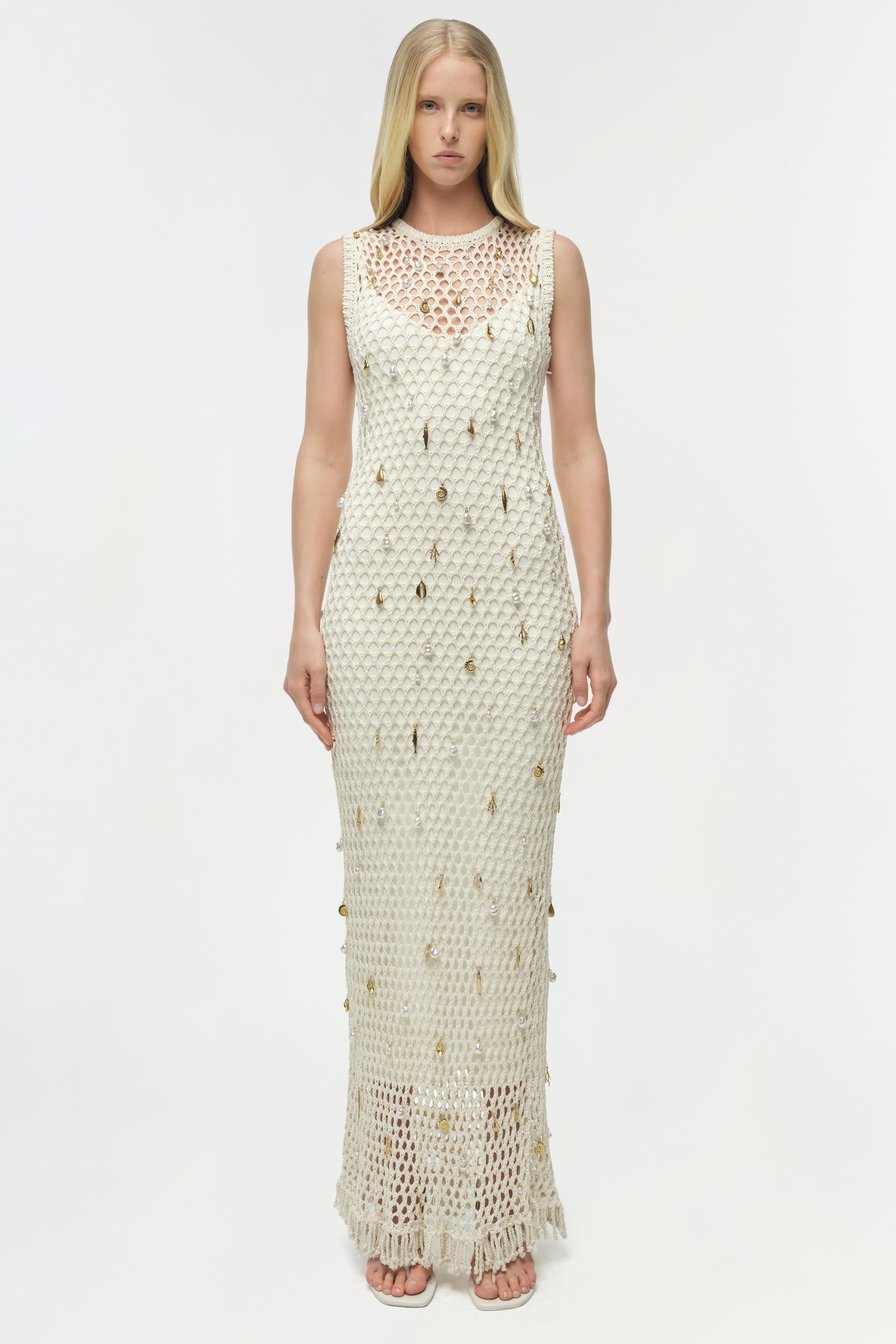 An open crochet knit charmed with treasures from the sea. Ribbed trim defines the neckline and shoulders, while a subtle fringed hem adds texture and movement. Light catches across the embellishments, adding texture and movement.