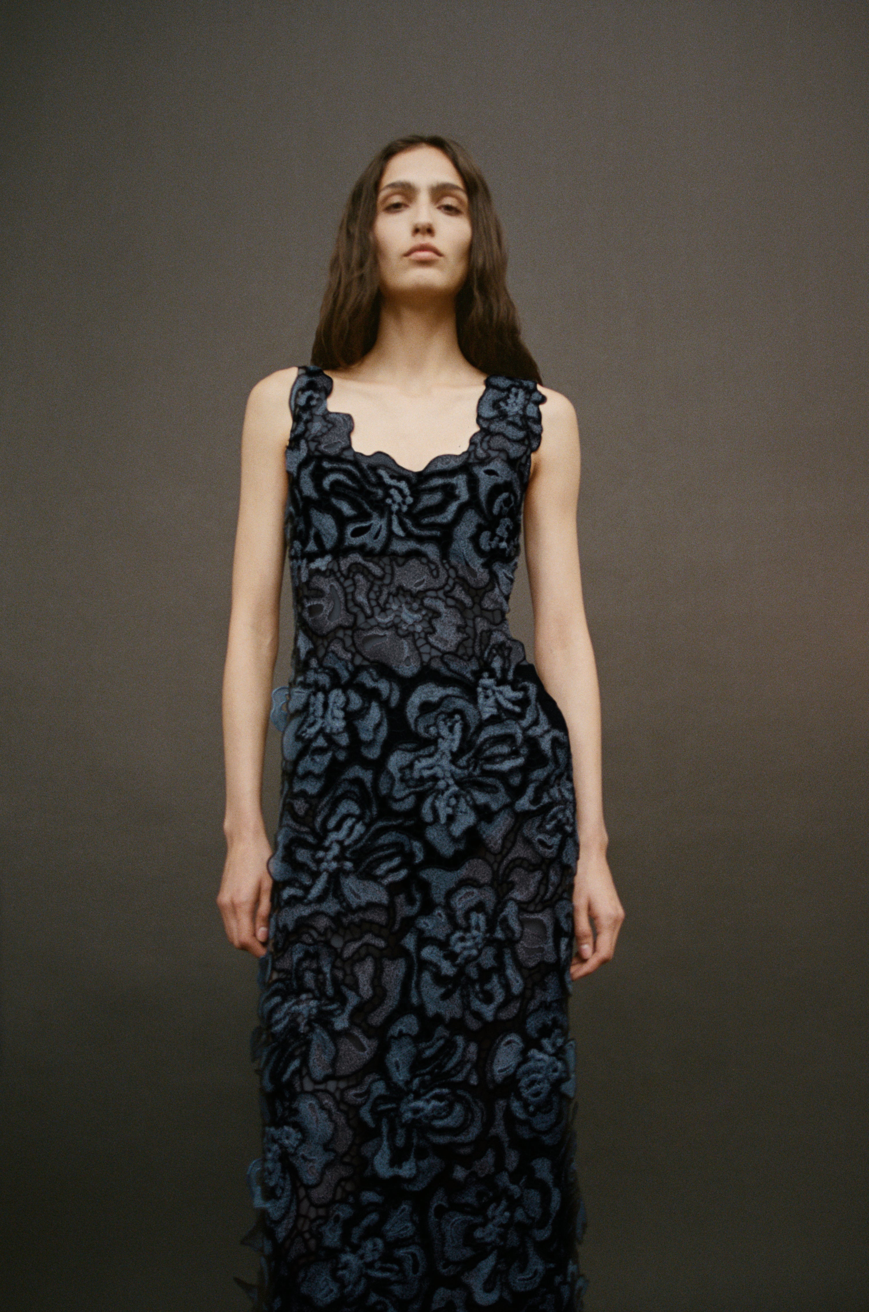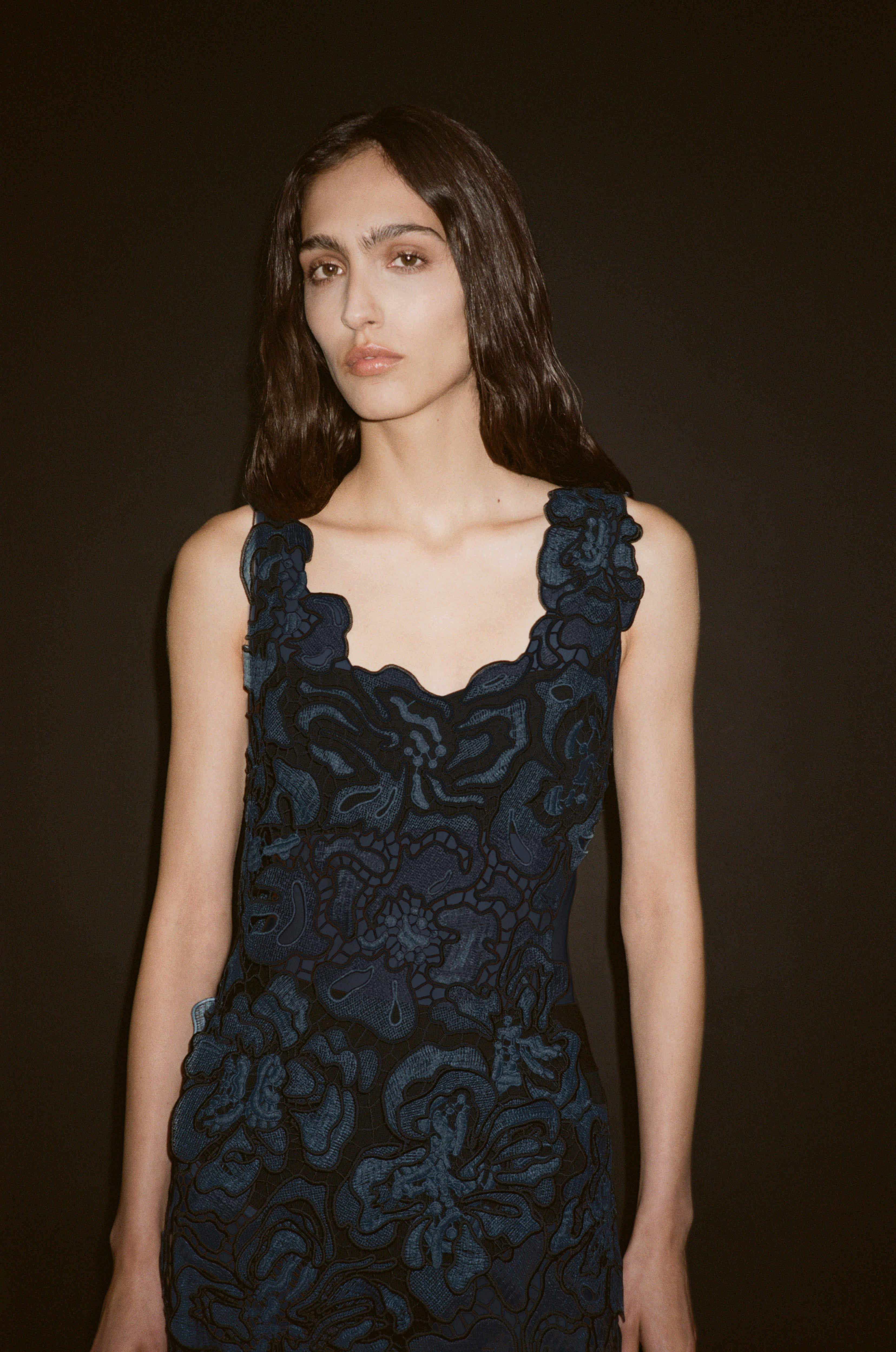 Rendered in coated guipure lace, this sleeveless silhouette features dimensional floral motifs and a delicate scoop neckline. Layered appliqué highlights the lace’s intricate texture, while a full length tonal lining provides coverage.
