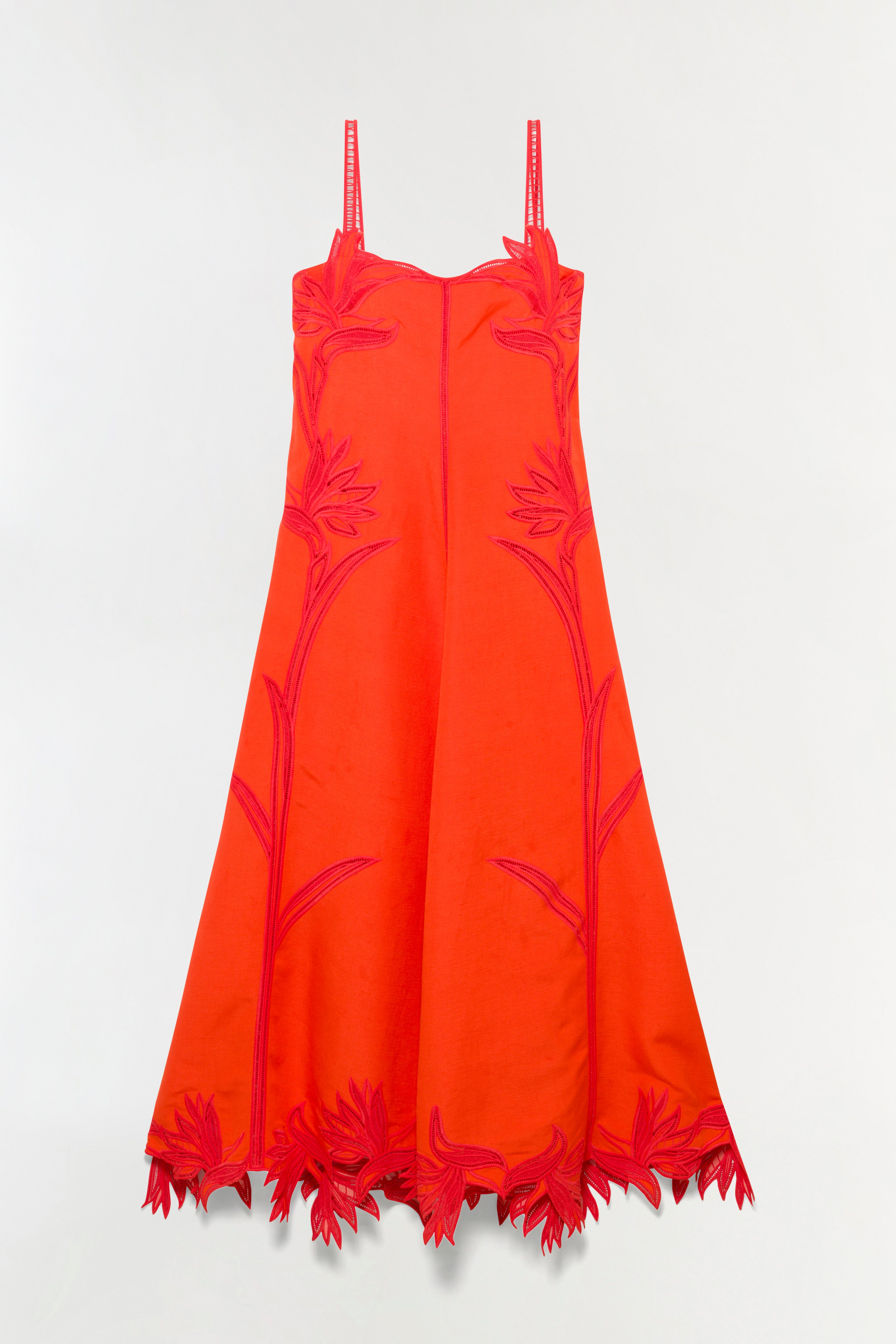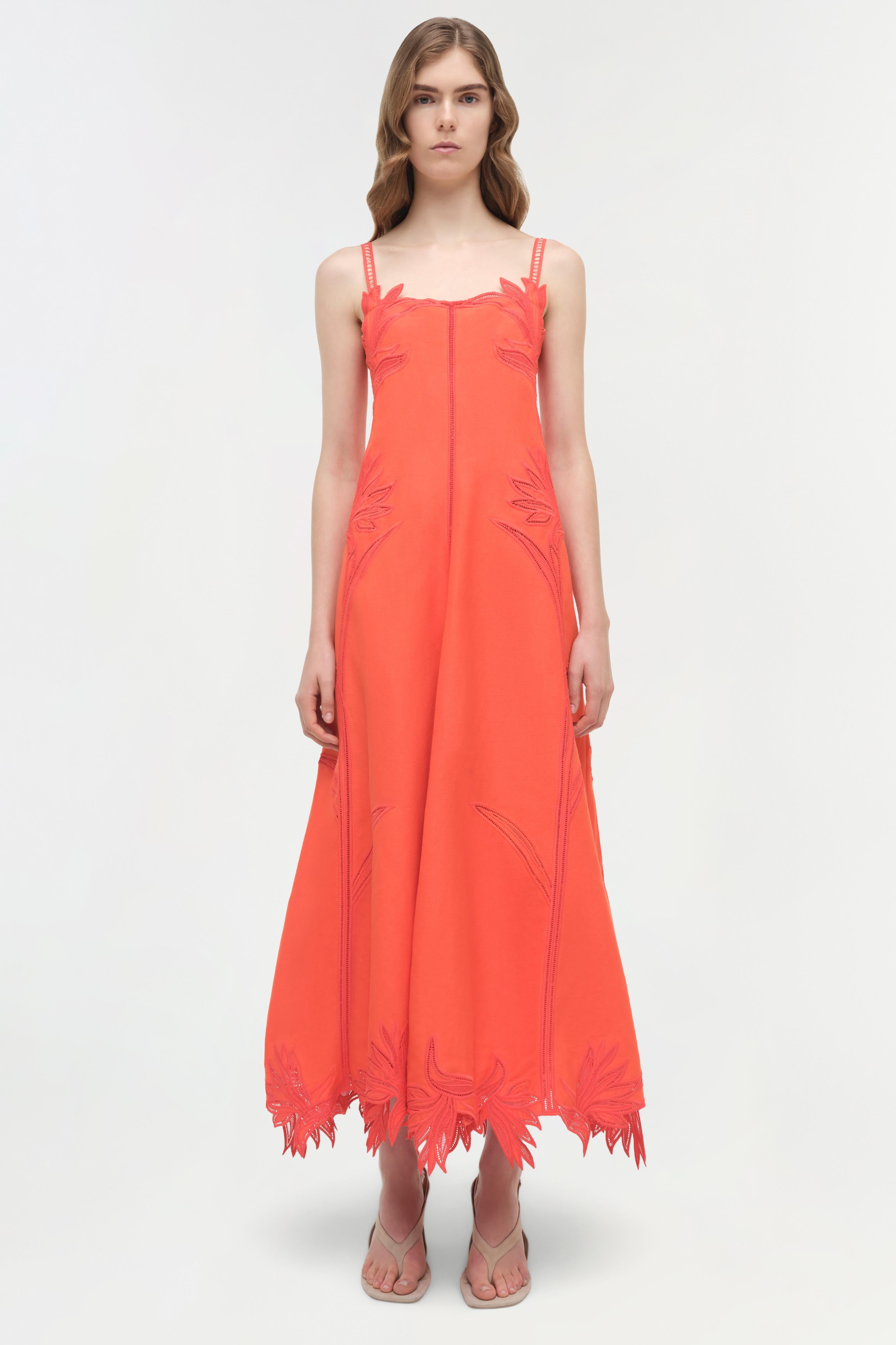 The Ellery Embroidered Bustier Midi Dress in Lobster. This midi dress is cut from linen-blend broderie anglaise and detailed with abstract floral embroidery. A central seam structures the dress while the raw-cut, uneven hem allows fluid movement.