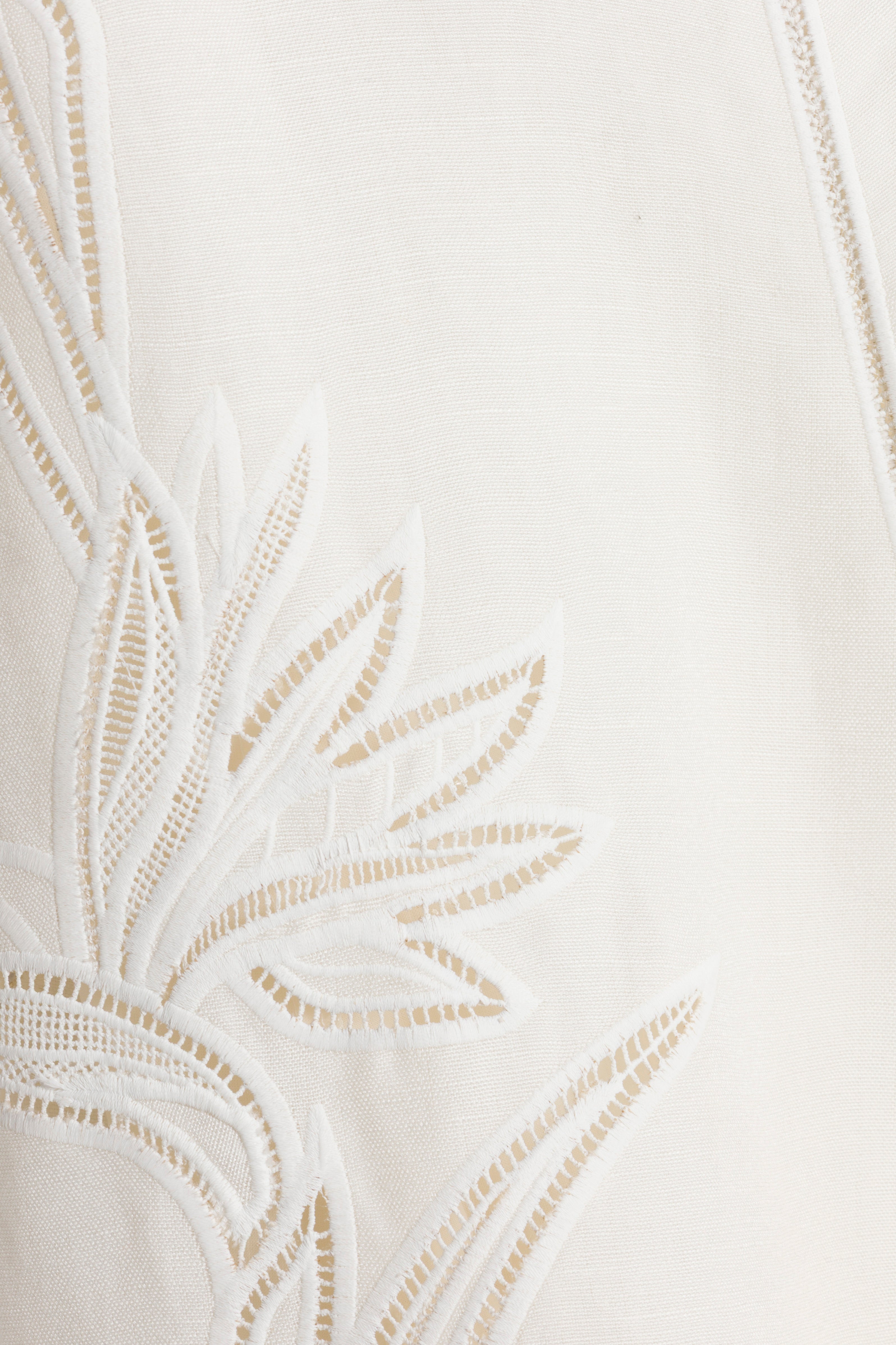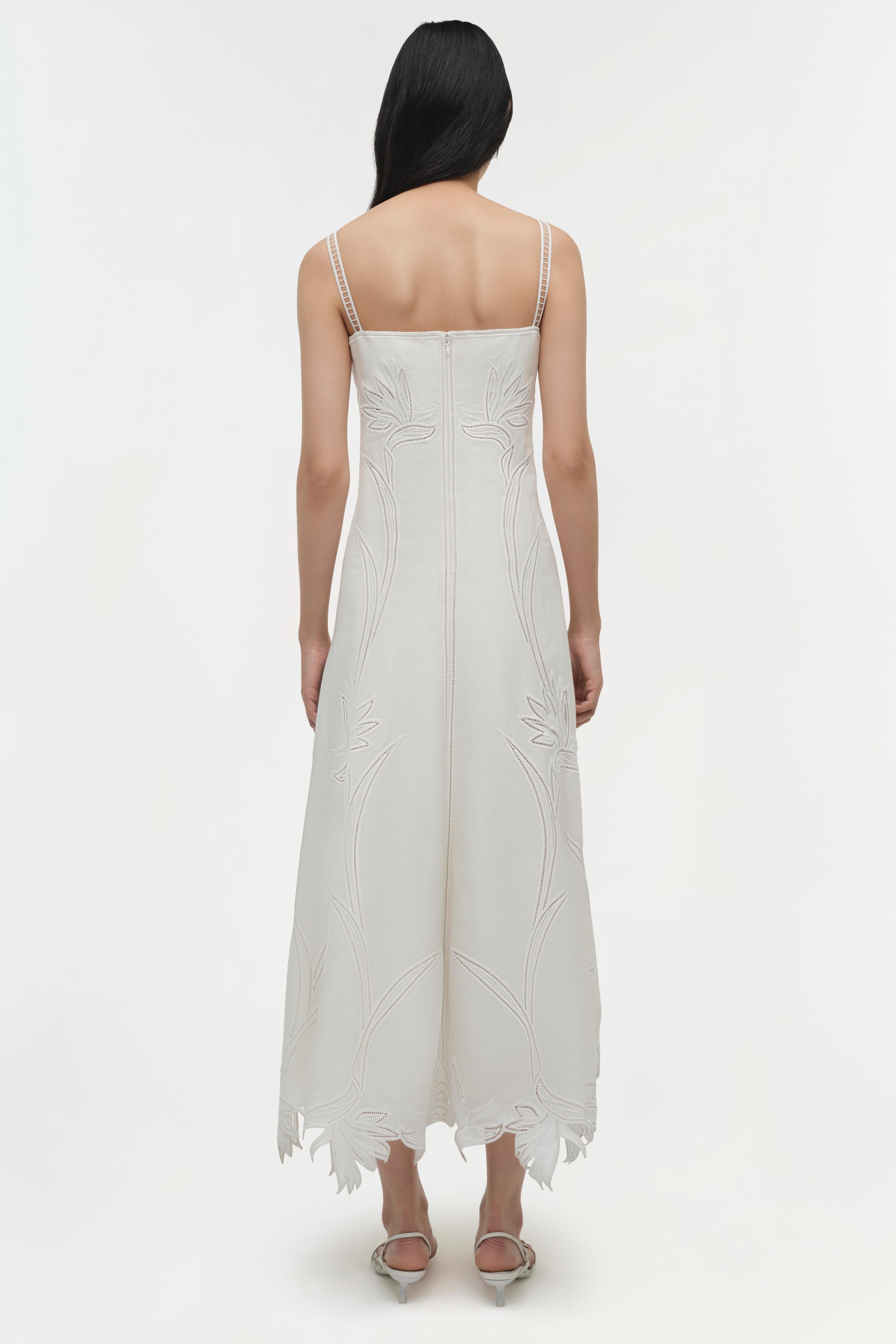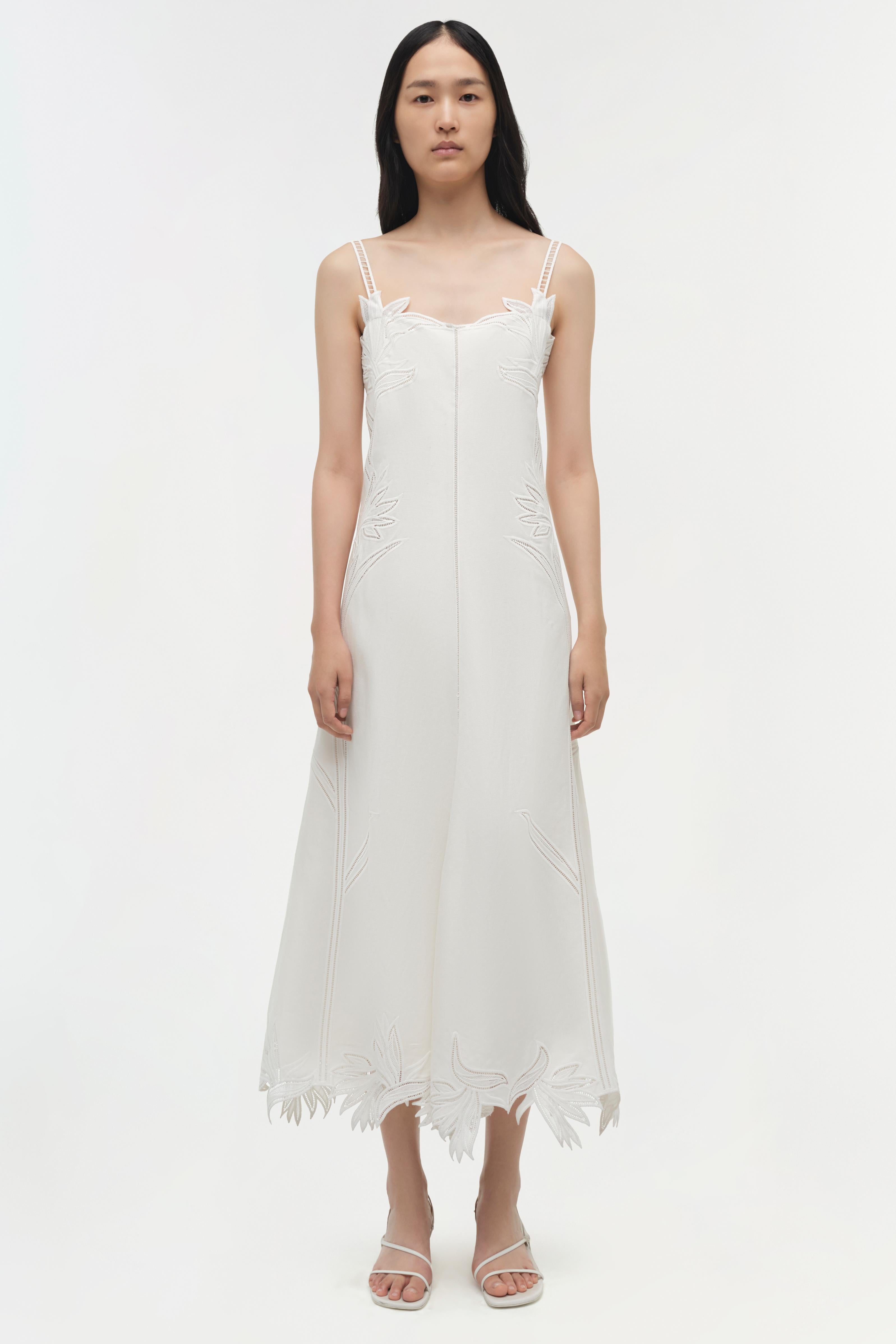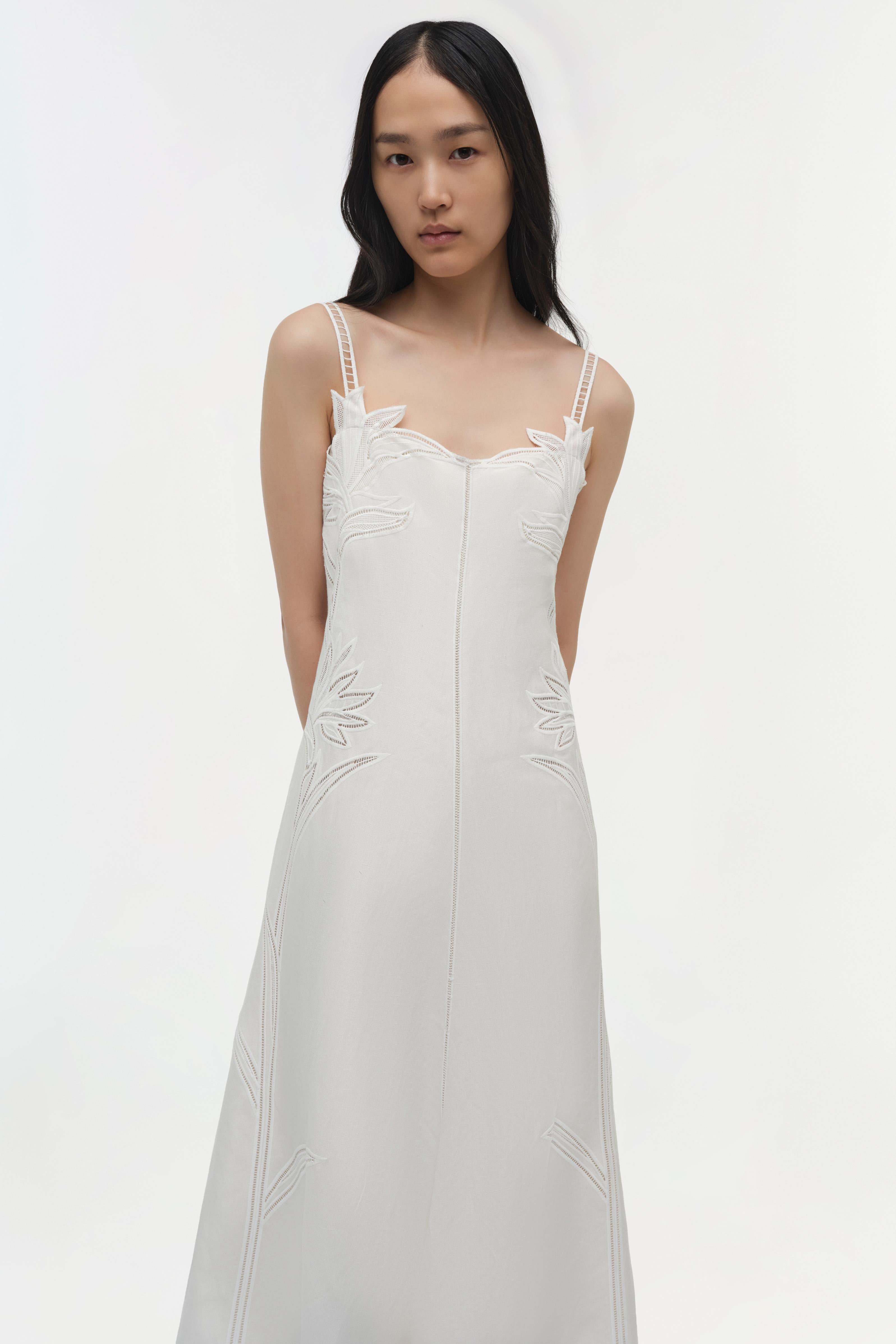 The Ellery Embroidered Bustier Midi Dress in White. This midi dress is cut from linen-blend broderie anglaise and detailed with abstract floral embroidery. A central seam structures the dress while the raw-cut, uneven hem allows fluid movement.