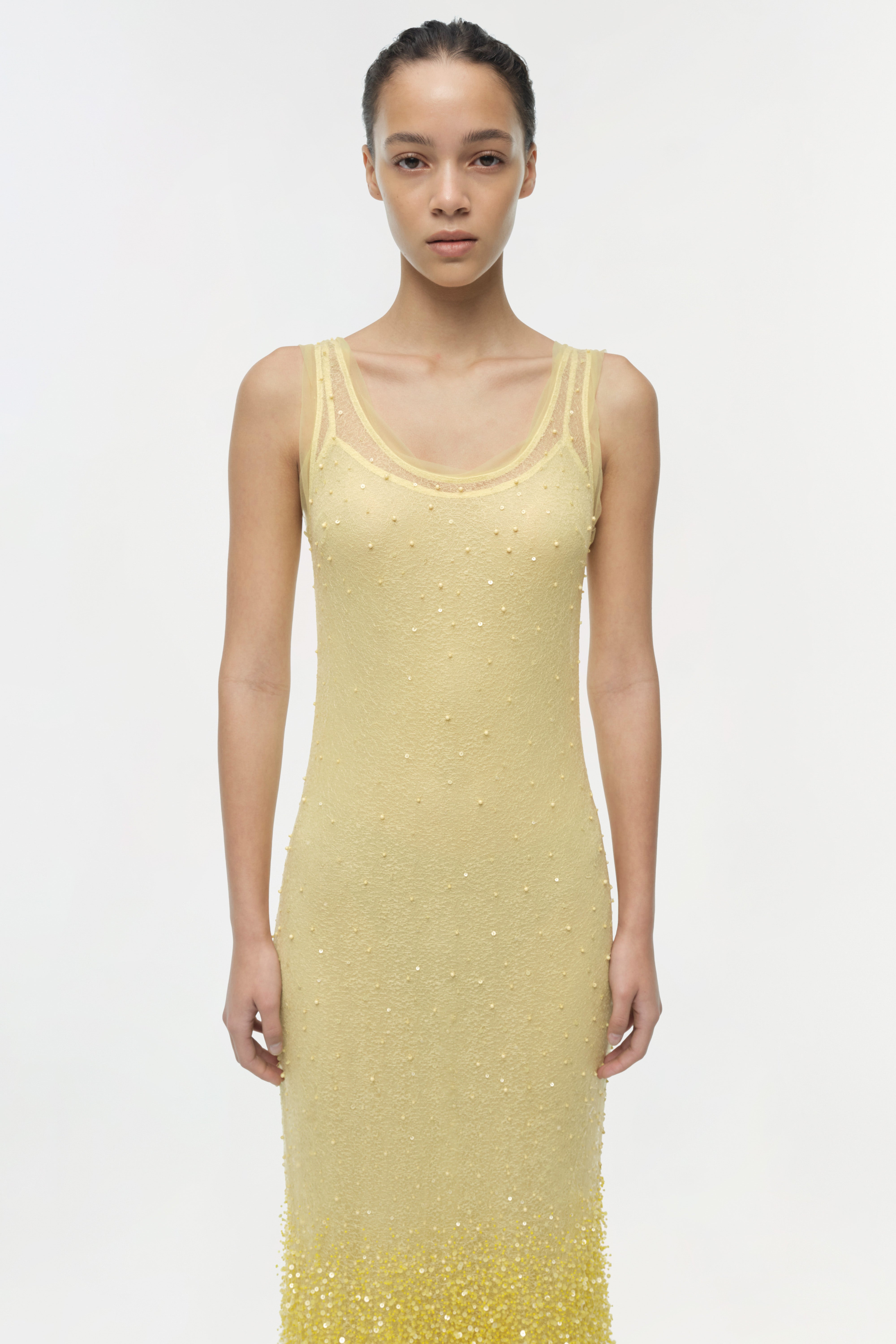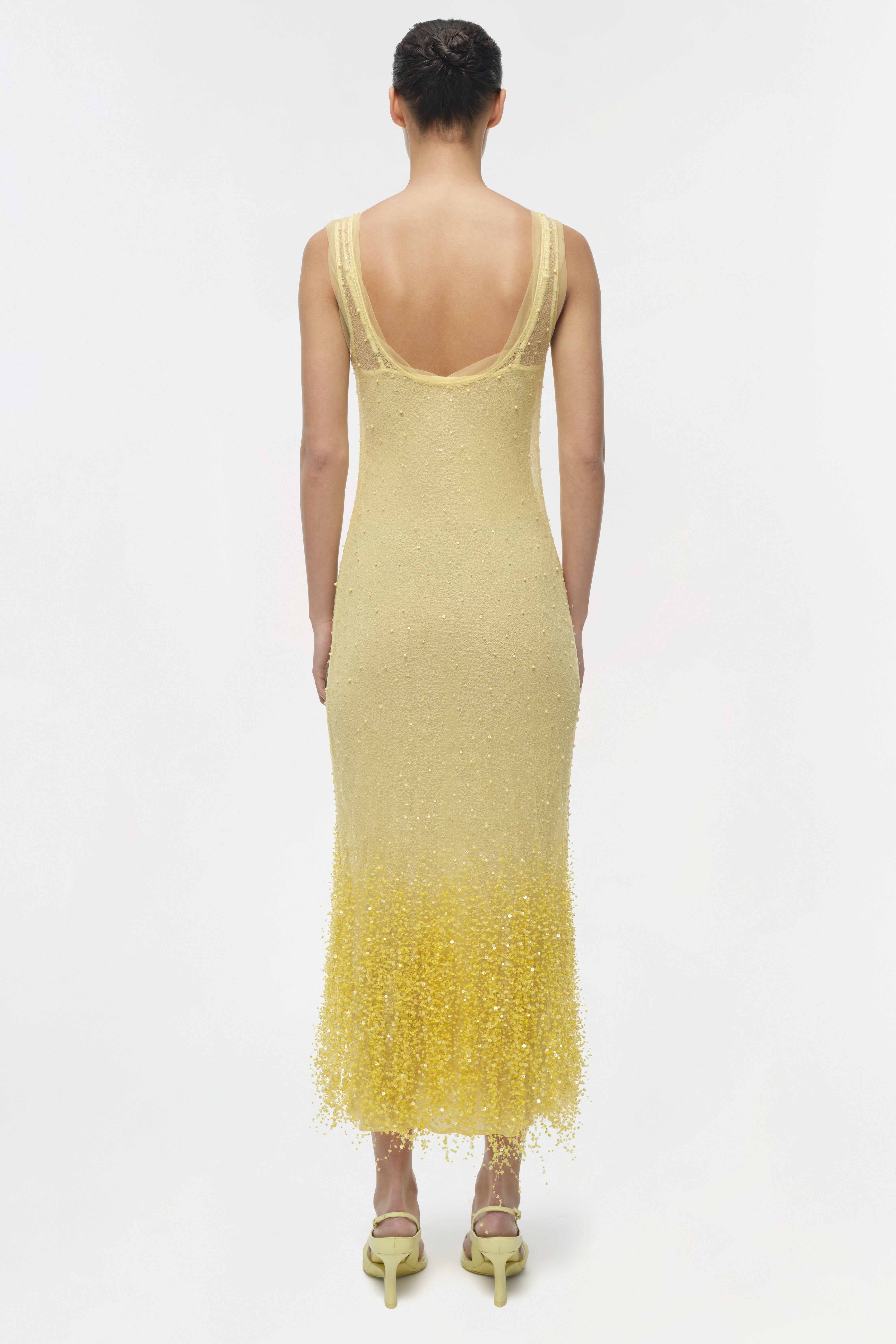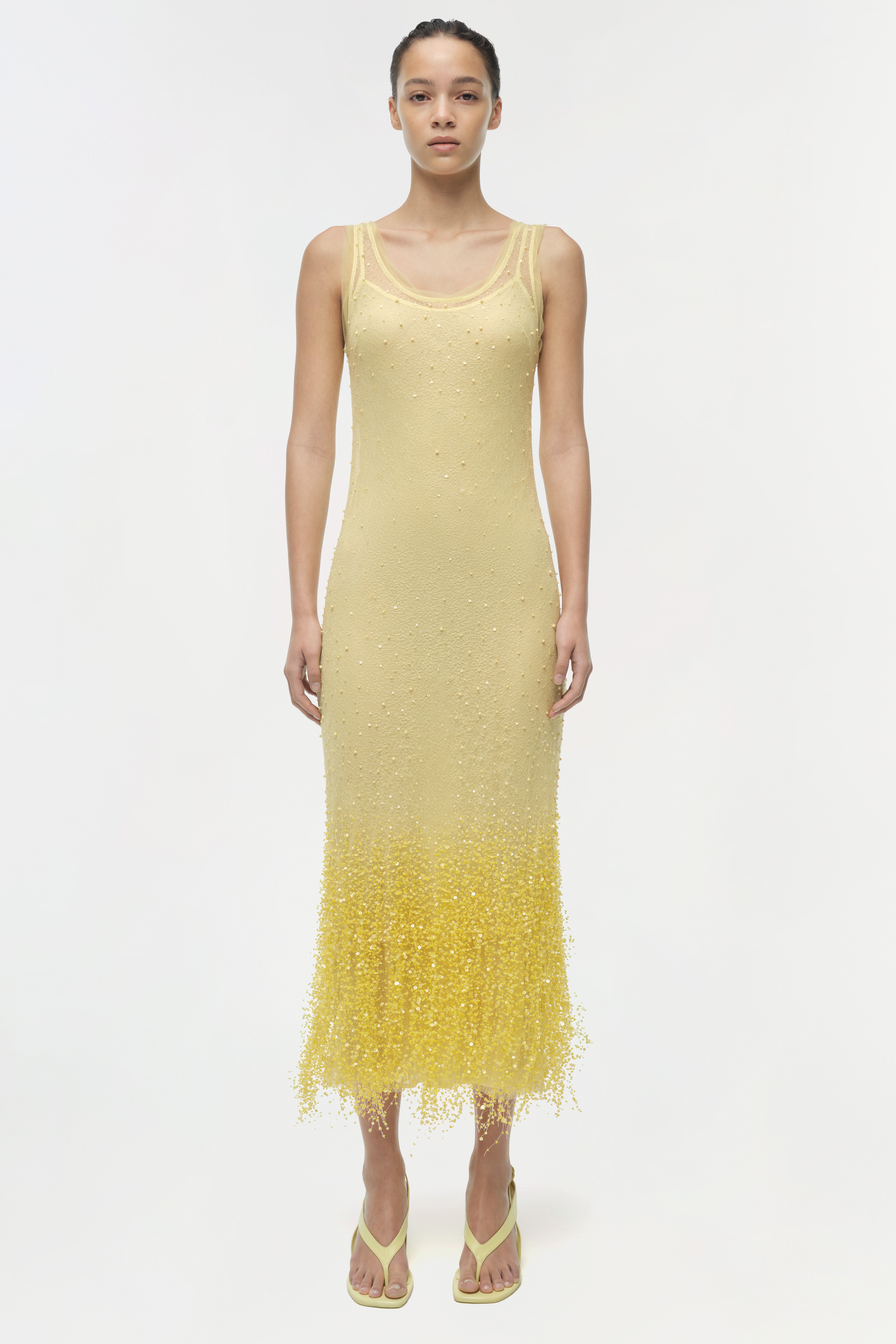 Crafted in sheer lace and adorned with tonal beading throughout. The embellishment deepens toward the hem, forming a nuanced gradient that brings subtle weight and a sense of motion to the silhouette.