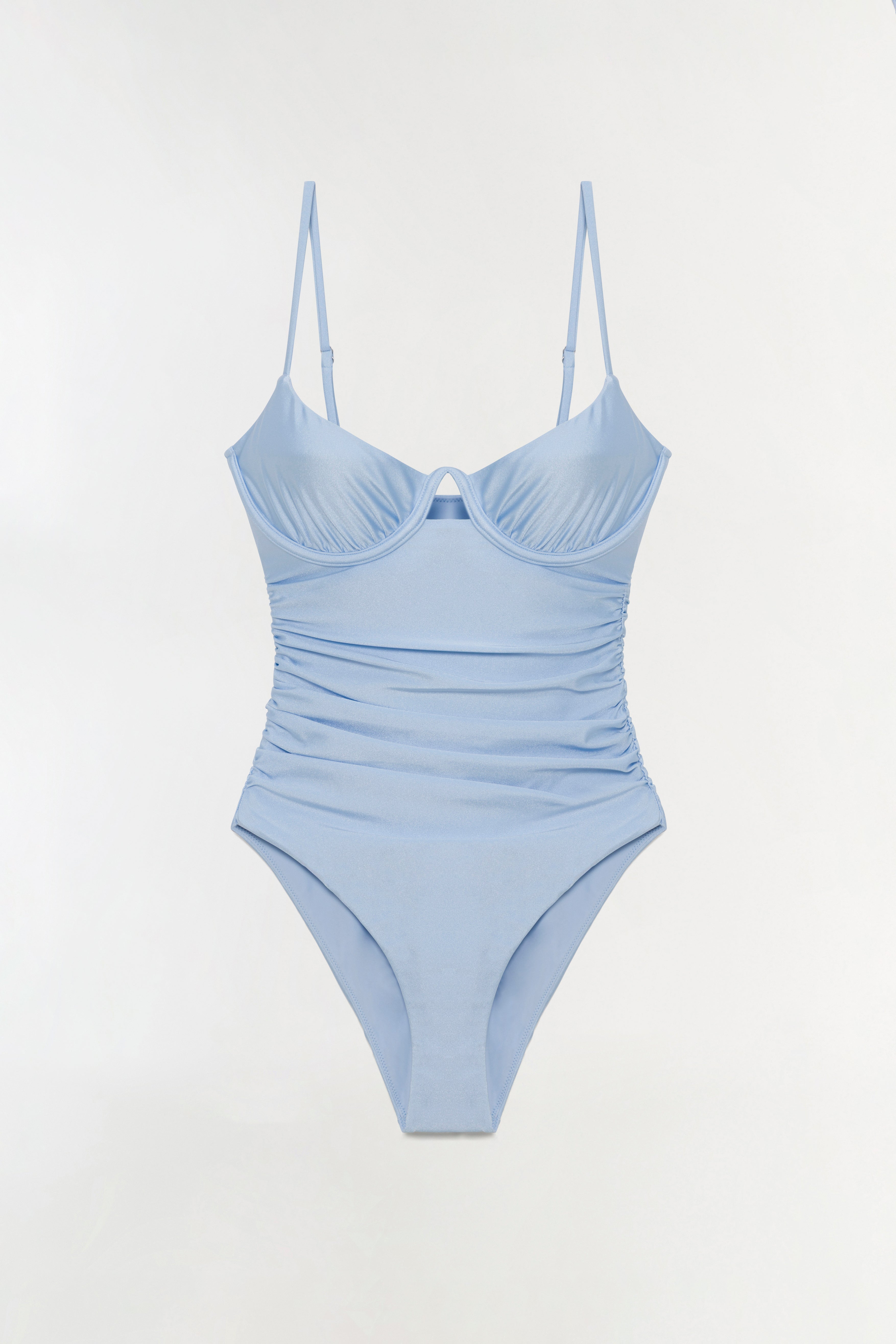 The Laine Ruched One Piece in Tidepool. This one-piece swimsuit is crafted from draped satin and defined by soft ruching that flatters the natural waist. Designed with underwired, ruched cups for support and structure, it creates a sculpted silhouette.