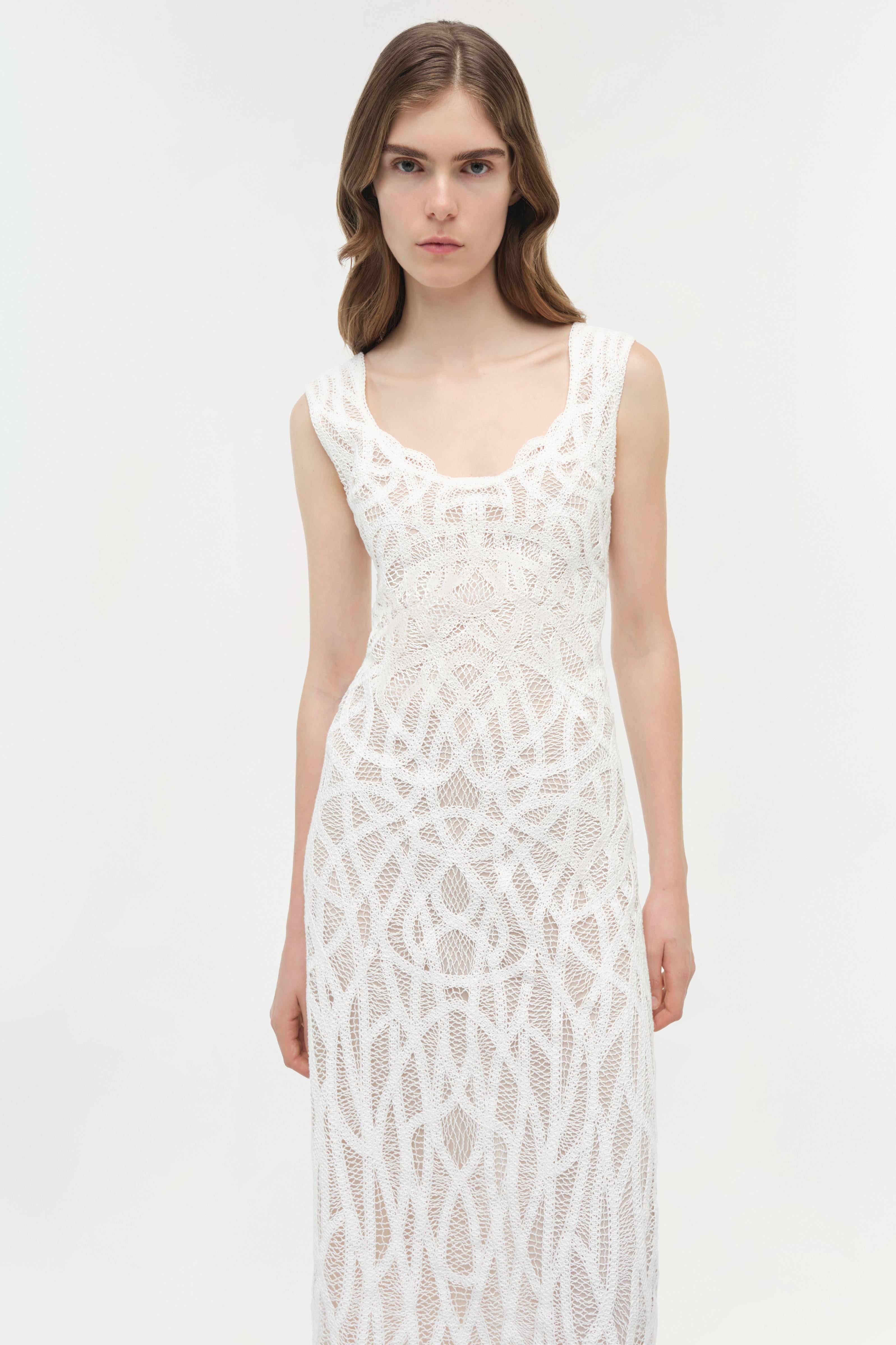 The Leonora Macrame Midi Dress in White. Crafted in botanical macramé embroidery, this strapless midi dress balances structure with sleek elegance. Soft scalloped edges frame the neckline, while precise detailing defines the silhouette for a meticulously constructed design.