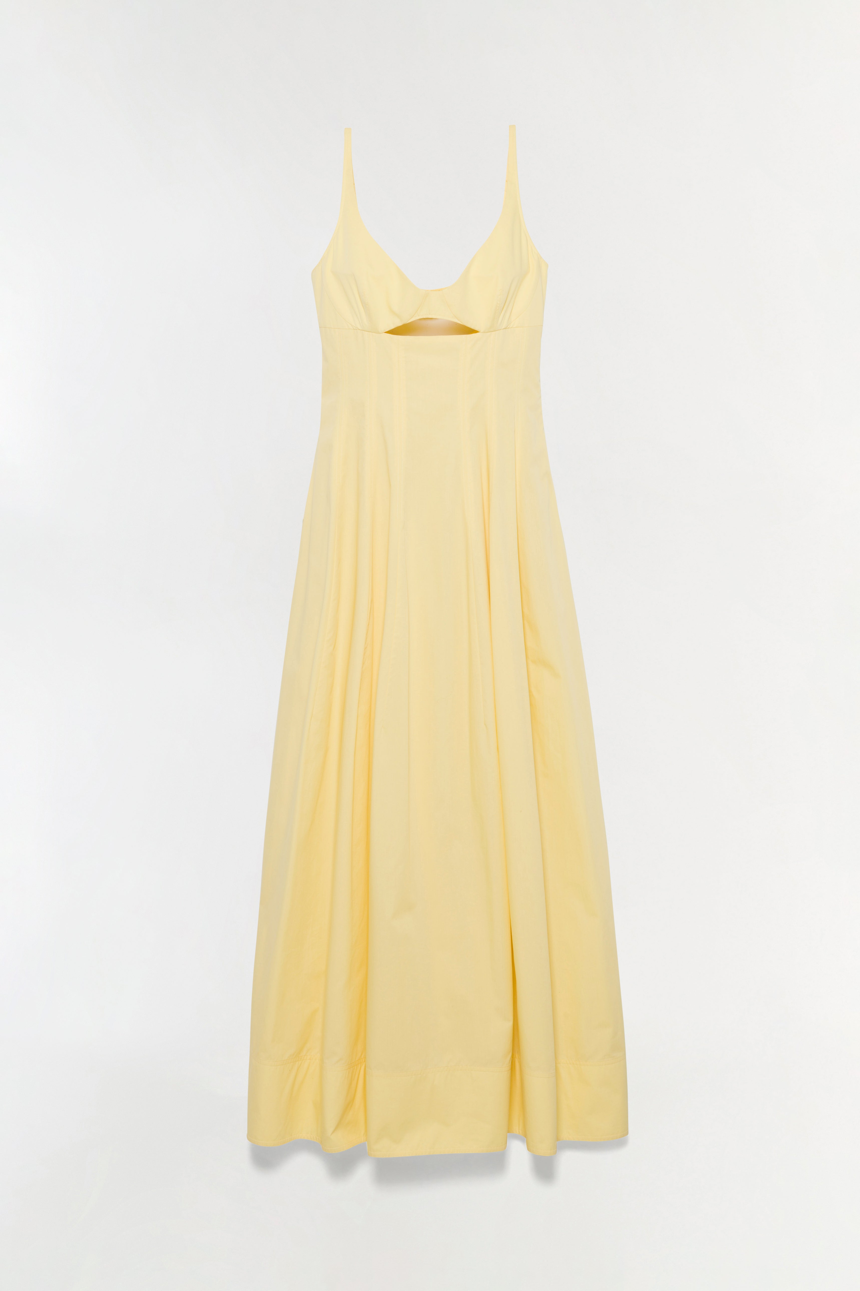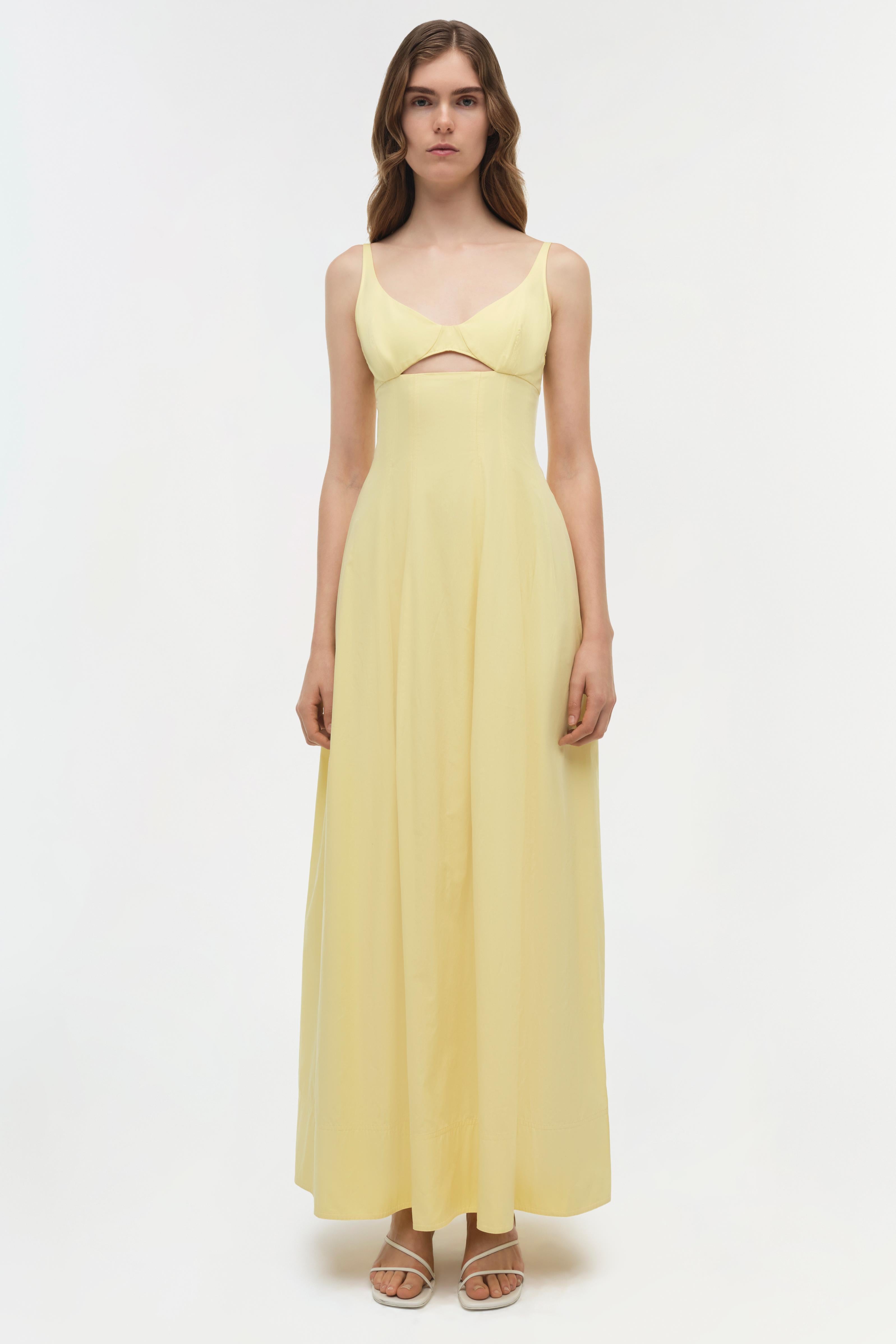 The Maddy Cotton Midi Dress in Buttercream. This midi dress is cut from cotton poplin and designed with a structured bodice, a refined cutout and a softly pleated skirt.