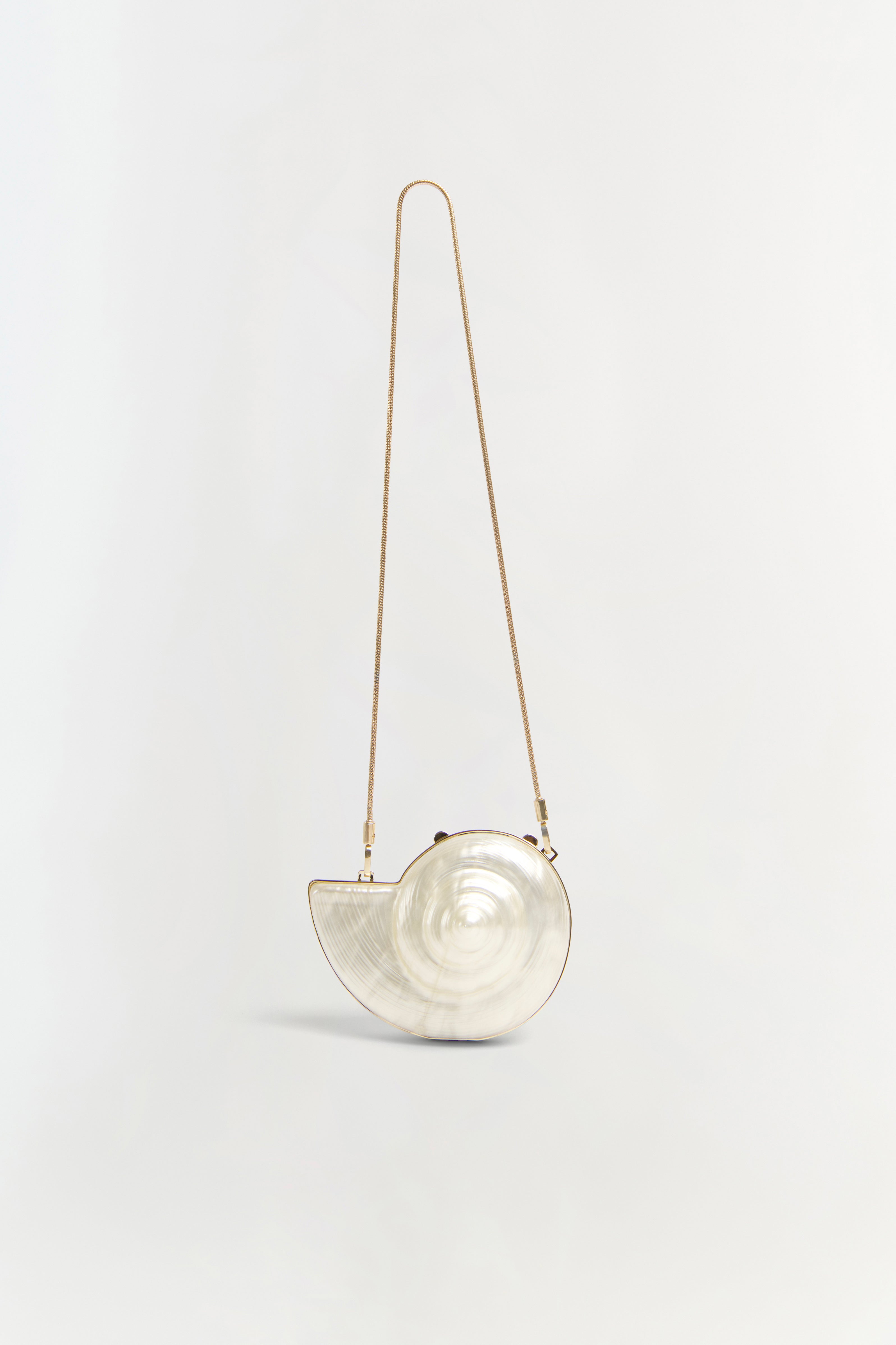 A luminous clutch that captures the spirit of the sea in an iconic spiral silhouette. Its glossy shell-like exterior is trimmed with polished metal and opens to a compact interior with a magnetic clasp. Finished with a detachable chain strap, it transitions seamlessly between statement piece and evening essential.