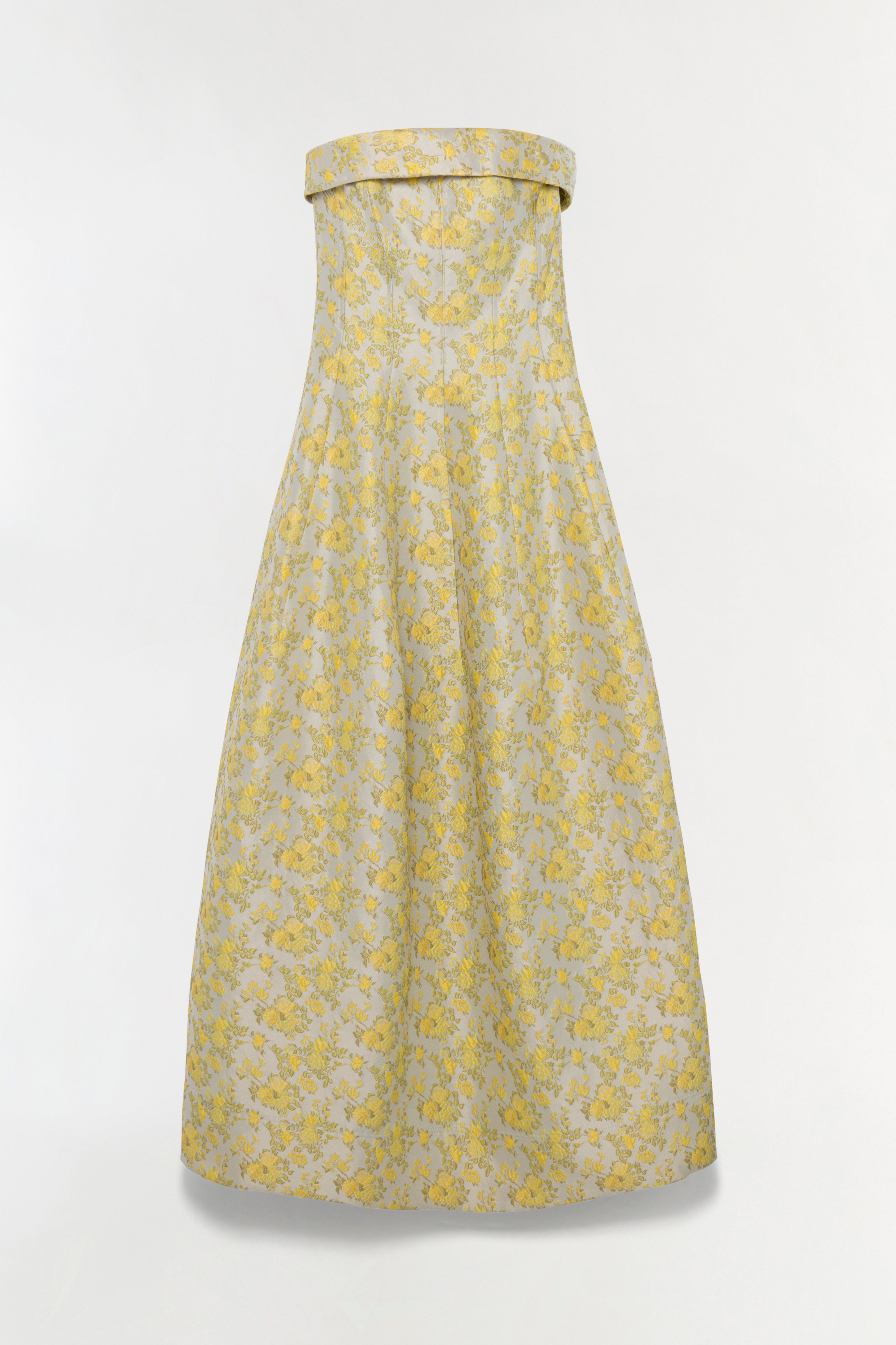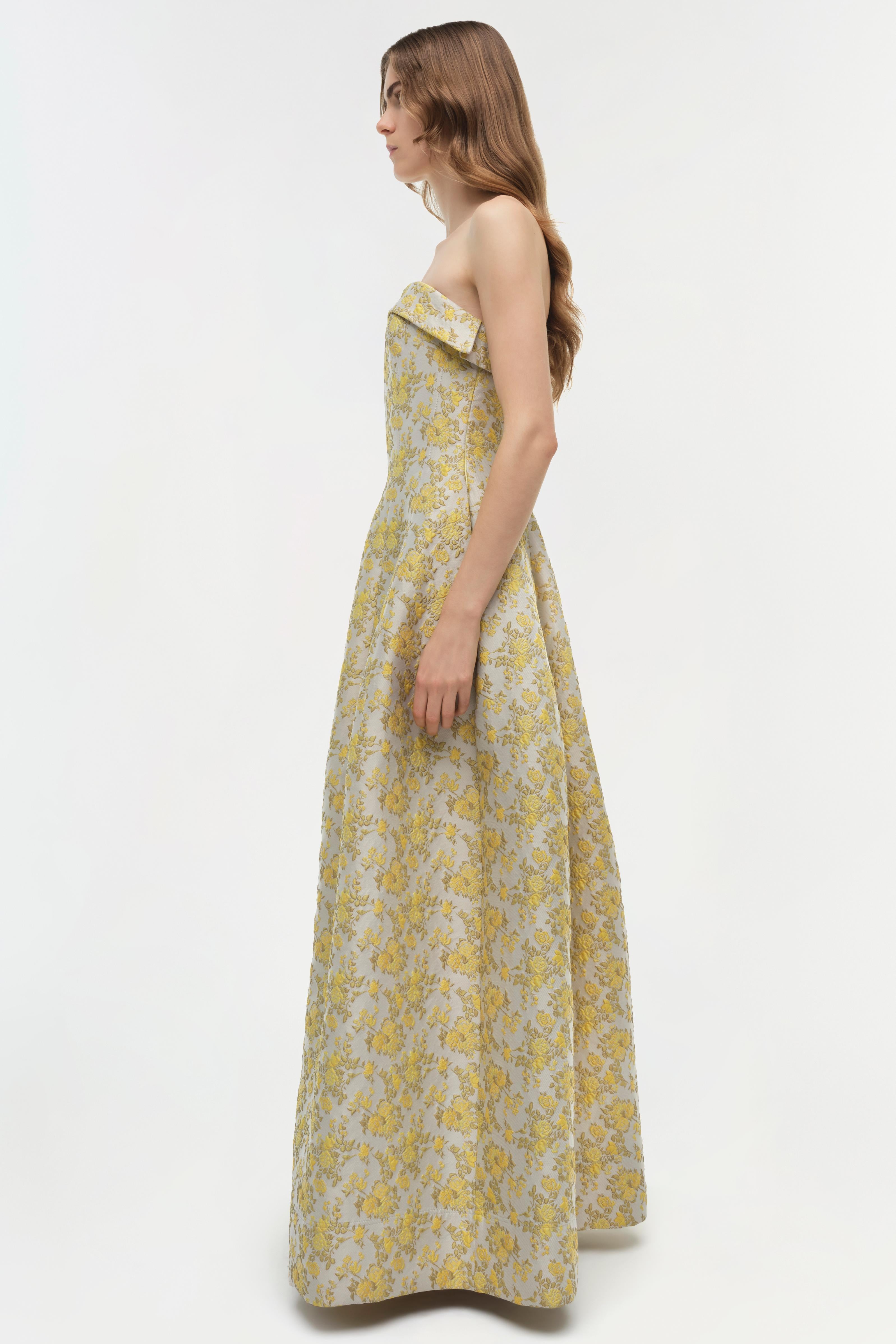 The Octavia Jacquard Strapless Gown in Buttercream. This strapless dress features an exquisite floral jacquard design, creating a striking blend of texture and pattern. Its sculpted silhouette and detailed craftsmanship lend a timeless elegance and sophisticated appeal to the overall look.