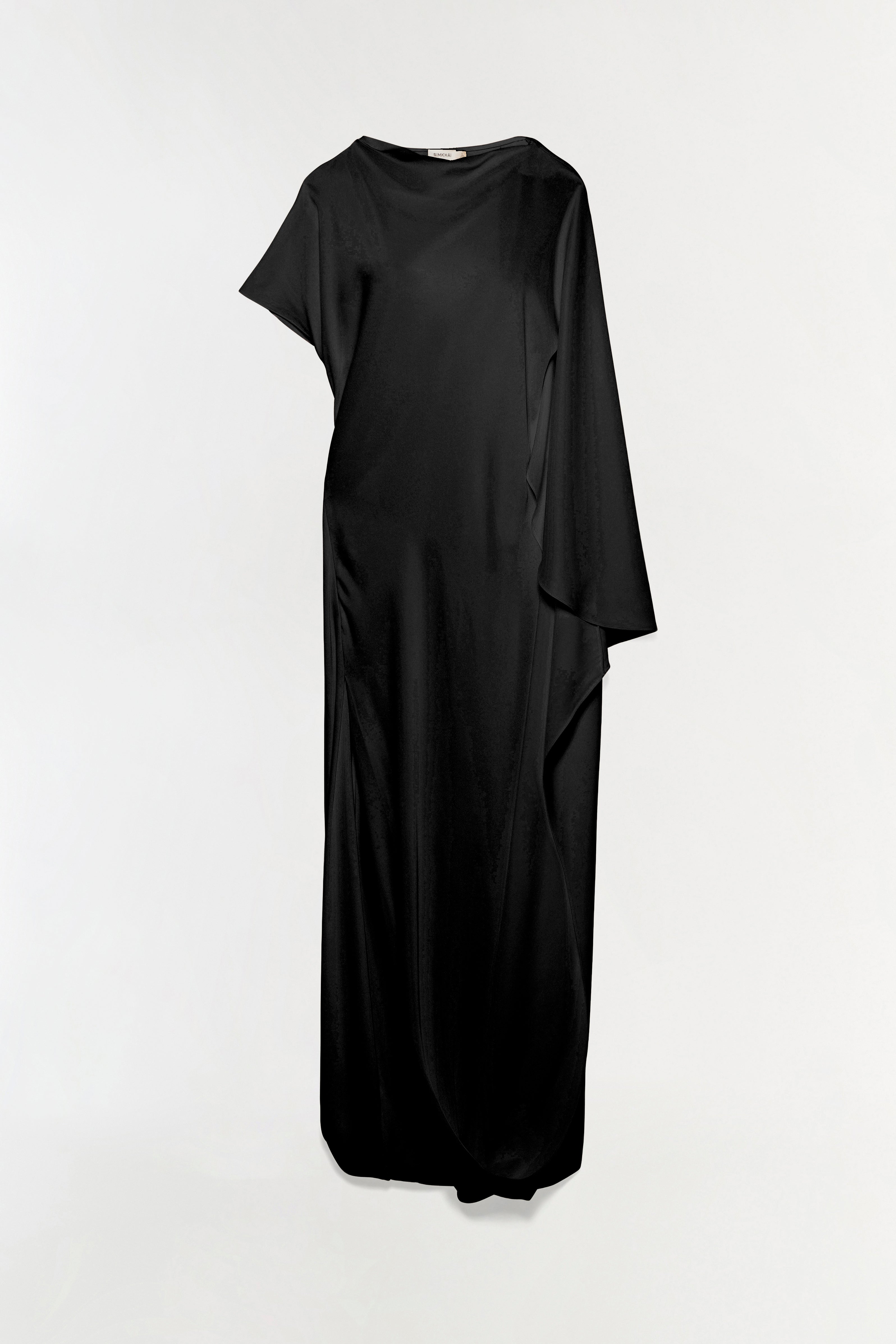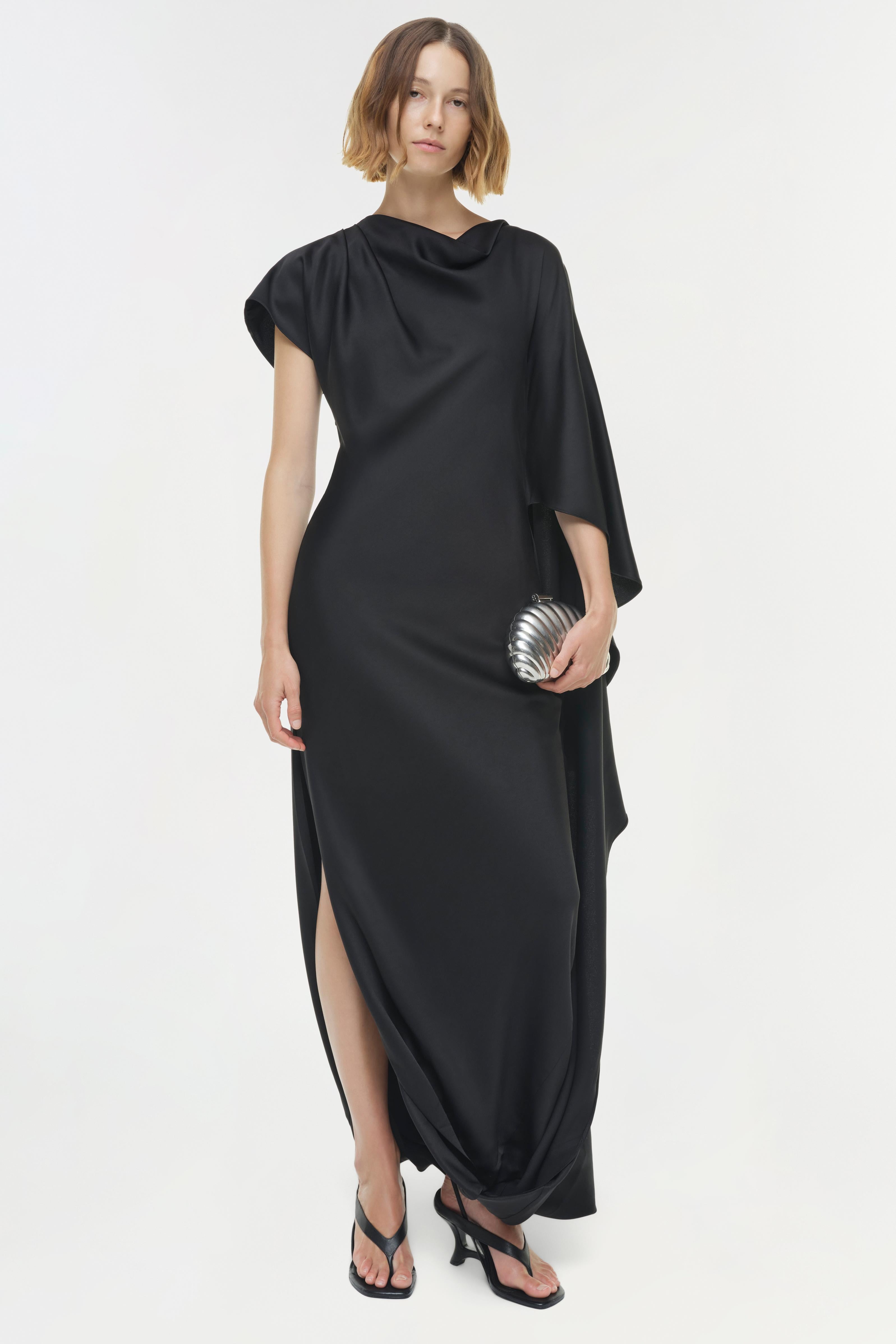 The Ora Satin Gown in Black. This woven satin gown features an asymmetrical long sleeve, with cascading folds that form a striking, cape-like silhouette from shoulder to hem. This dress combines movement with statuesque presence.