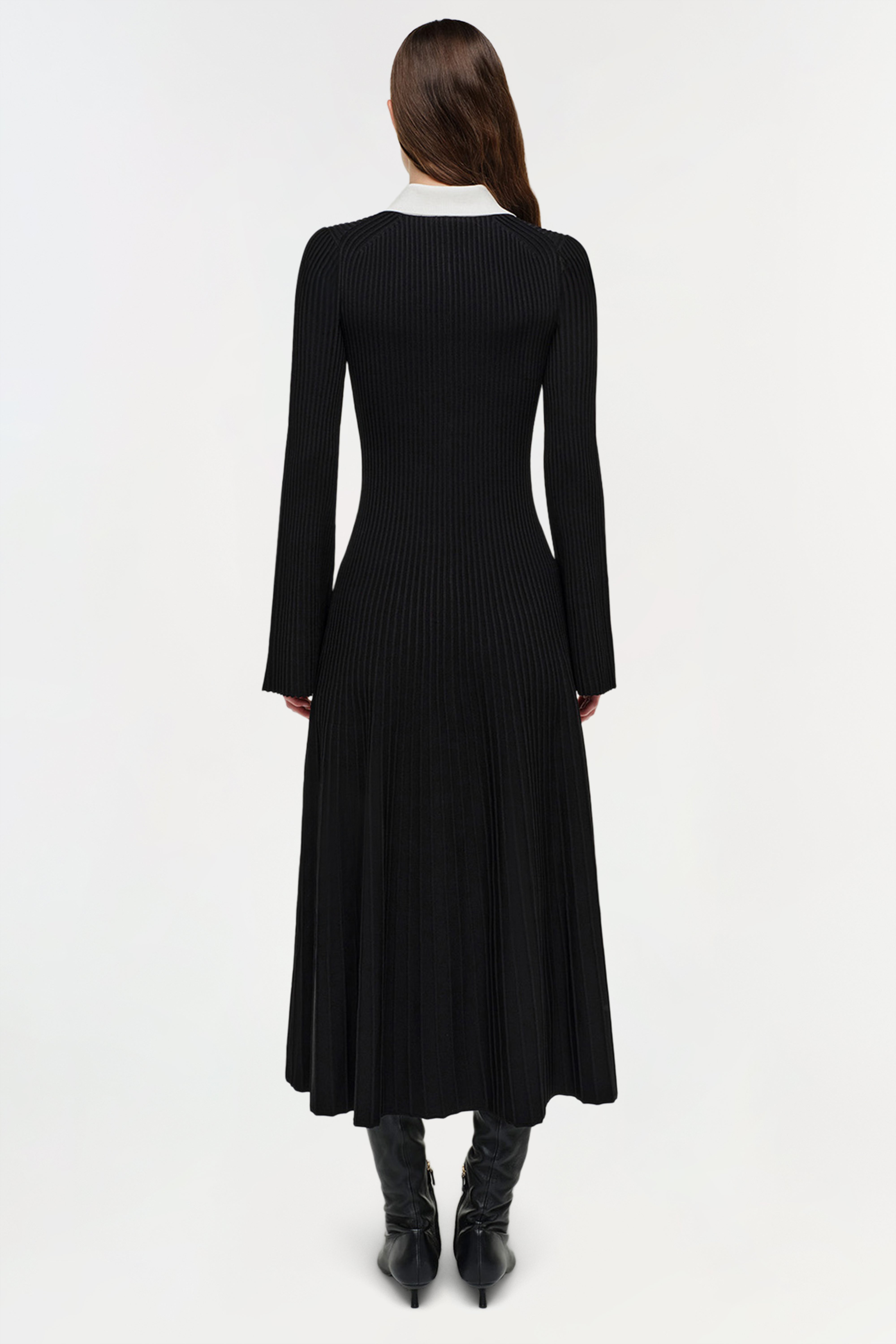 A ribbed knit midi dress that combines structure and softness, framed with an ivory collar and finished with golden buttons. Its fitted bodice flows into a flared, skirt that lends a sense of movement and grace. Refined accents underscore a silhouette of enduring elegance.