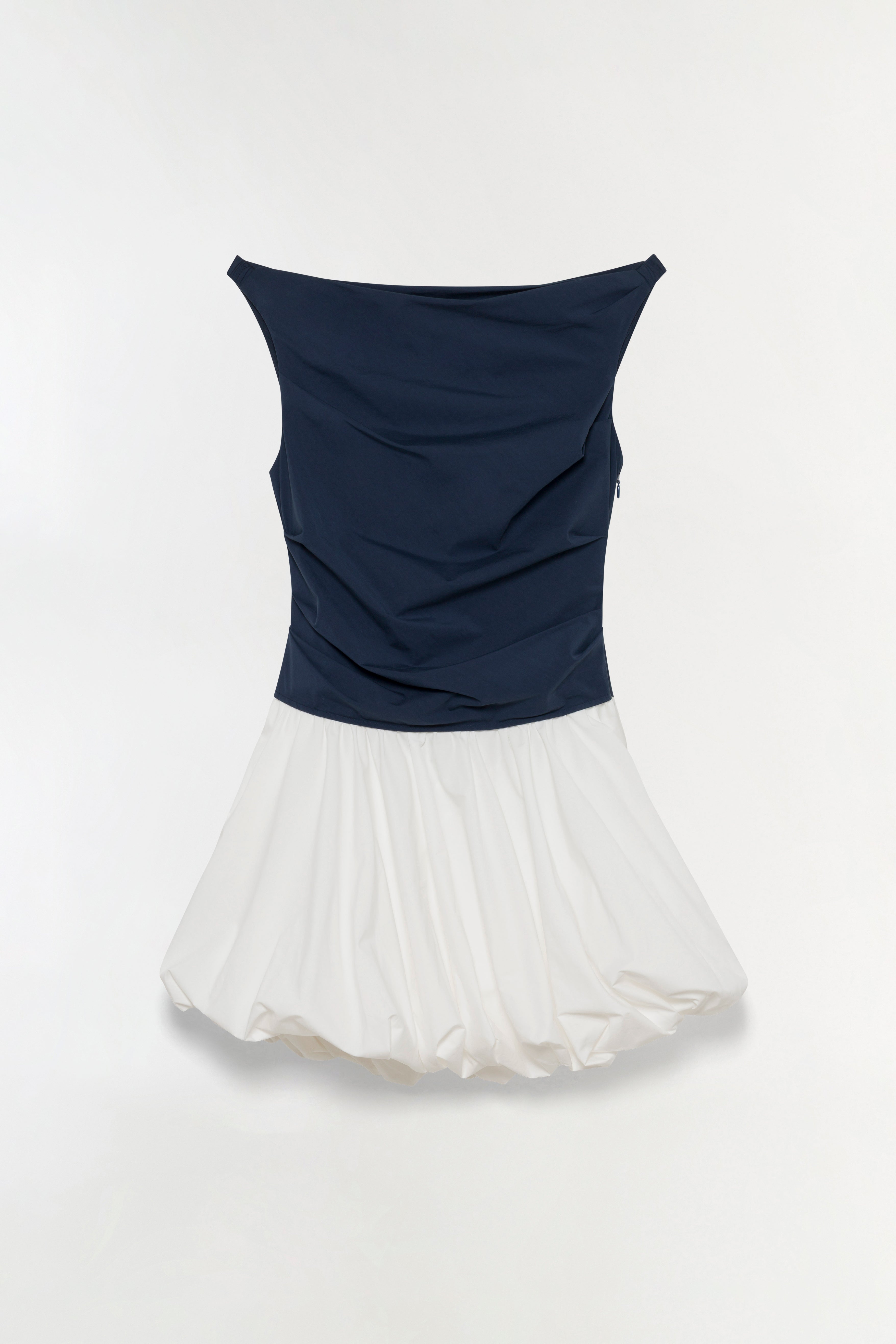 The Salina Bubble Mini Dress in Midnight Multi. This bubble mini dress is crafted from crisp cotton poplin and designed with a clean boat neckline, a softly ruched bodice and a voluminous skirt.